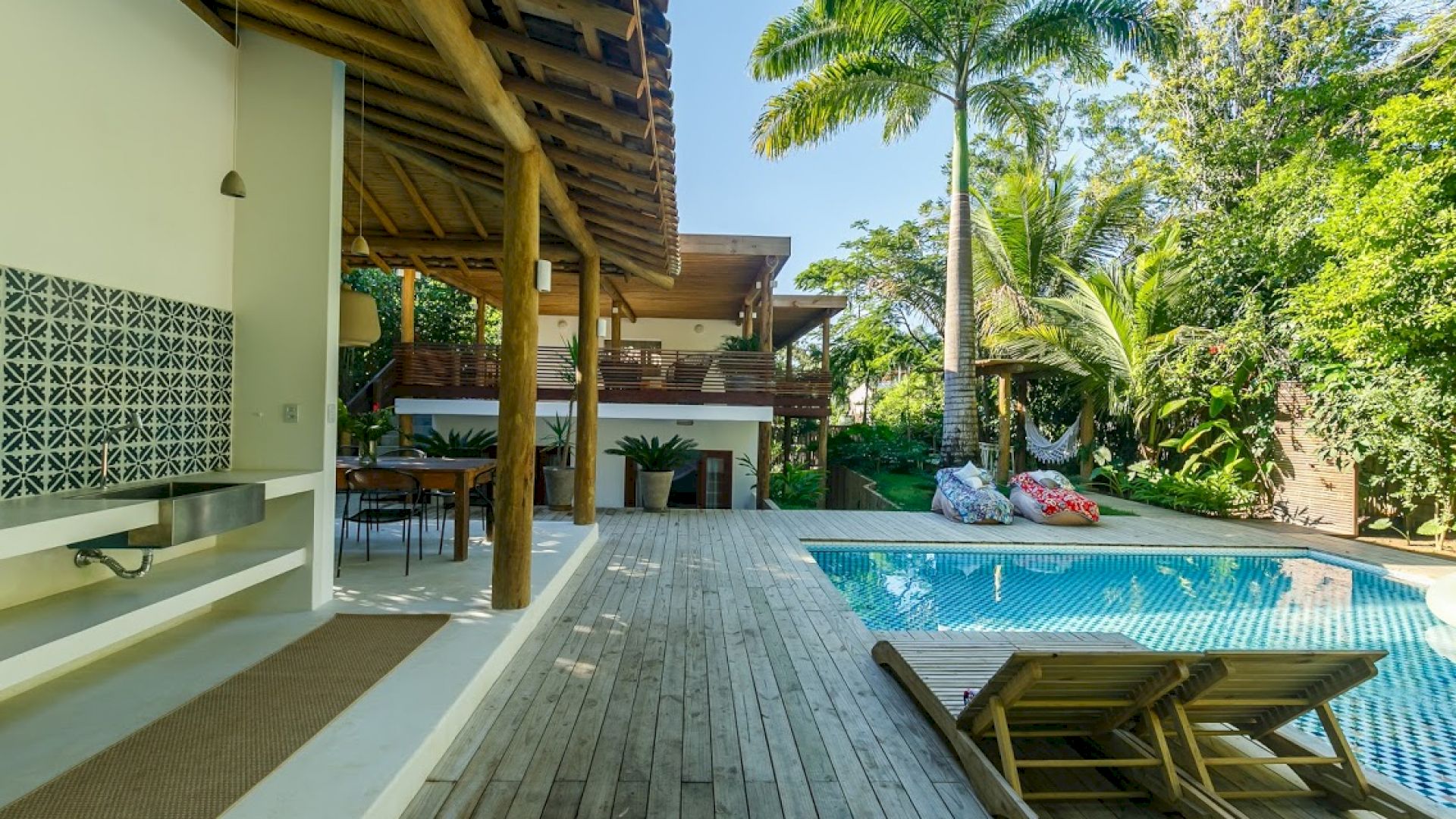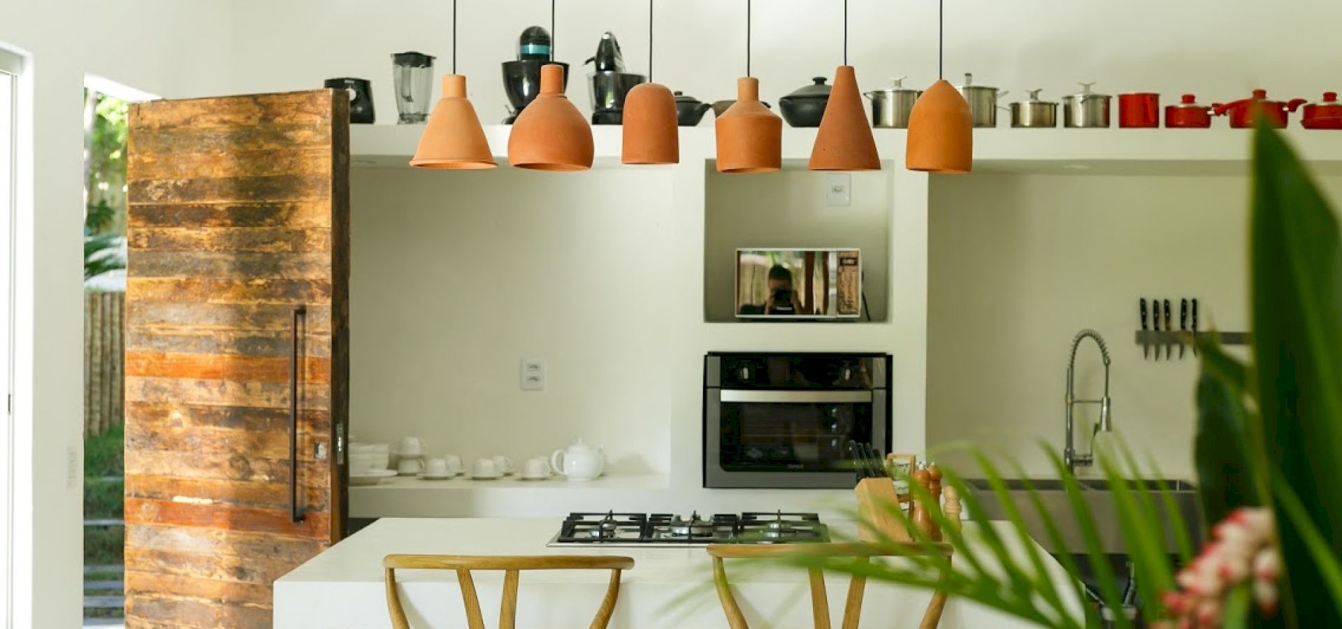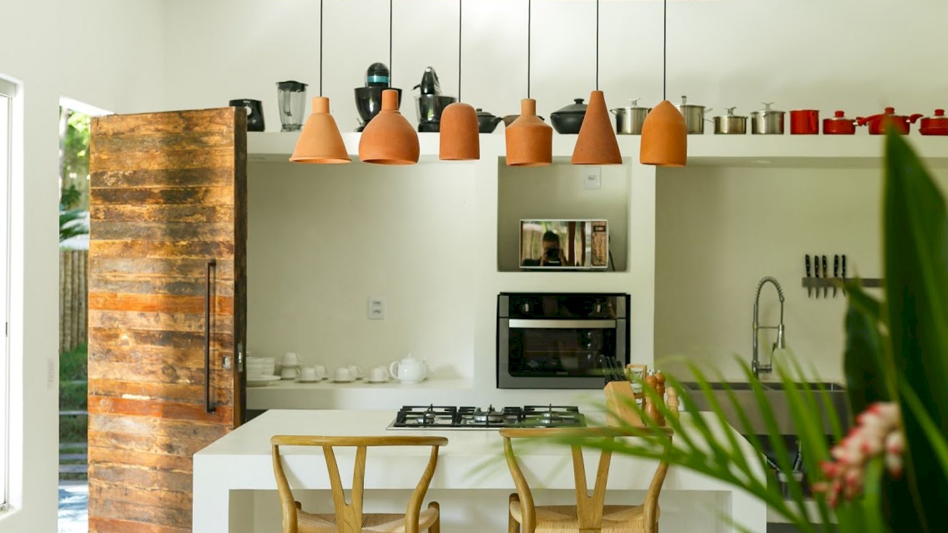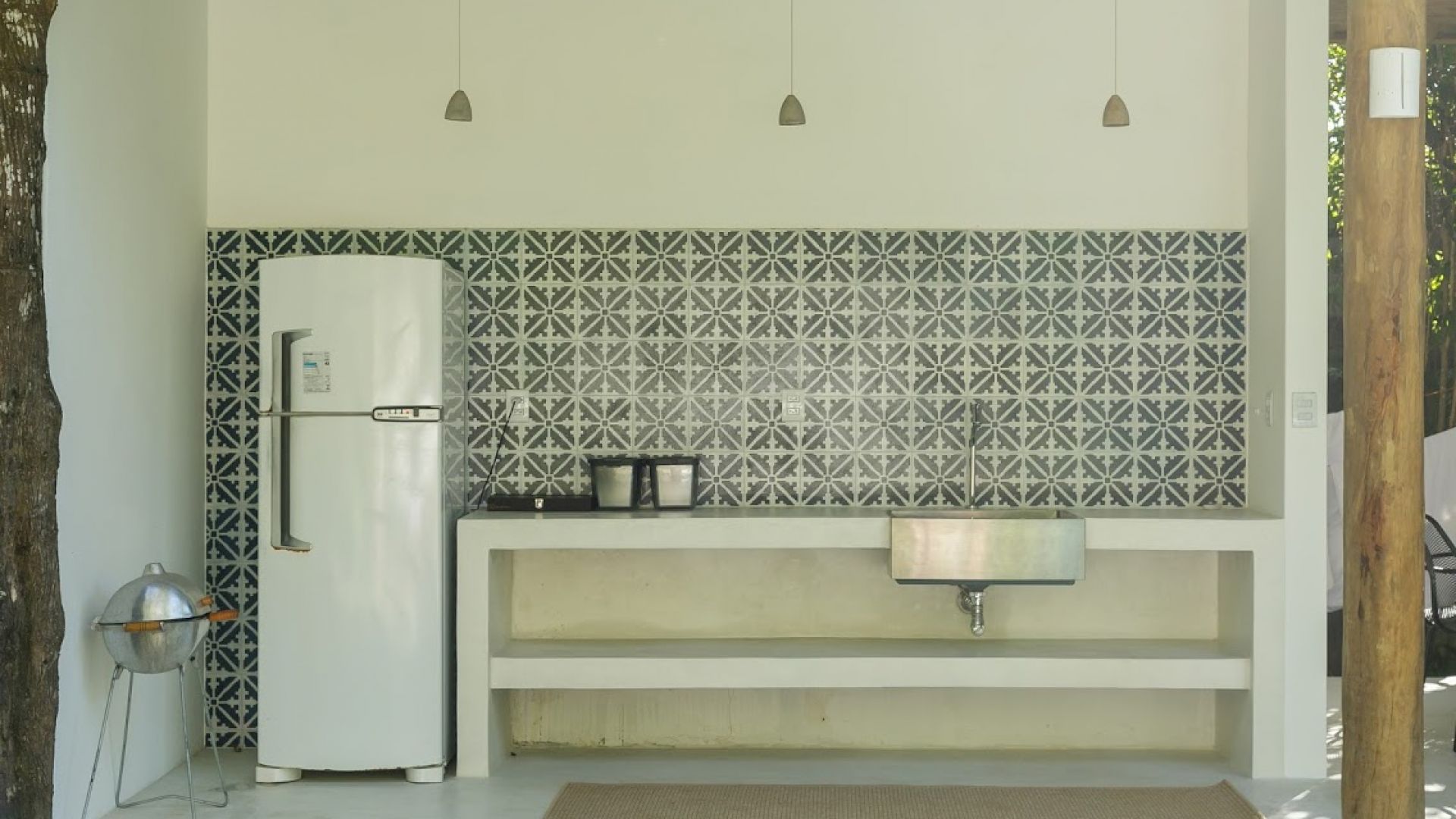 que abraça ela por completo, com uma área lounge de vista para a piscina. Cozinha
