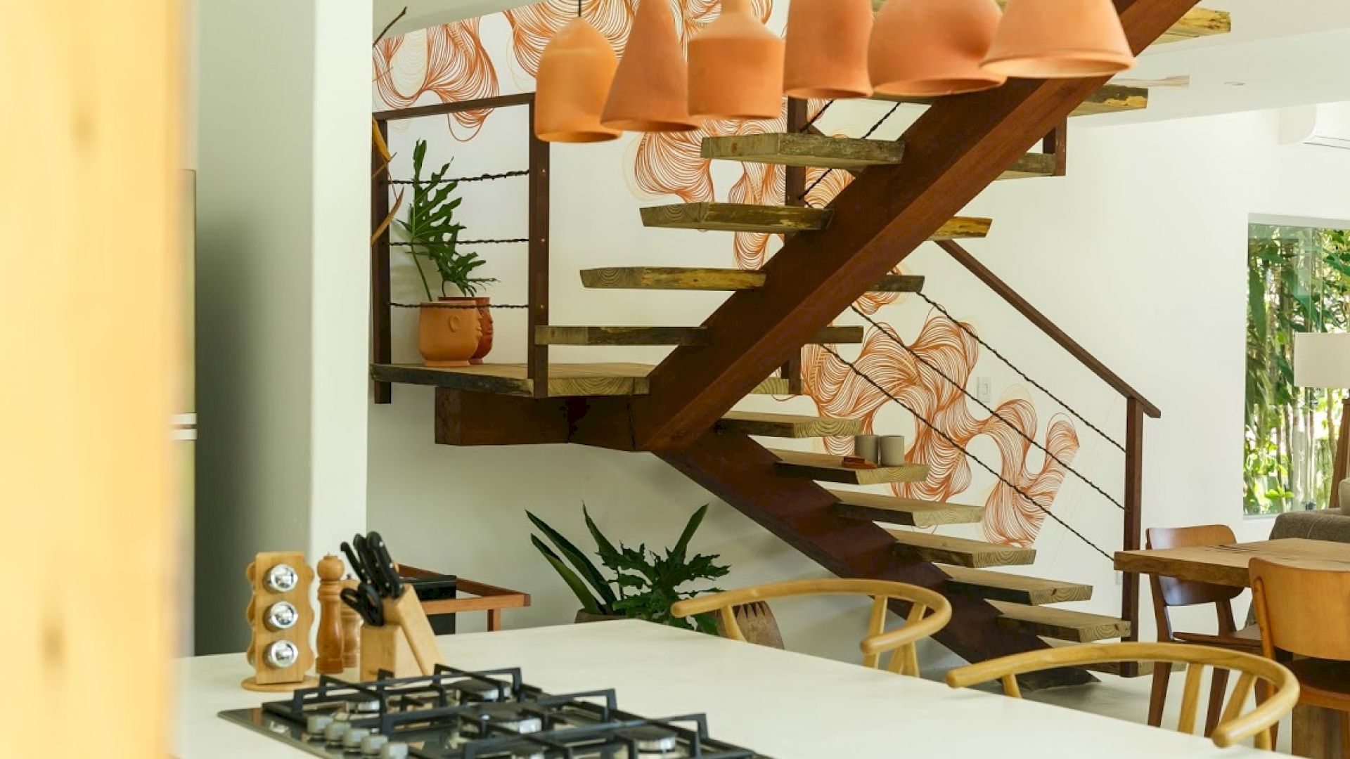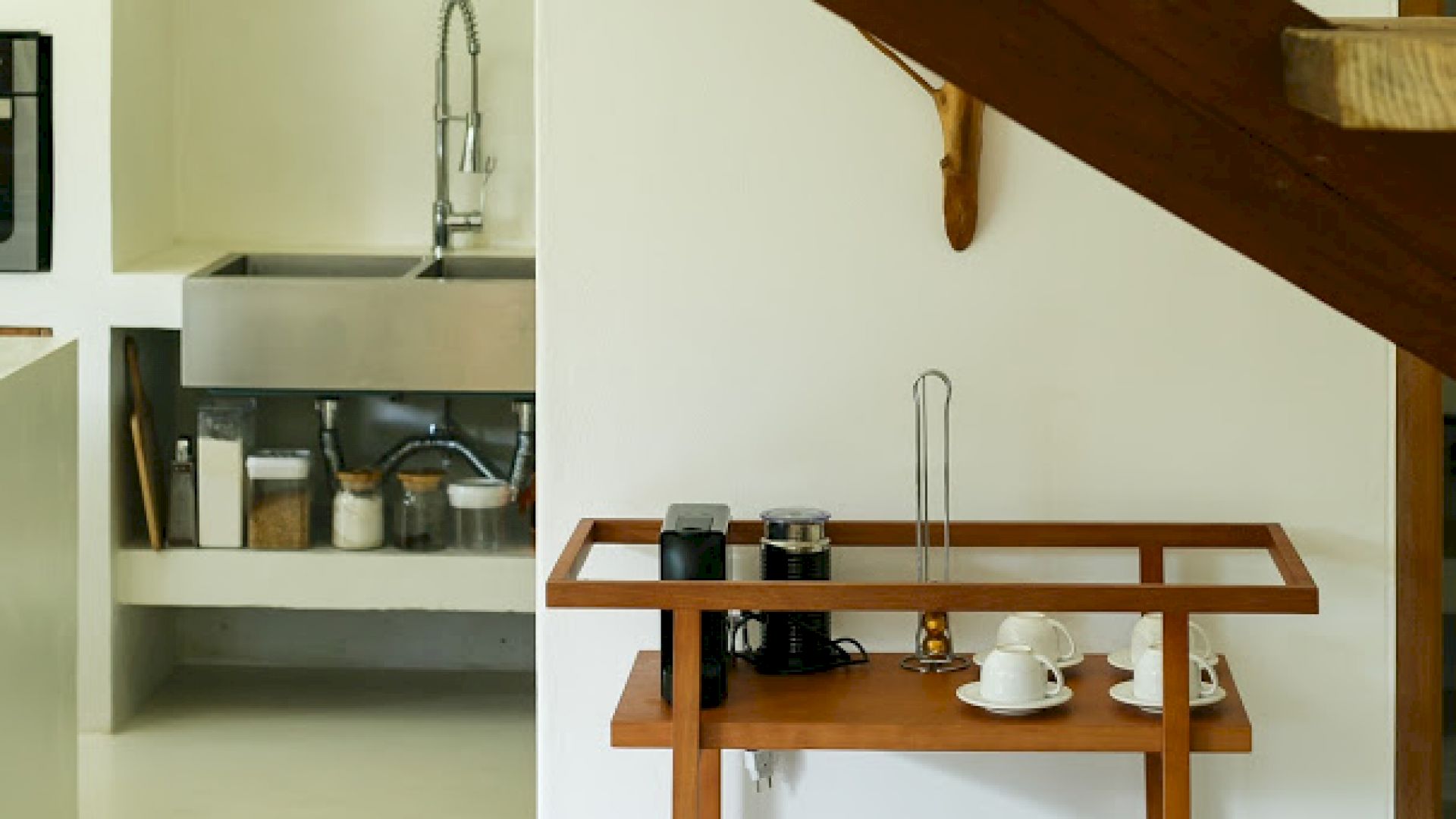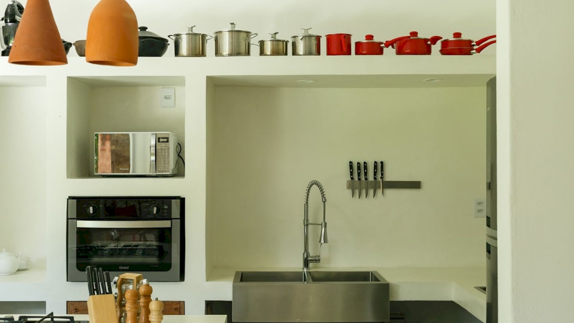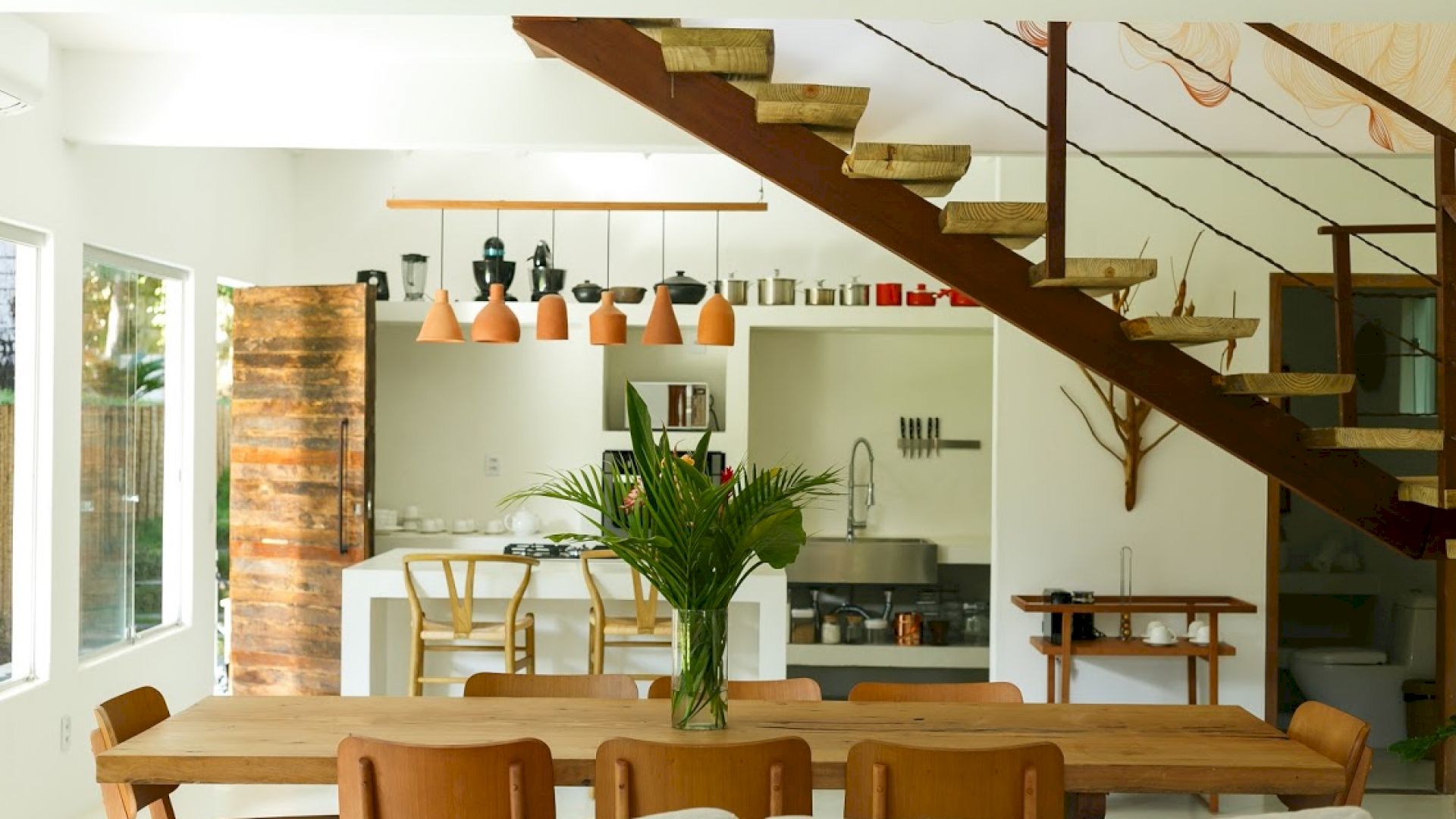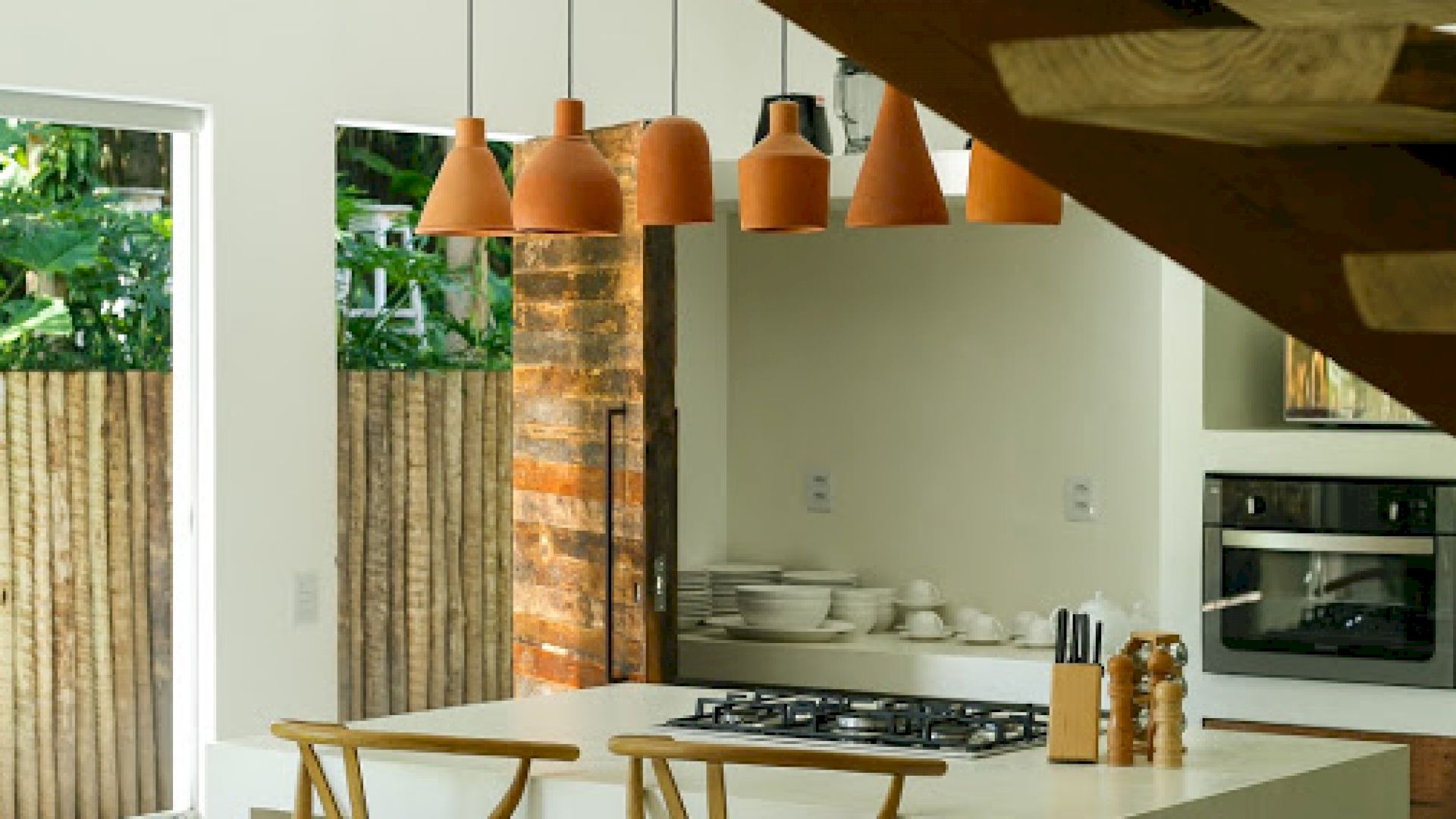 que abraça ela por completo, com uma área lounge de vista para a piscina. Cozinha