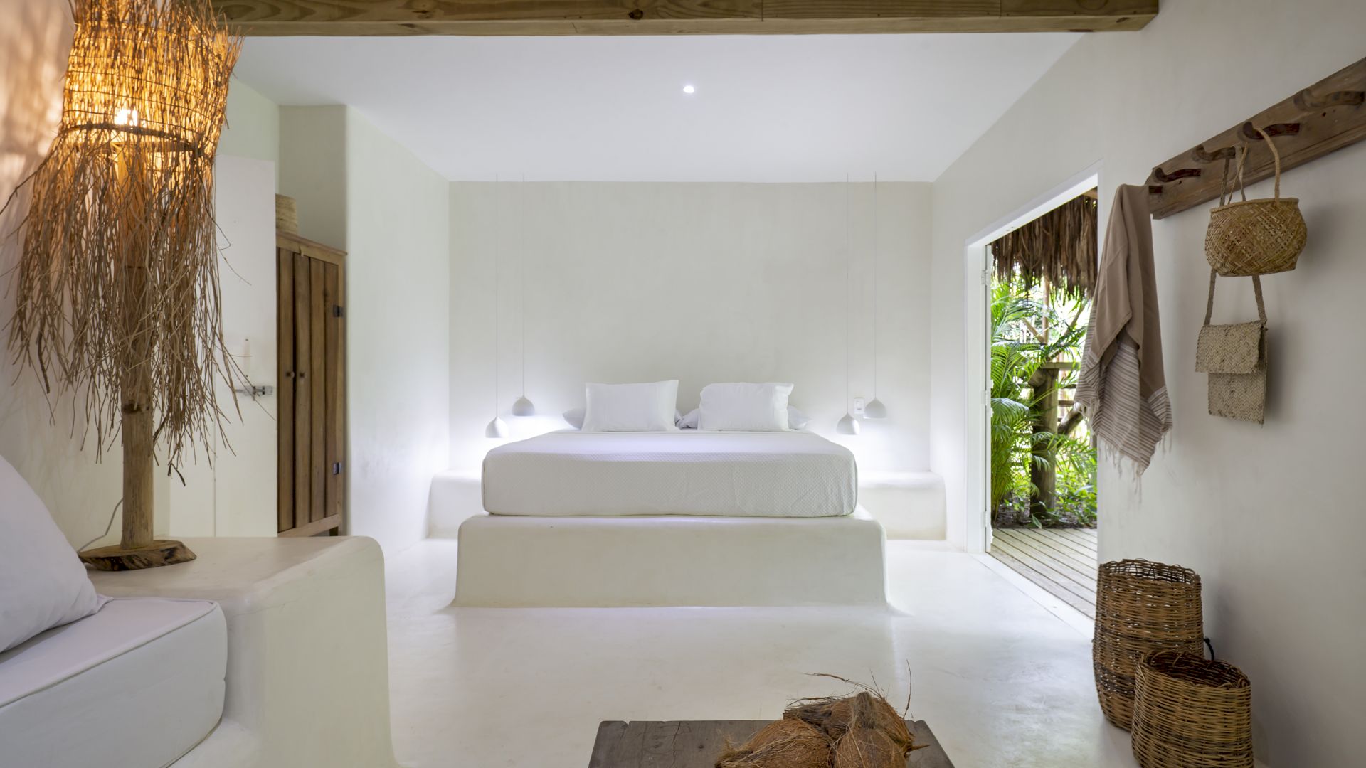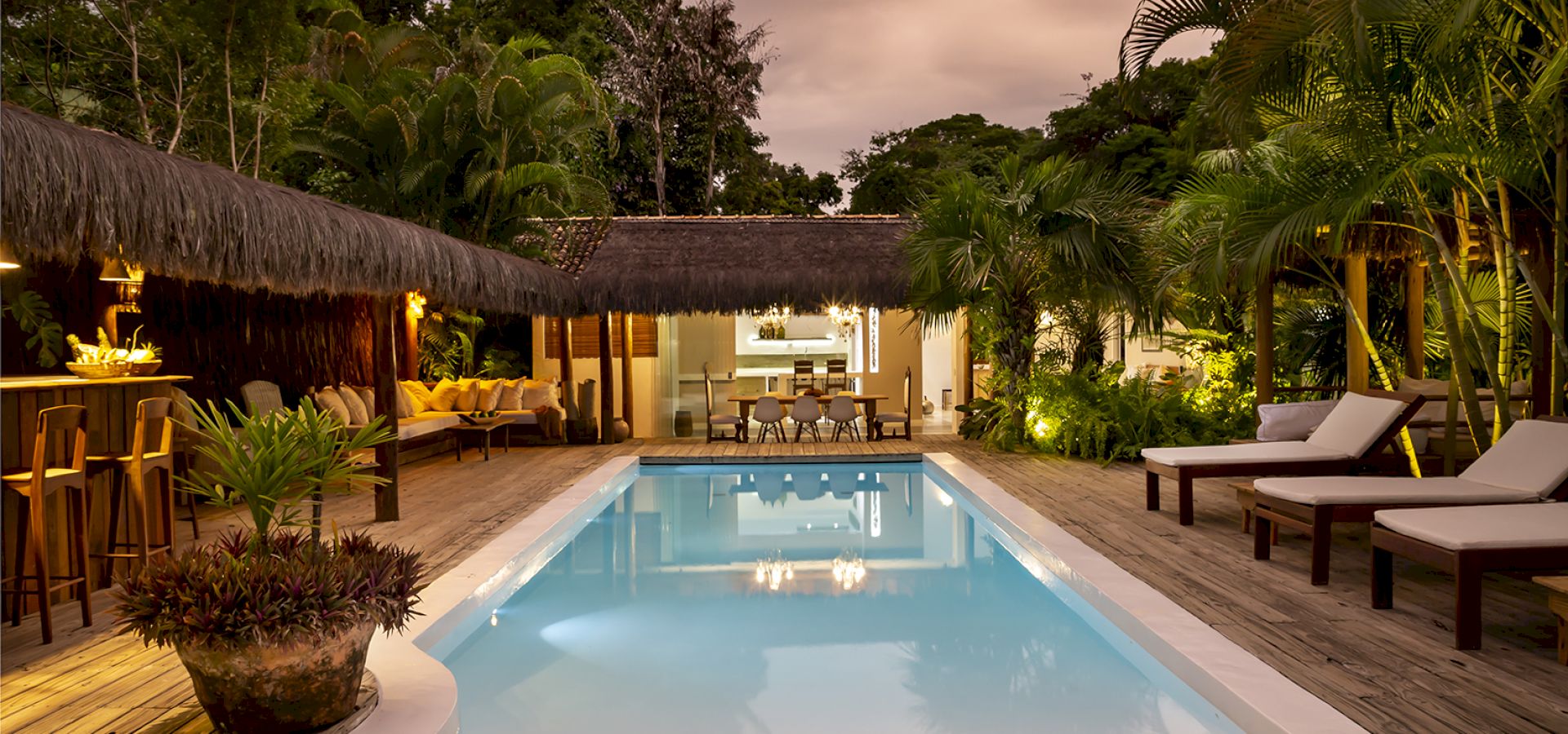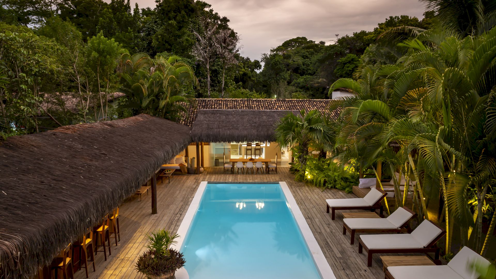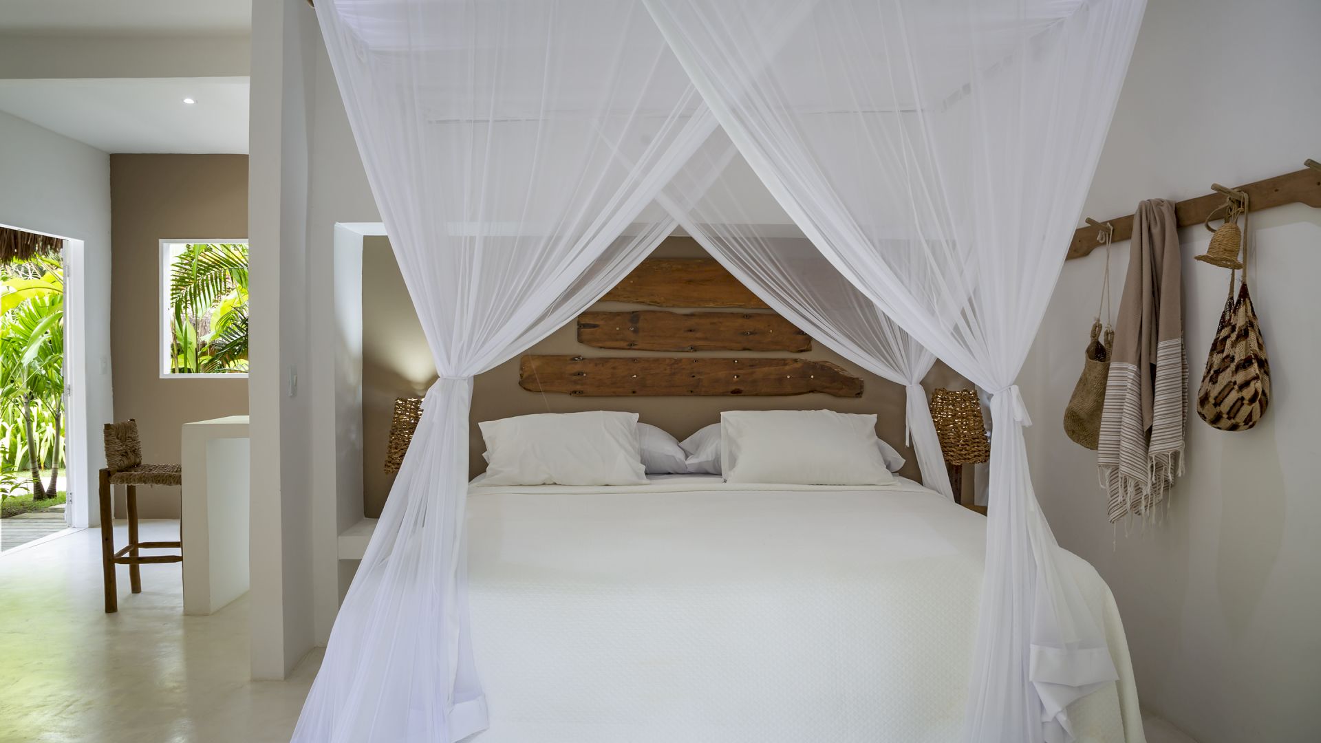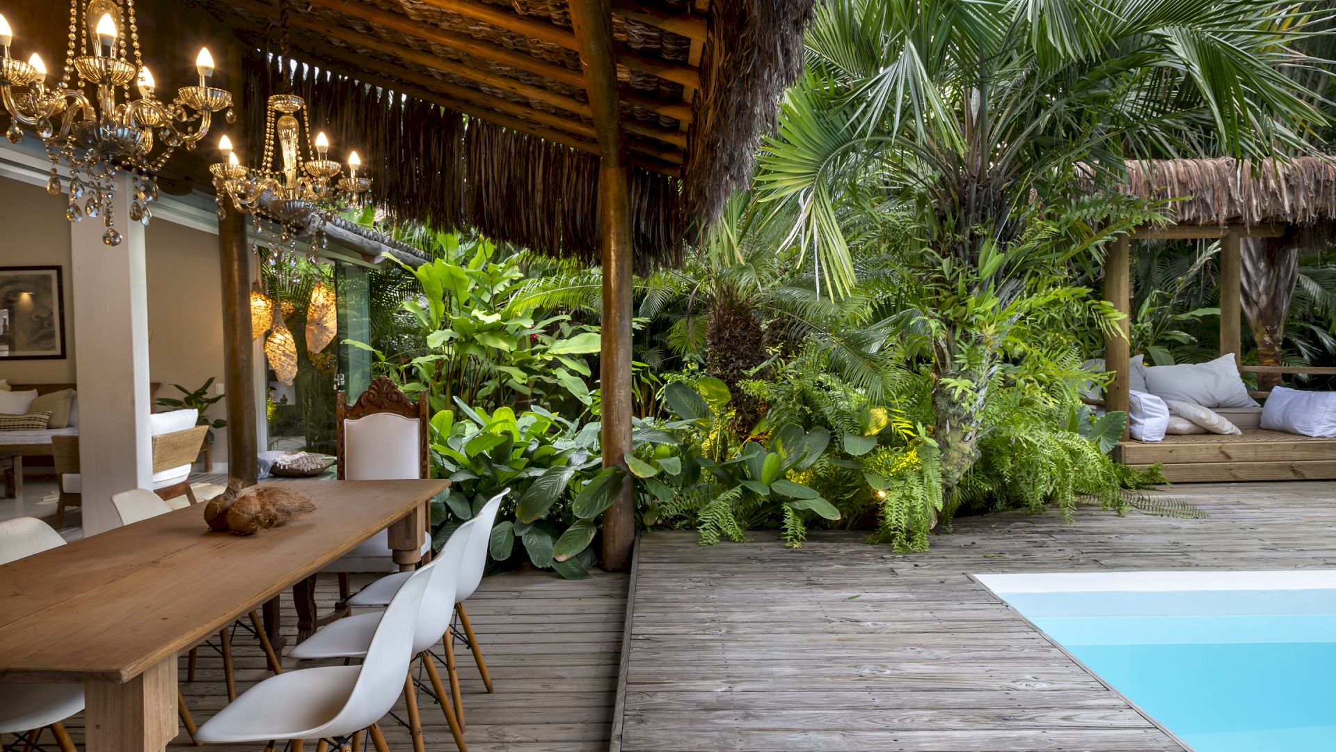 A casa é rodeada por um riquíssimo paisagismo tropical contendo 4 suítes que acomodam até 8 hóspedes confortavelmente. Todas as suítes são equipadas com cama Queen-size, ar condicionado, varanda individual com rede para descanso.
