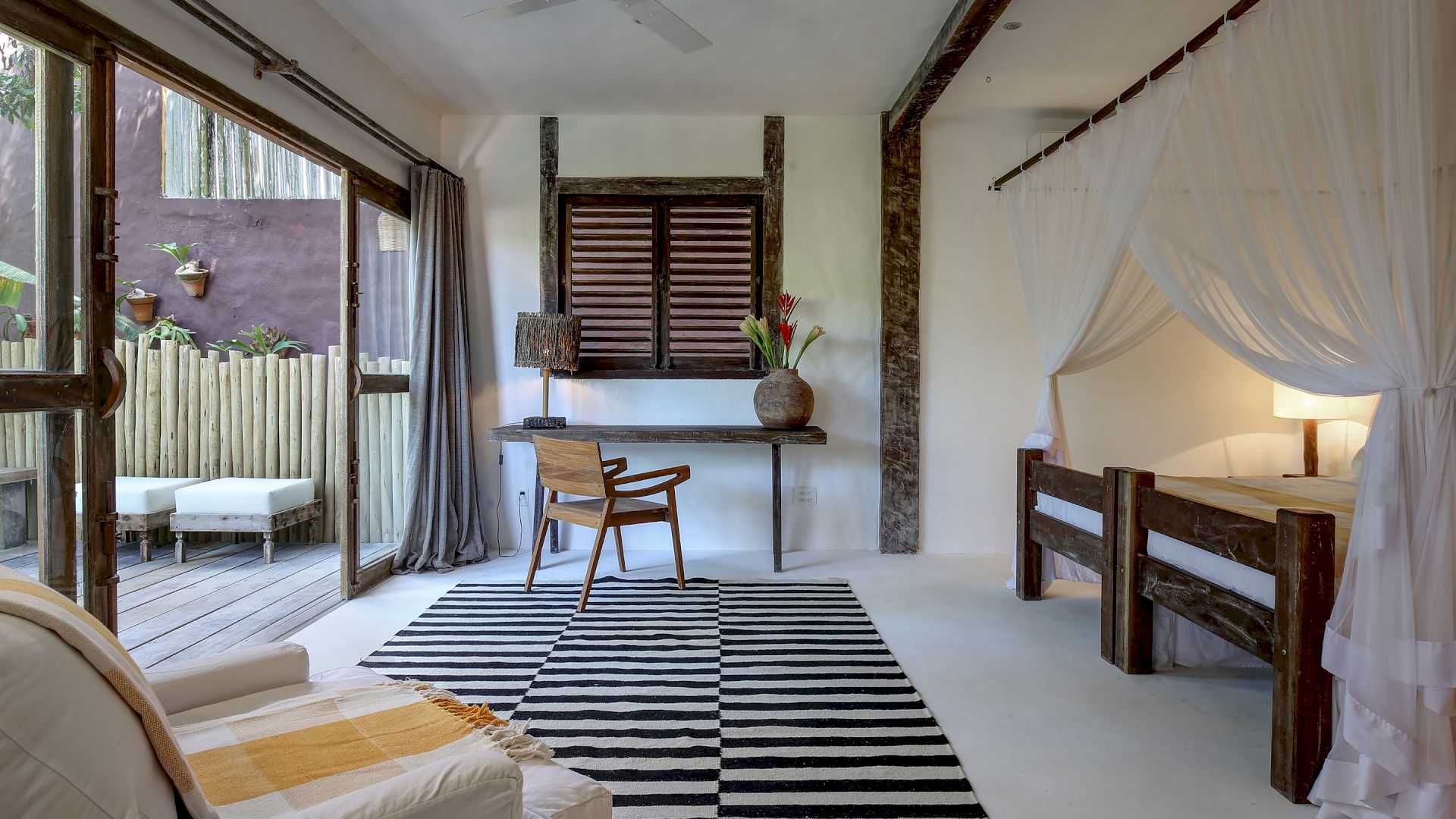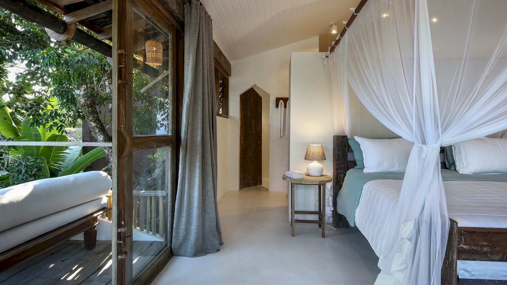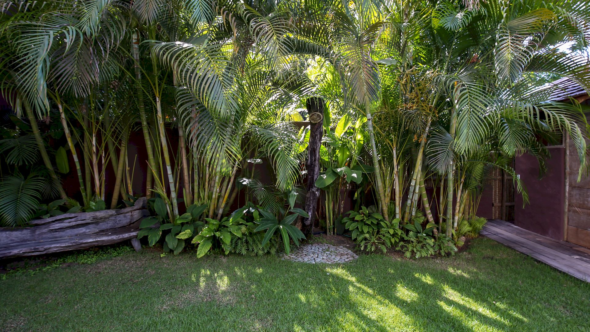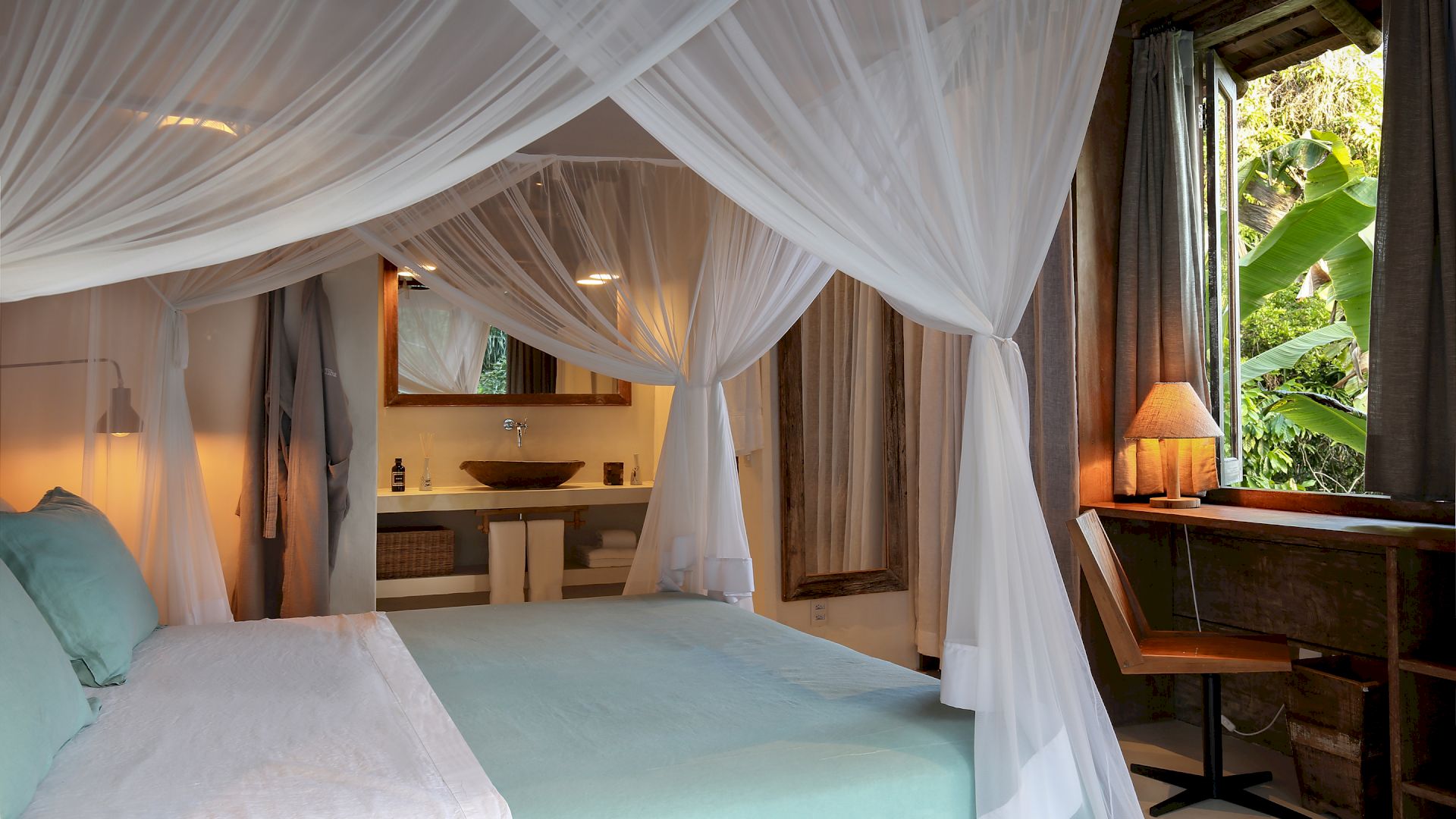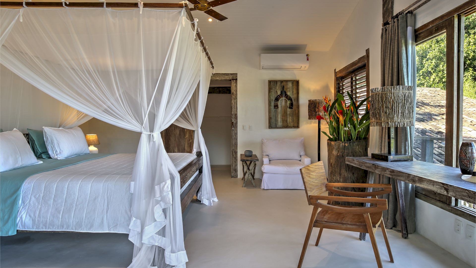 Suíte 01 - com acesso ao deque da piscina e jardim, cama de casal king size, 1 TV Smart, cofre, ar condicionado, ventilador de teto, mosquiteiro.