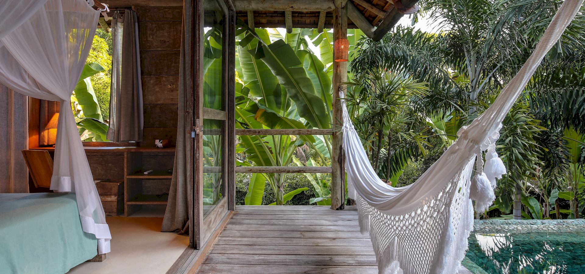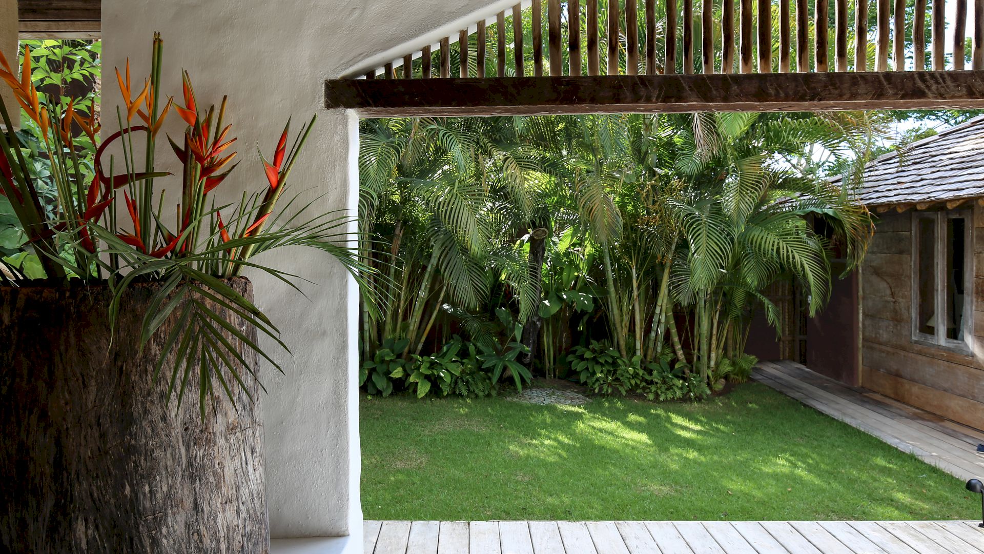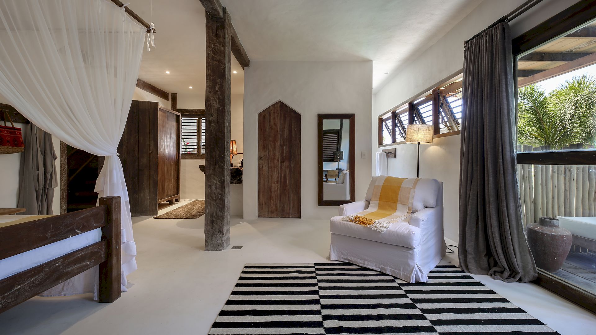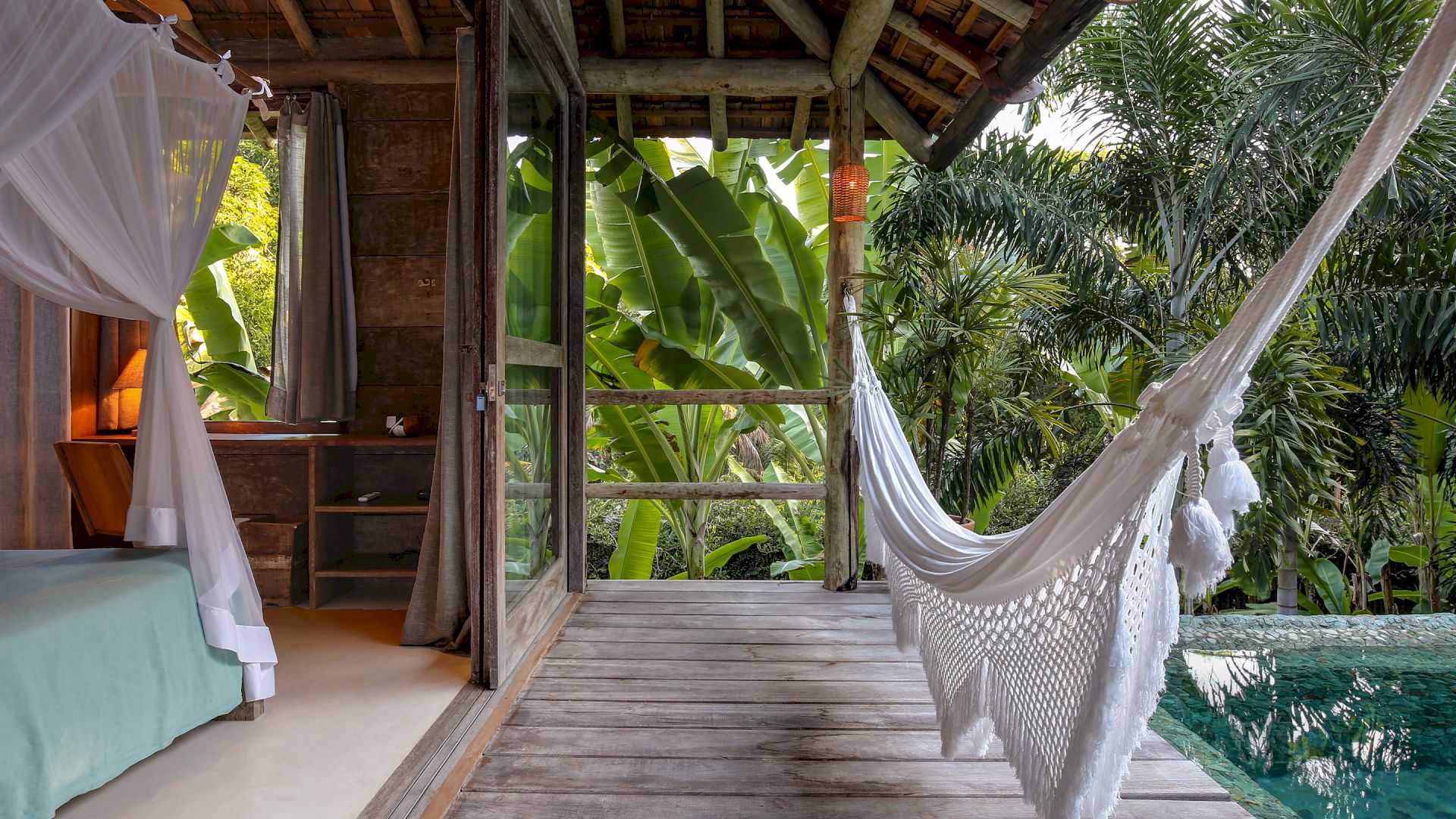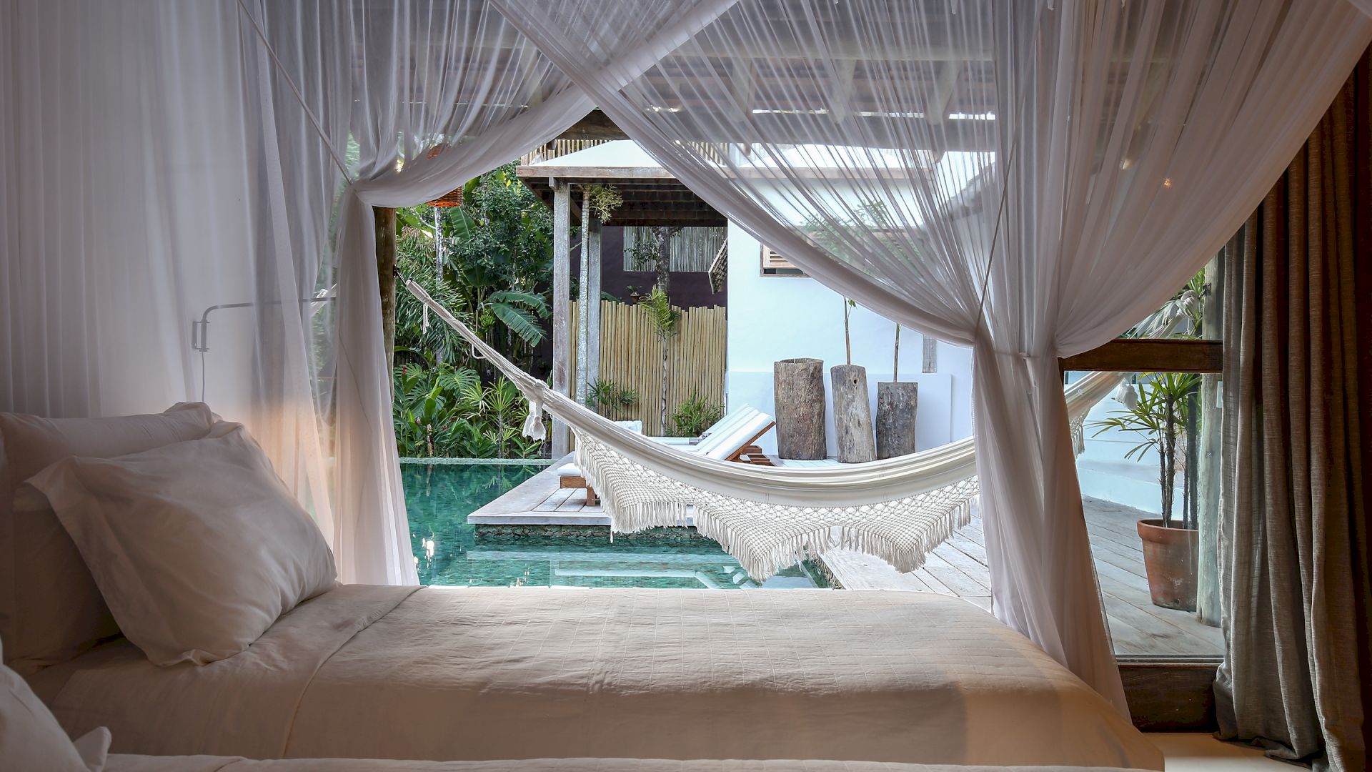 Suíte 01 - com acesso ao deque da piscina e jardim, cama de casal king size, 1 TV Smart, cofre, ar condicionado, ventilador de teto, mosquiteiro.