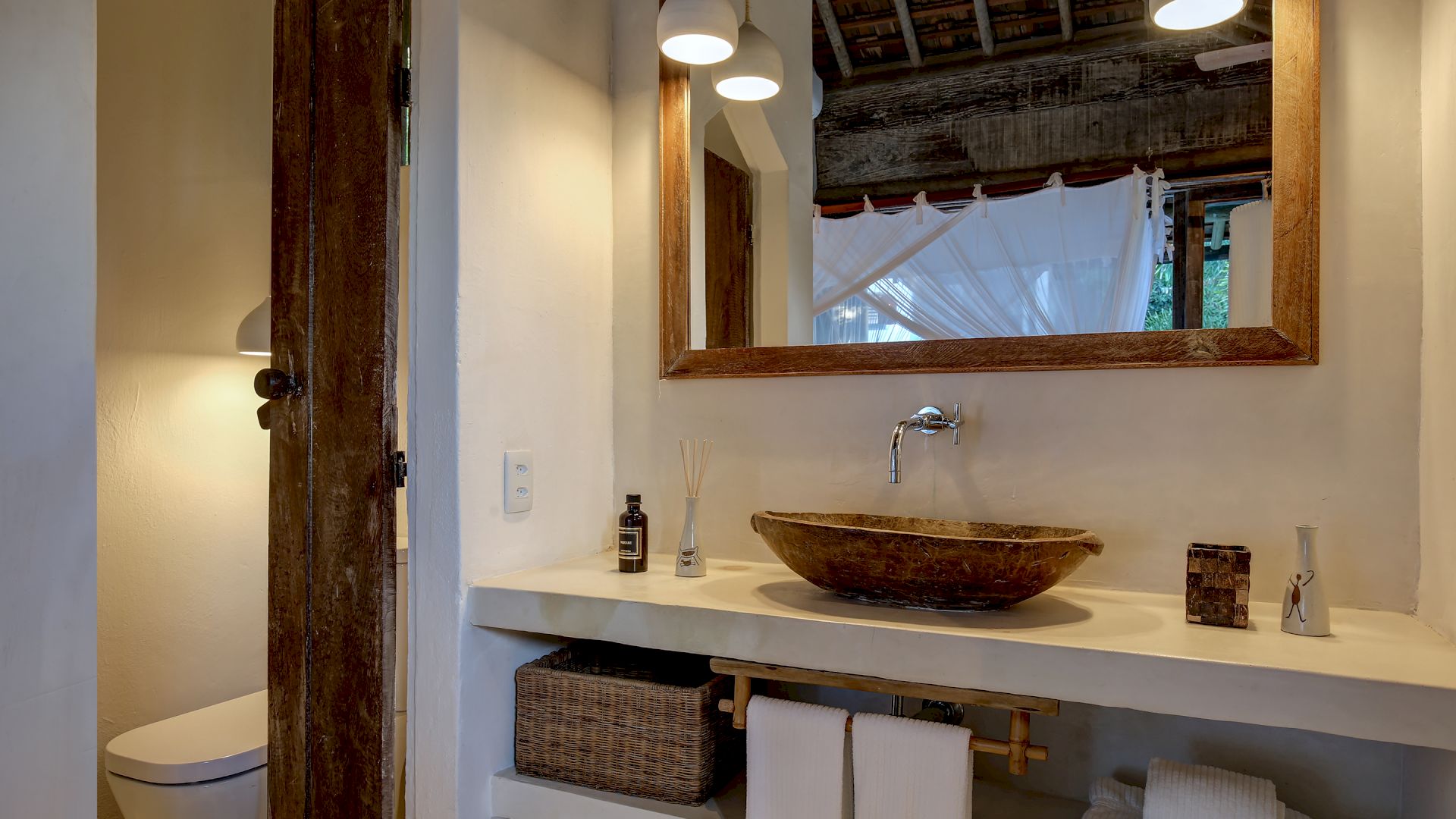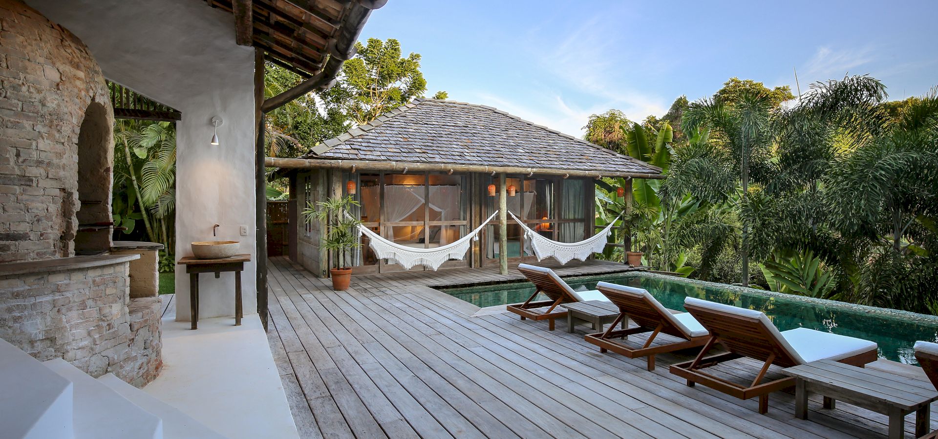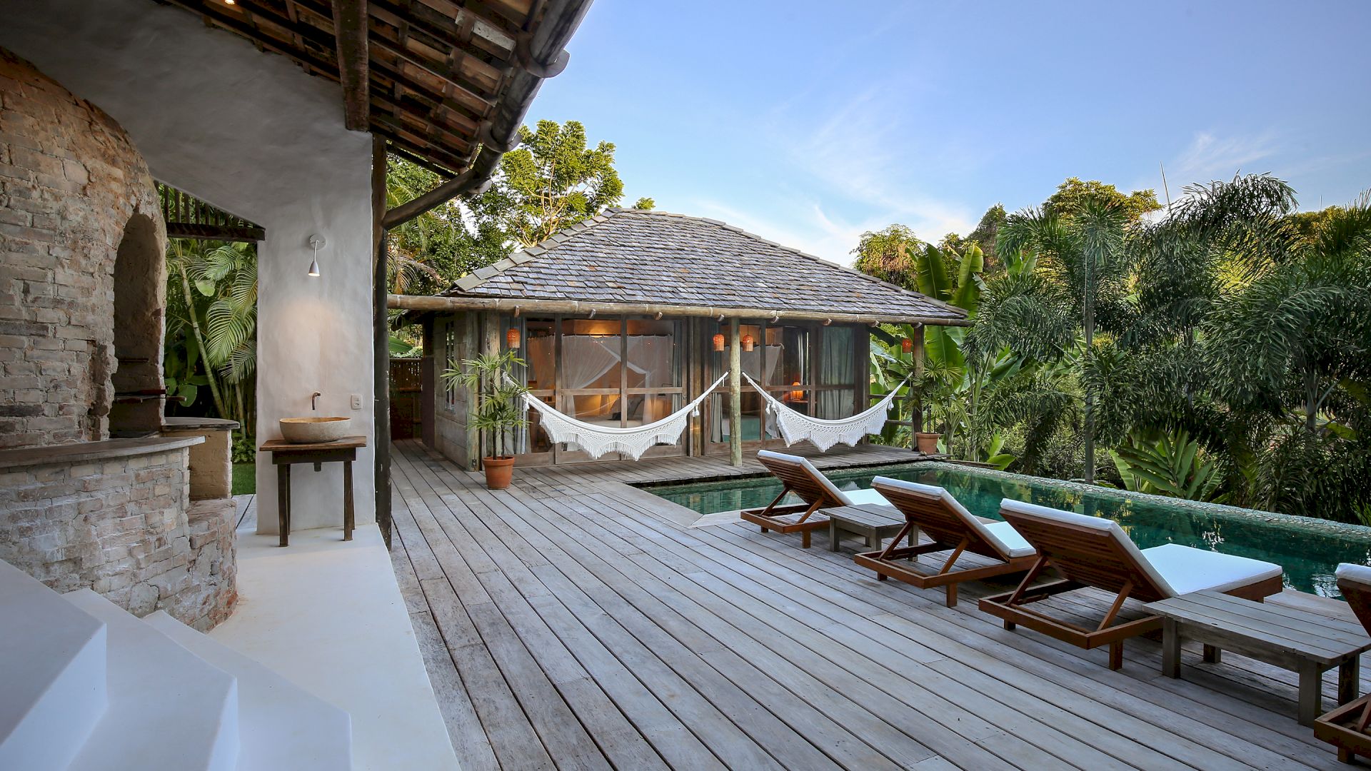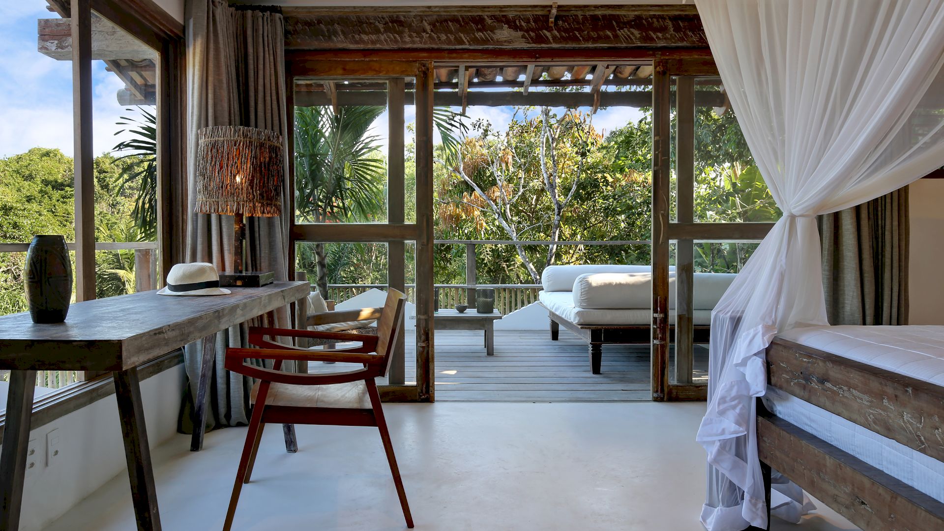 Suíte 01 - com acesso ao deque da piscina e jardim, cama de casal king size, 1 TV Smart, cofre, ar condicionado, ventilador de teto, mosquiteiro.