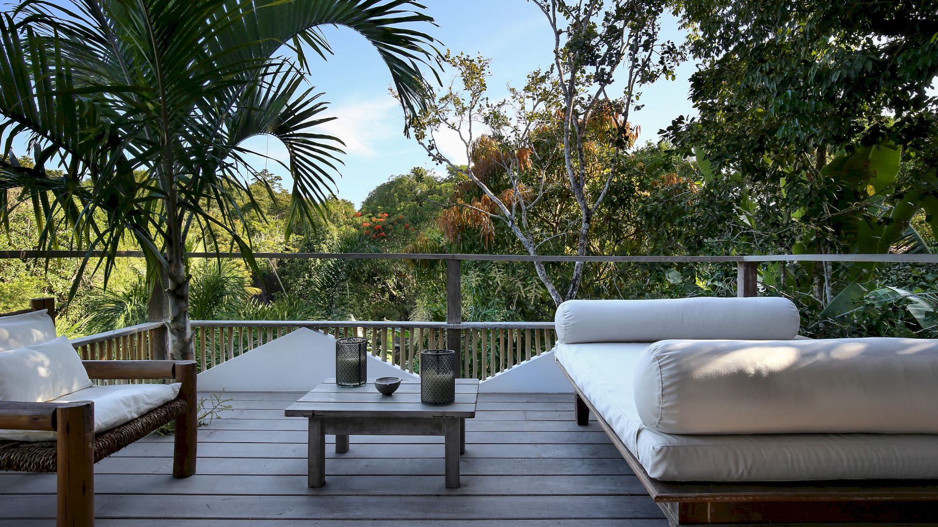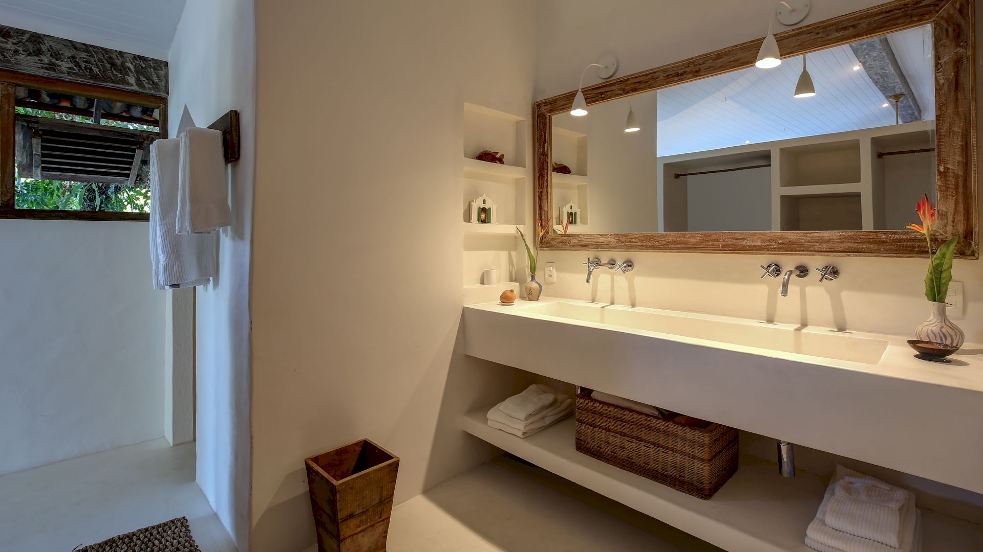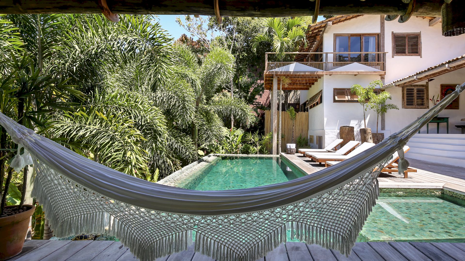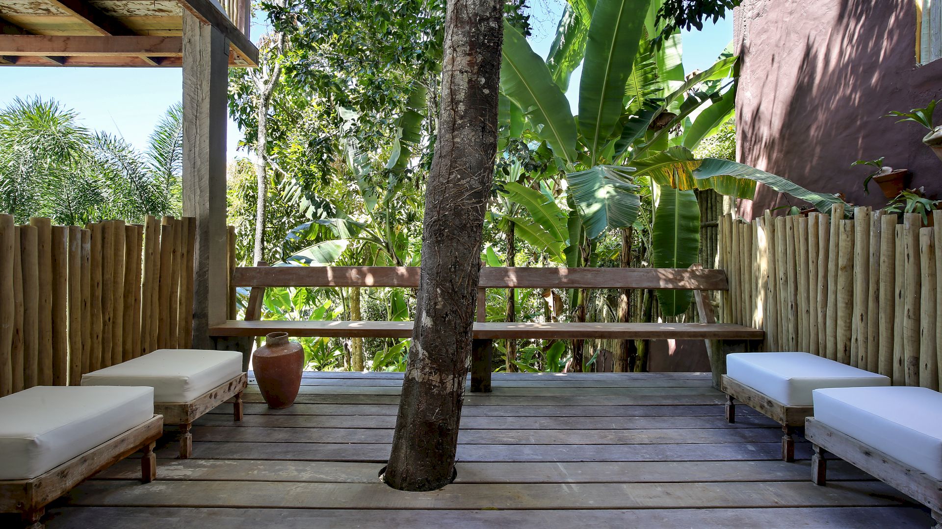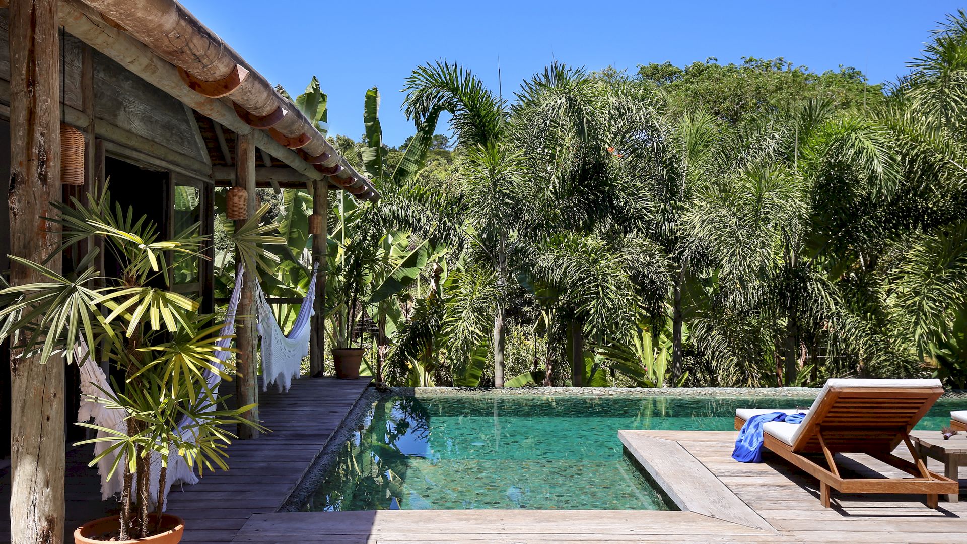 Suíte 01 - com acesso ao deque da piscina e jardim, cama de casal king size, 1 TV Smart, cofre, ar condicionado, ventilador de teto, mosquiteiro.