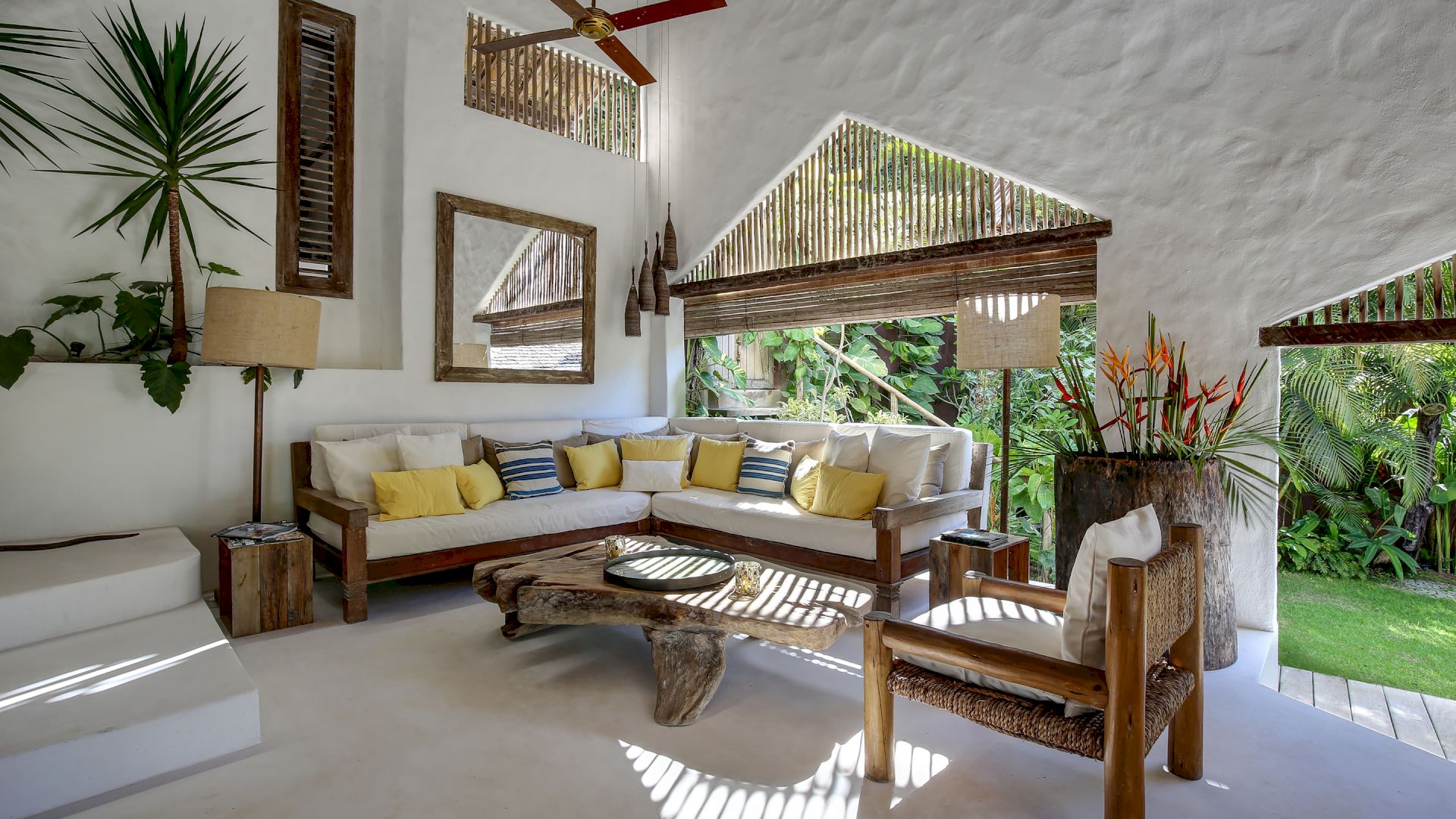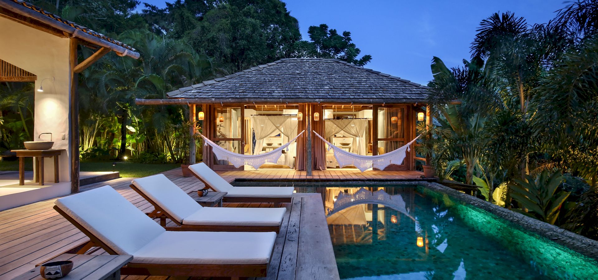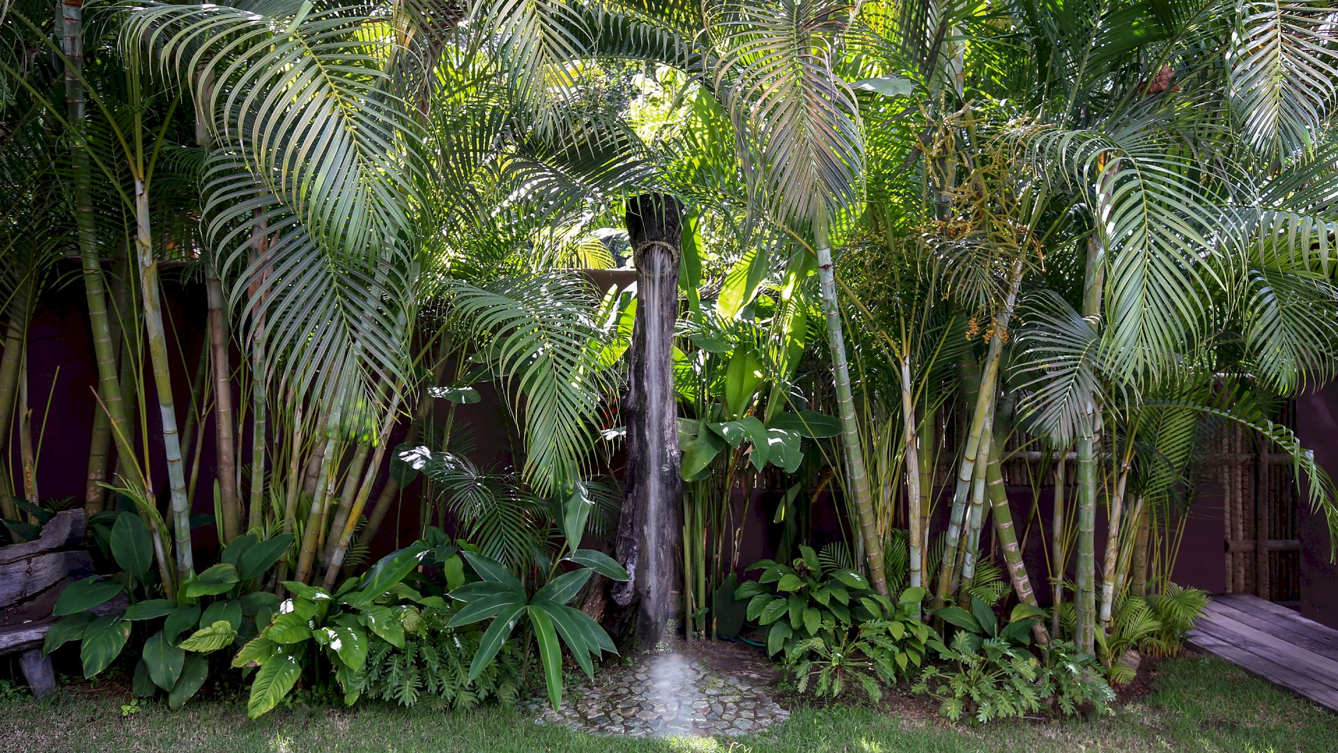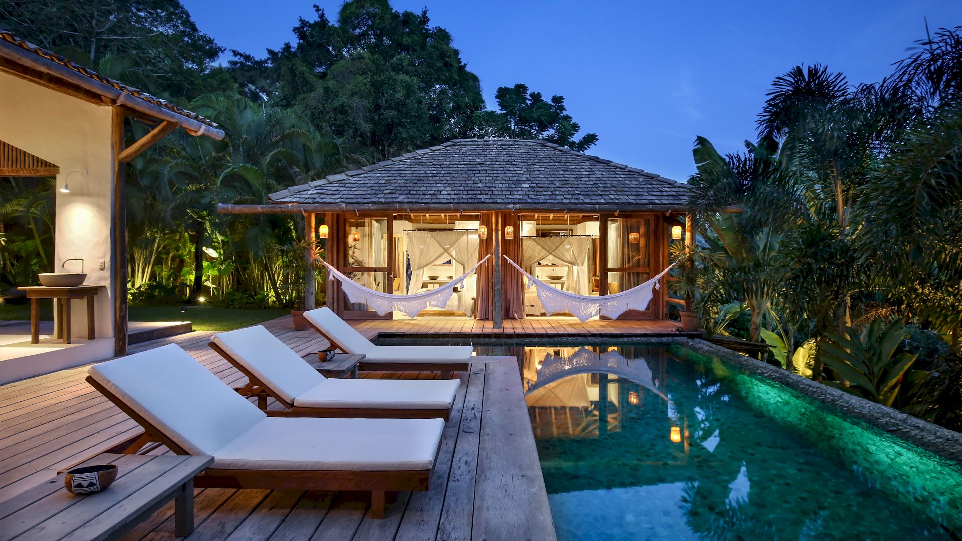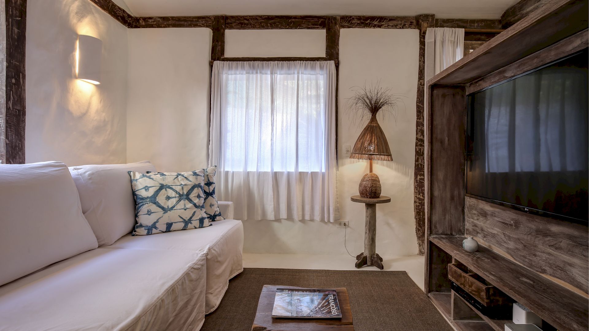 Suíte 01 - com acesso ao deque da piscina e jardim, cama de casal king size, 1 TV Smart, cofre, ar condicionado, ventilador de teto, mosquiteiro.