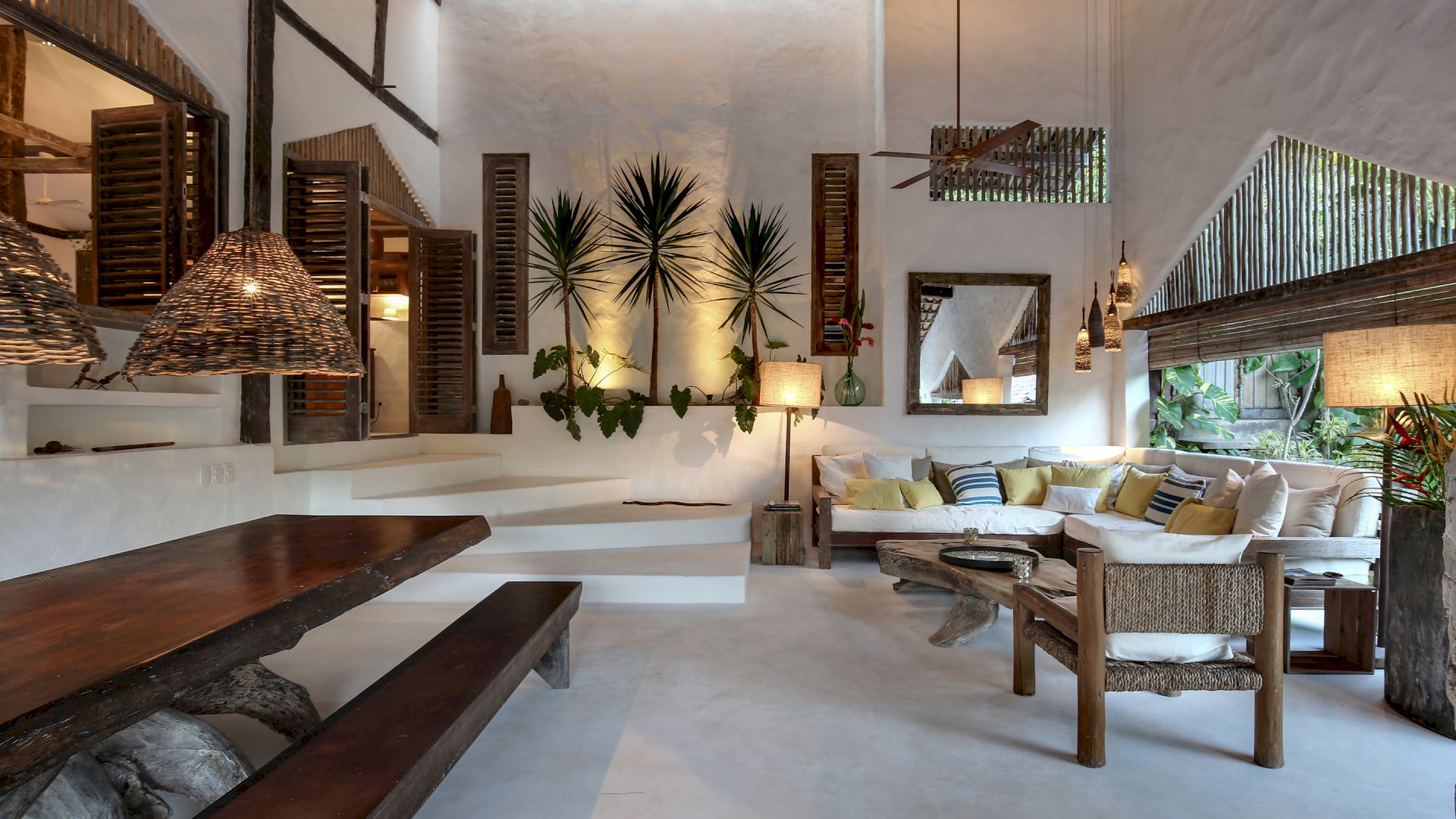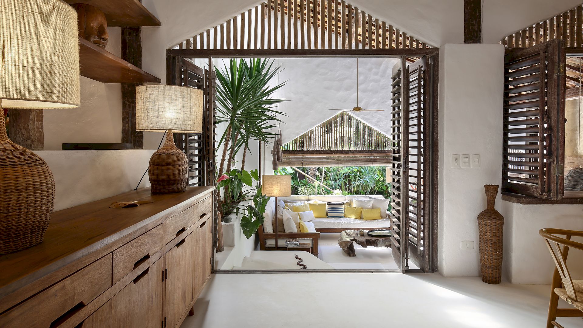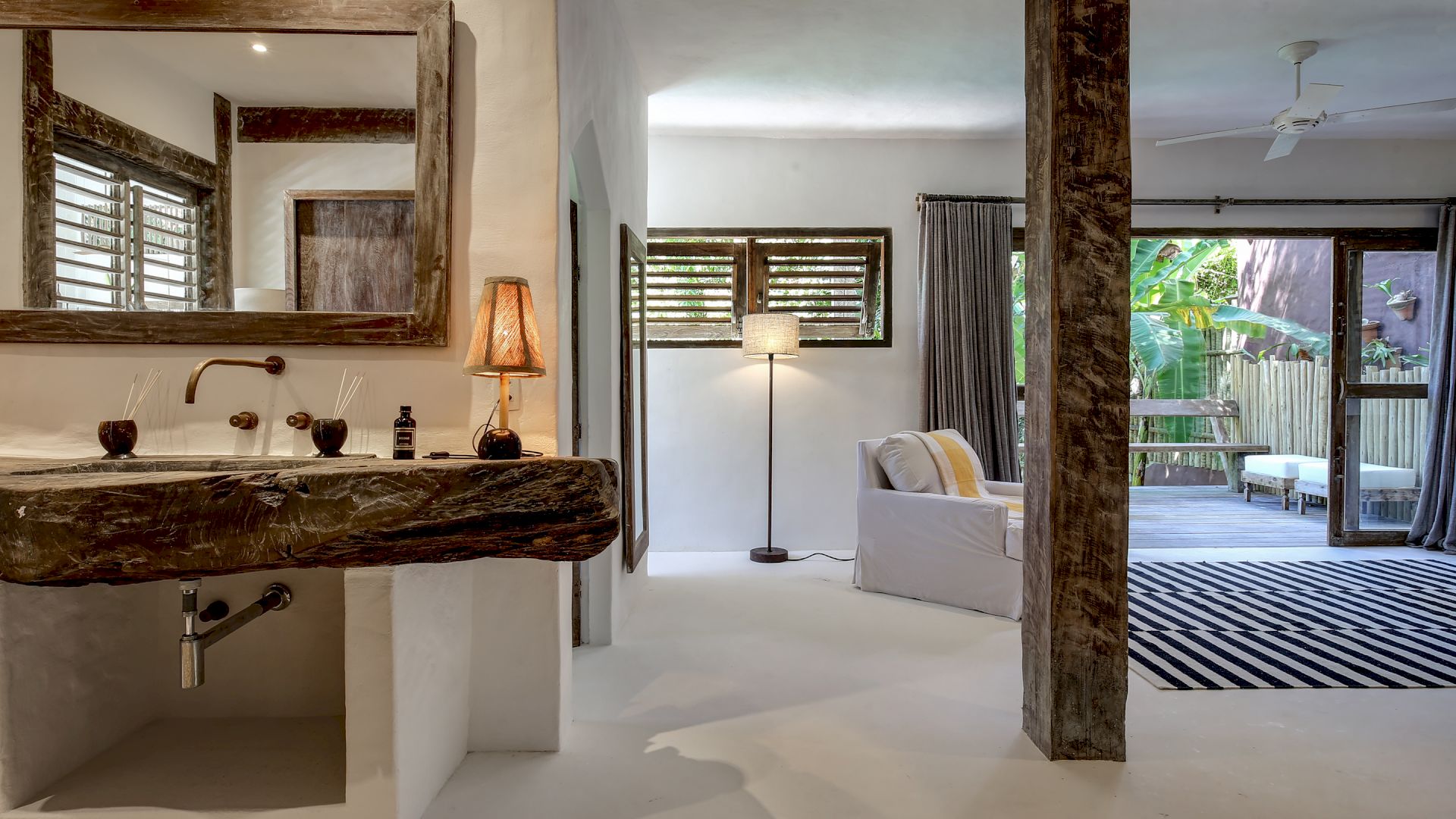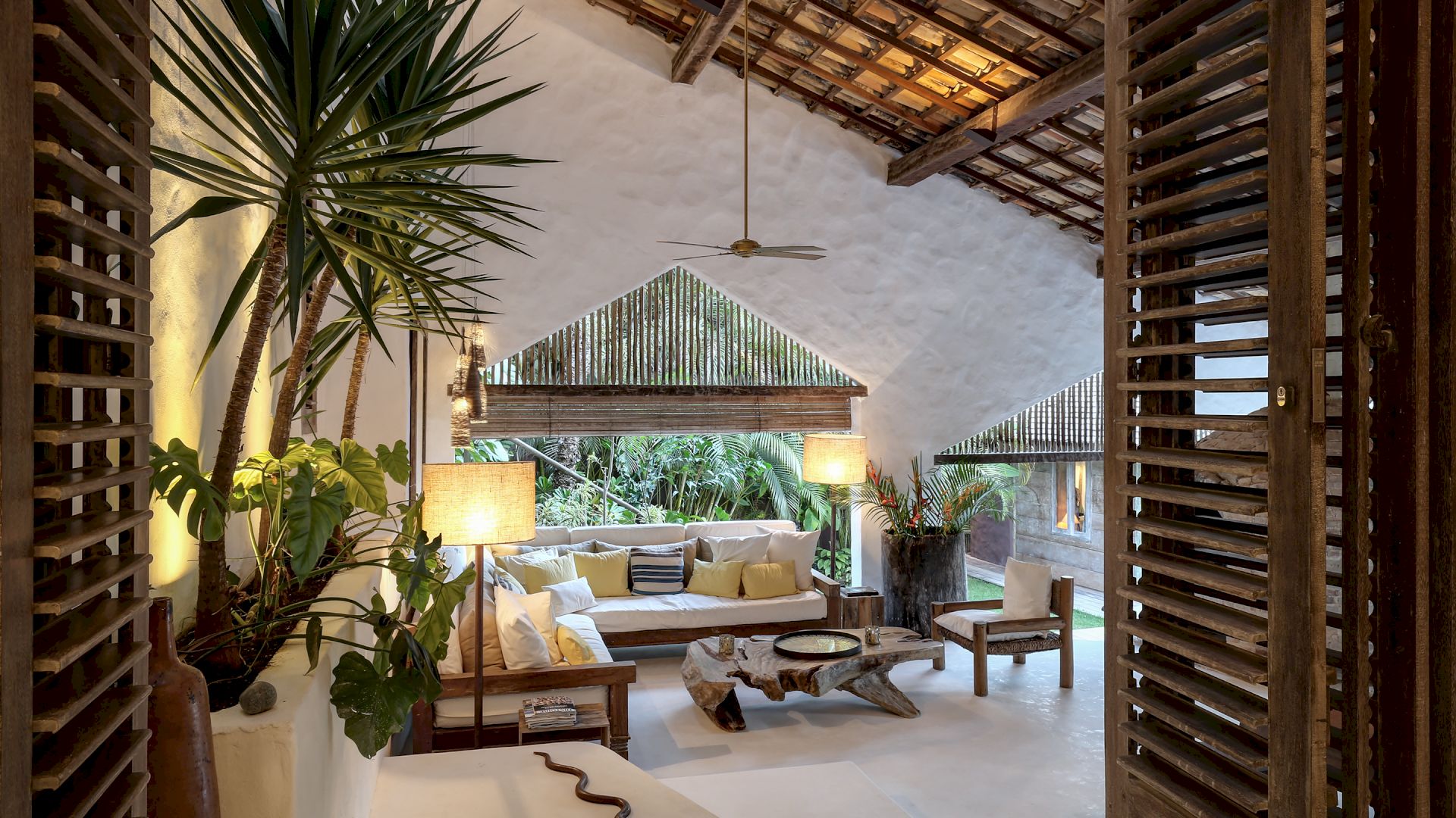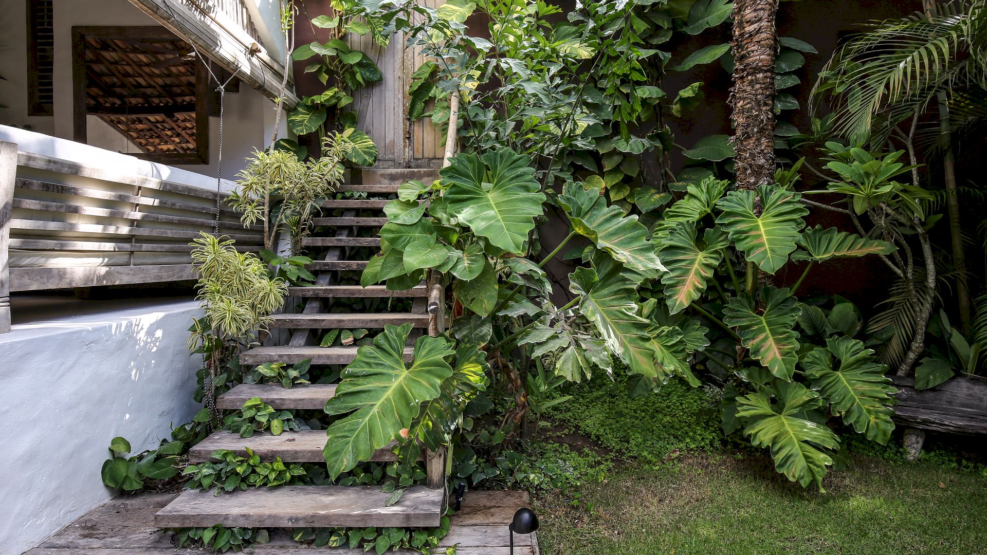 Suíte 01 - com acesso ao deque da piscina e jardim, cama de casal king size, 1 TV Smart, cofre, ar condicionado, ventilador de teto, mosquiteiro.