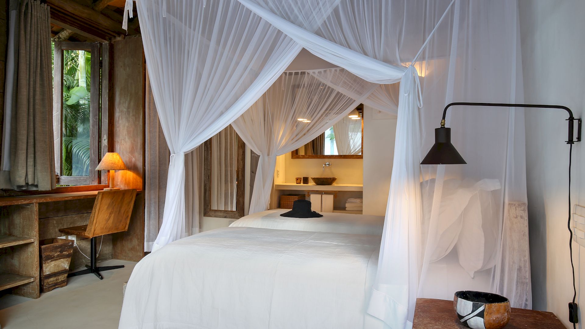 Suíte 02 - com acesso ao deck da piscina e jardim, 2 camas de solteiro reversível para king size, 1 TV Smart, cofre, ar condicionado, ventilador de teto, mosquiteiro.