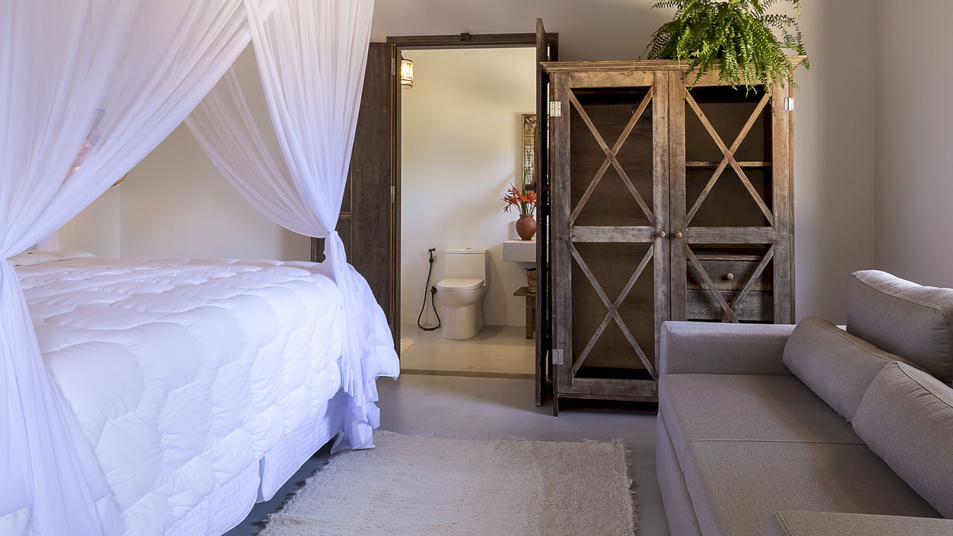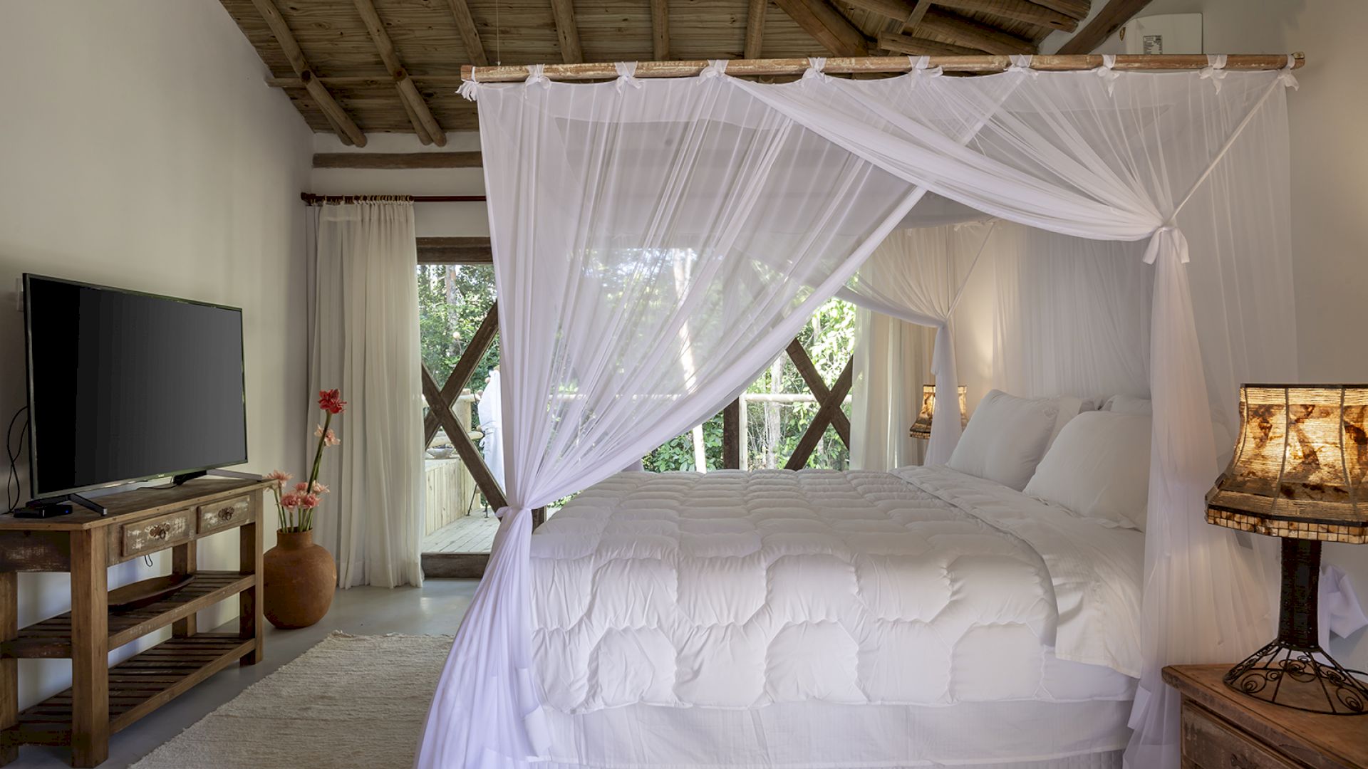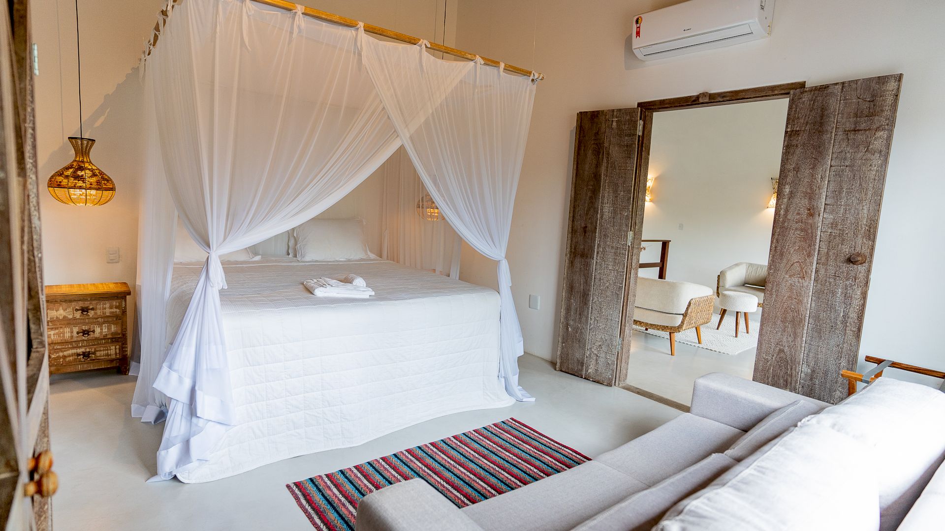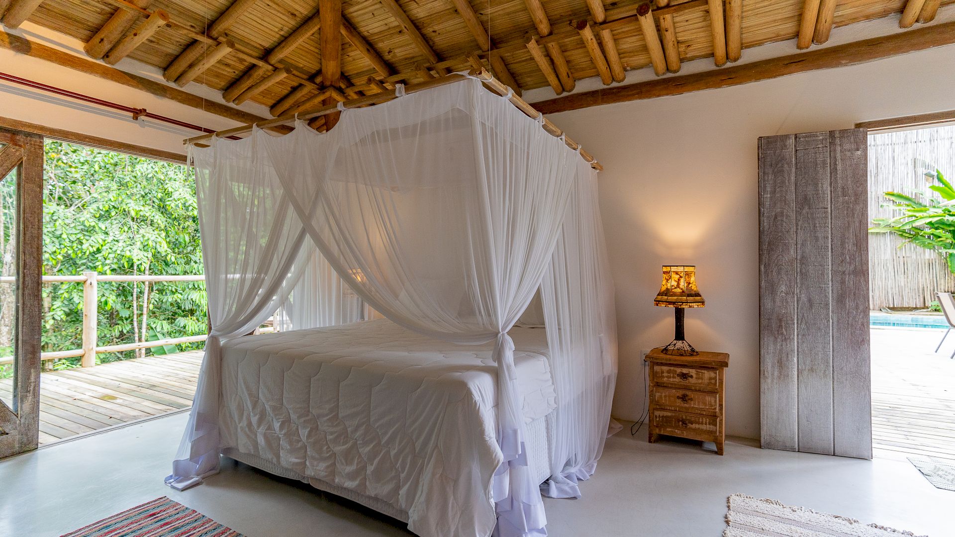 Suíte externa: Suíte master com hidromassagem , ar-condicionado cama queen size com mosquiteiro , sofá camal de casal.