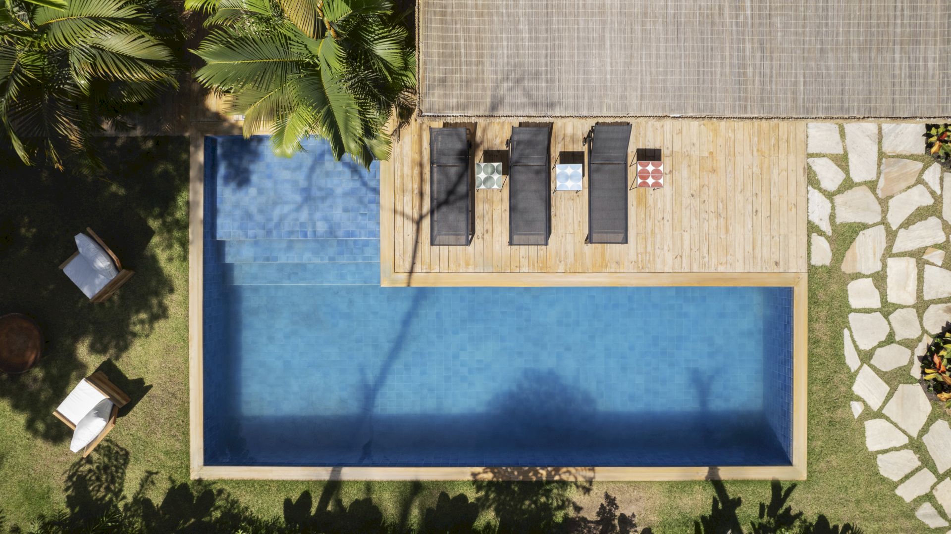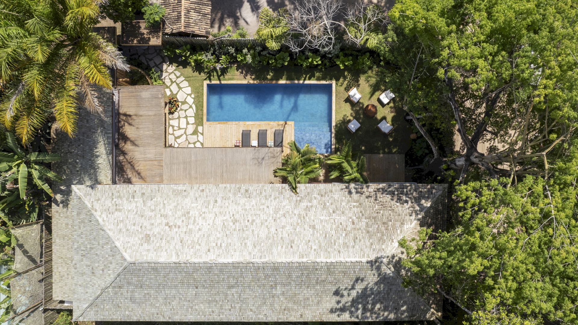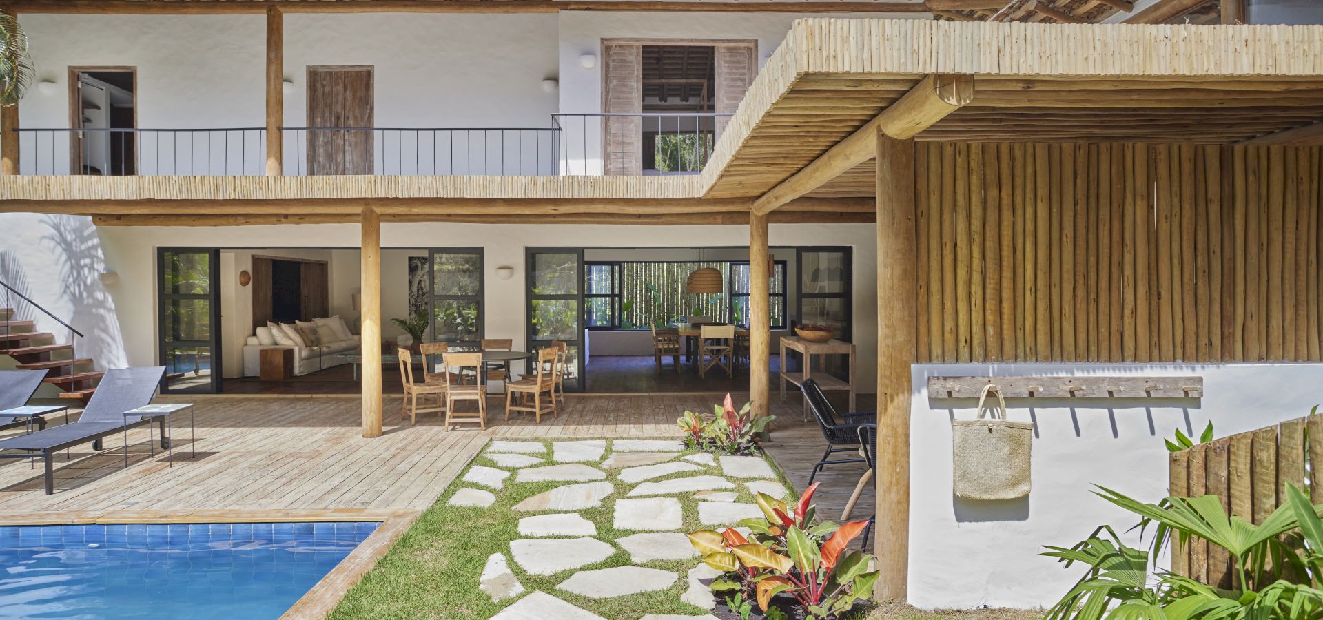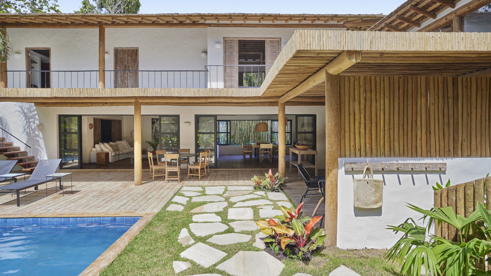 A CASA GUAIUBA, situada na Alameda das Orquídeas, 39, João Vieira, é um refúgio sofisticado em Trancoso-BA, projetado por Nádia Calazans (Trancoso) e construído em 2023. Com 700 m² de terreno e 300 m² de área construída, a casa acomoda 11 hóspedes em 5 suítes amplas, todas equipadas com closet, ar condicionado, cofre, ducha independente, secador de cabelo e produtos da GRANADO. Três suítes possuem frigobar e duas têm mesa para laptop.