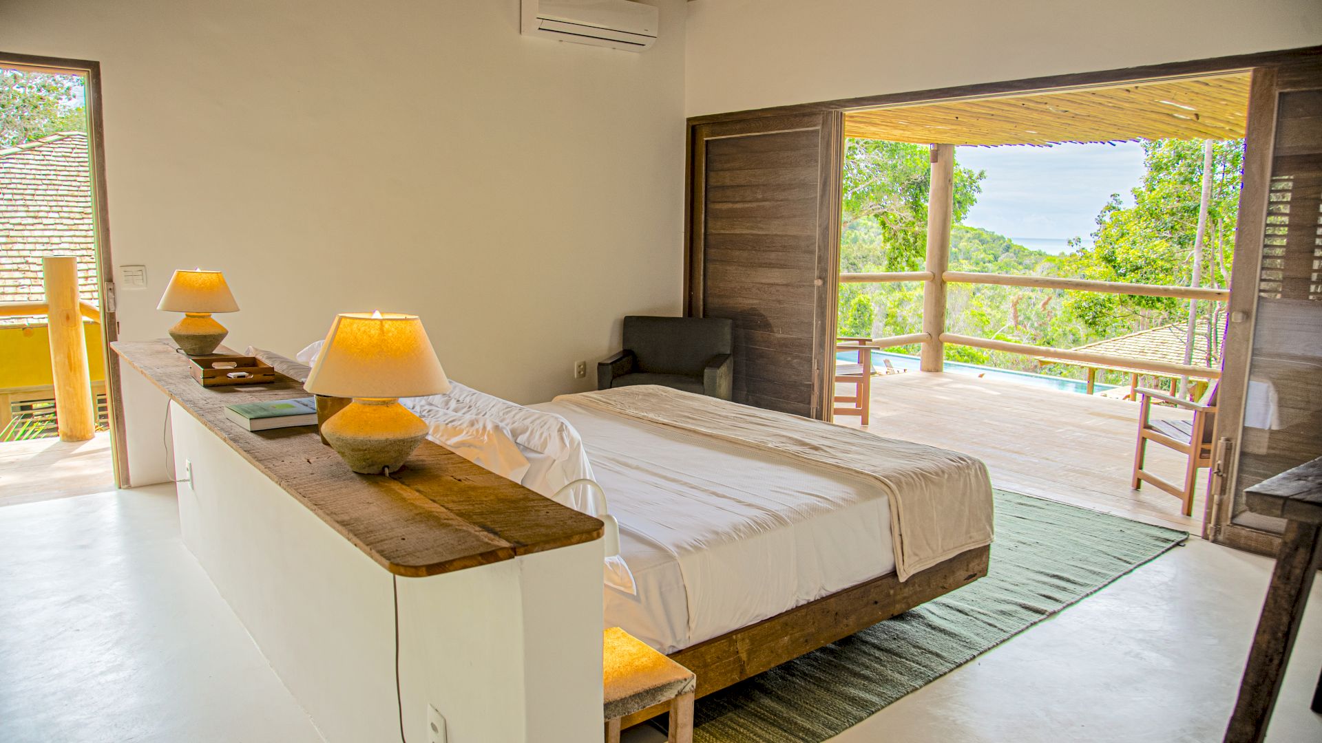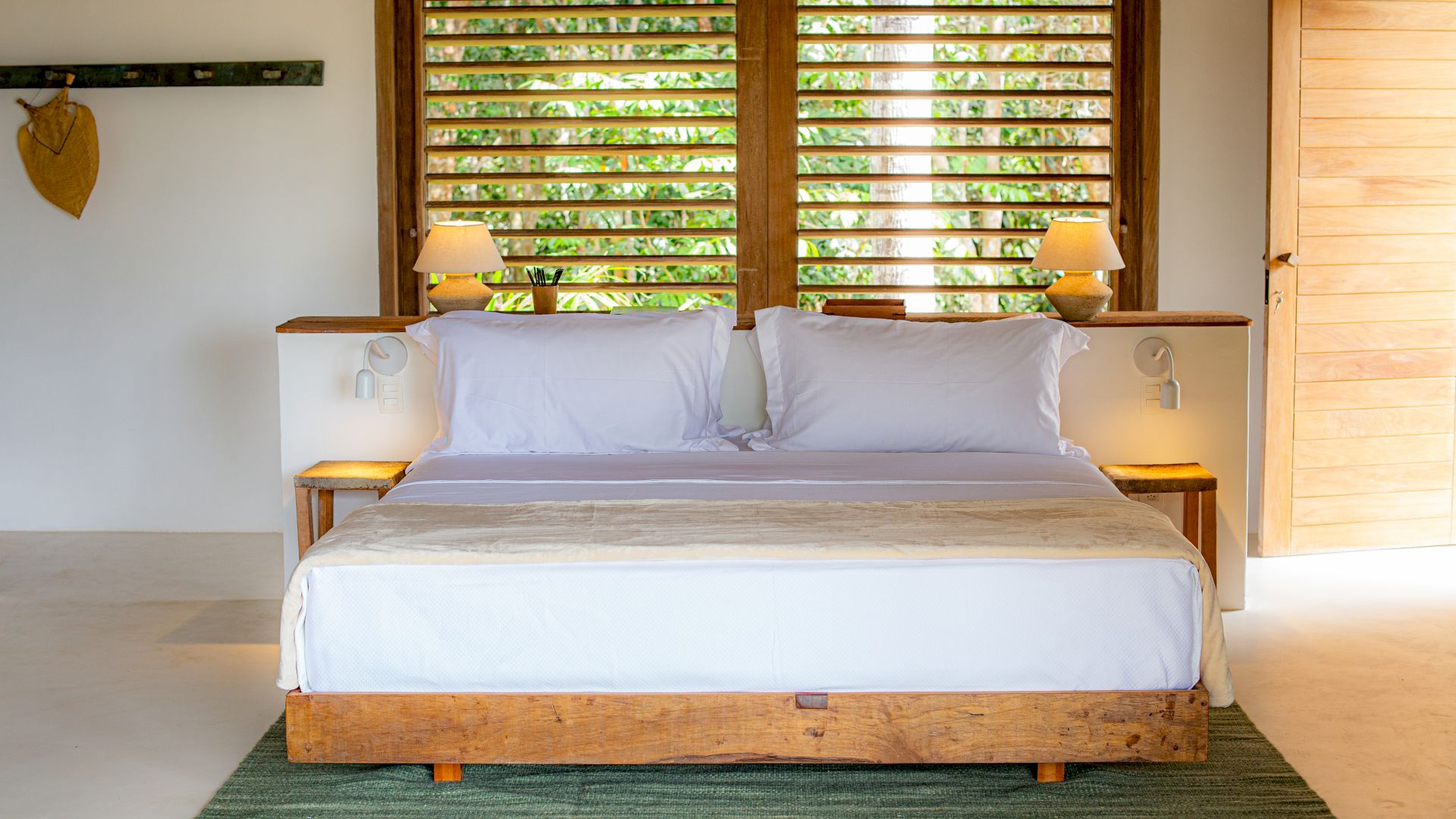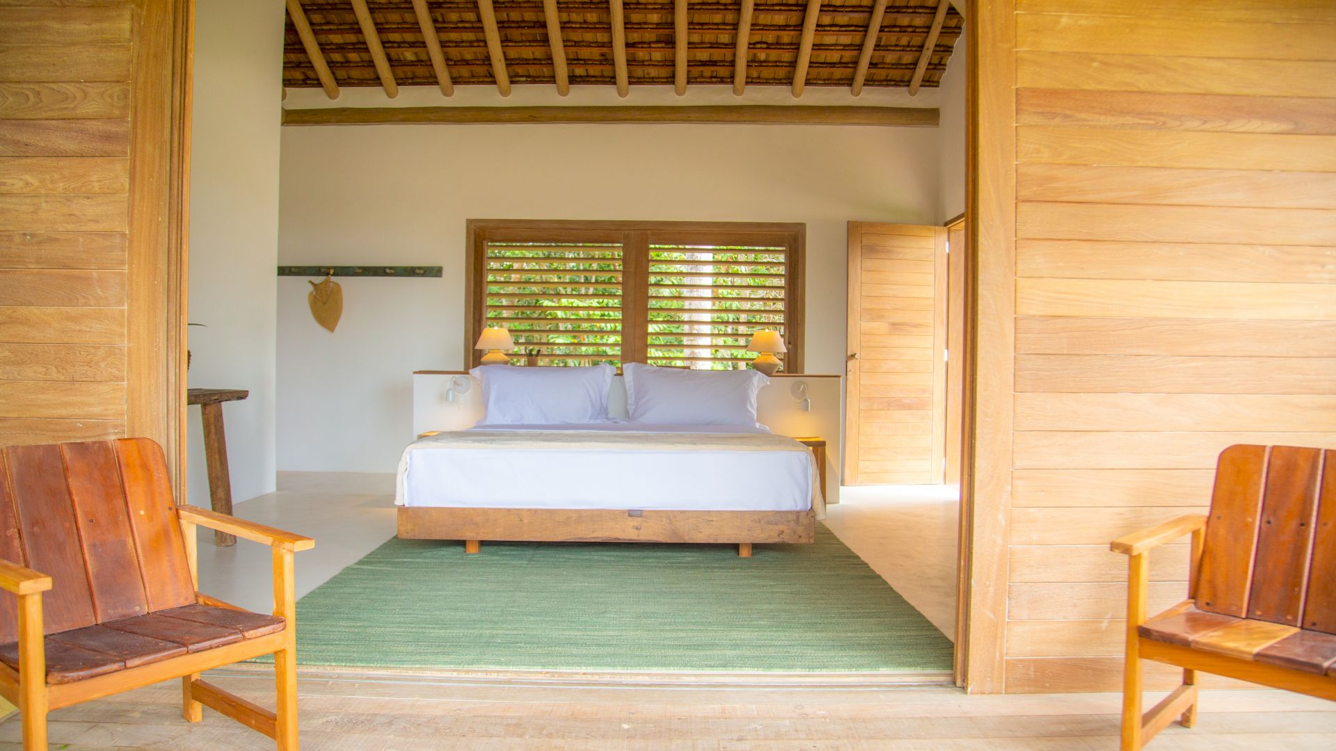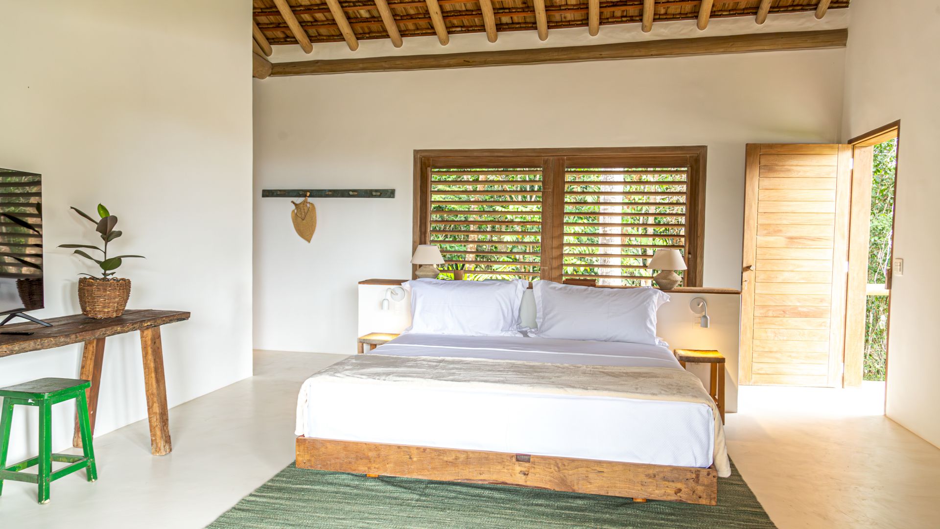 A villa acomoda até 15 hóspedes em 7 suítes distribuídas em três bangalôs independentes, cada um com estilo único e ambientes confortáveis: