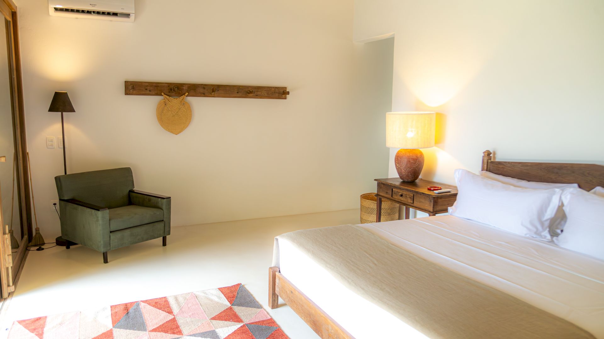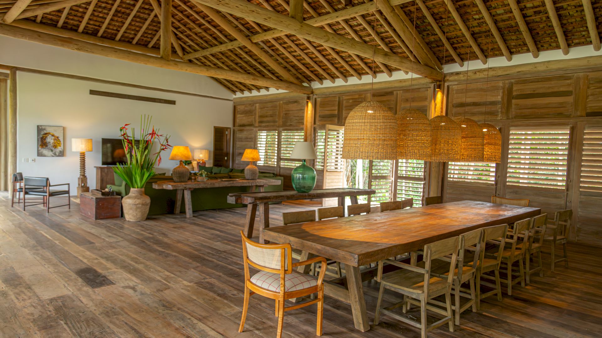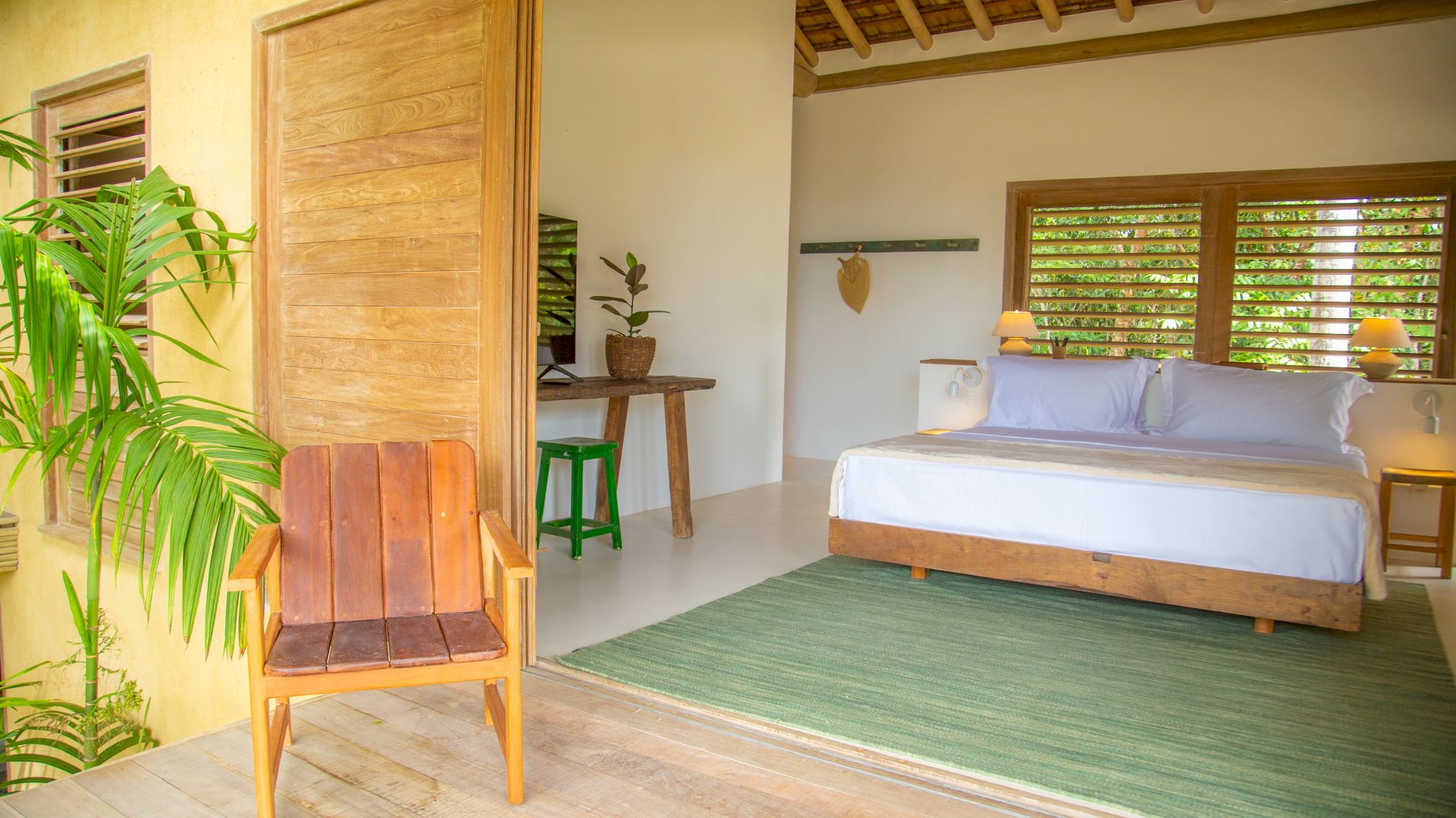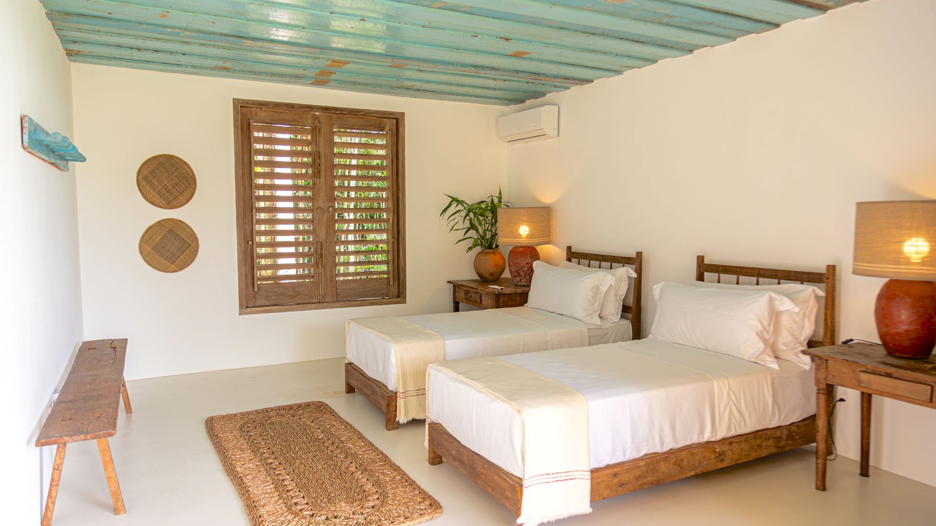 A villa acomoda até 15 hóspedes em 7 suítes distribuídas em três bangalôs independentes, cada um com estilo único e ambientes confortáveis: