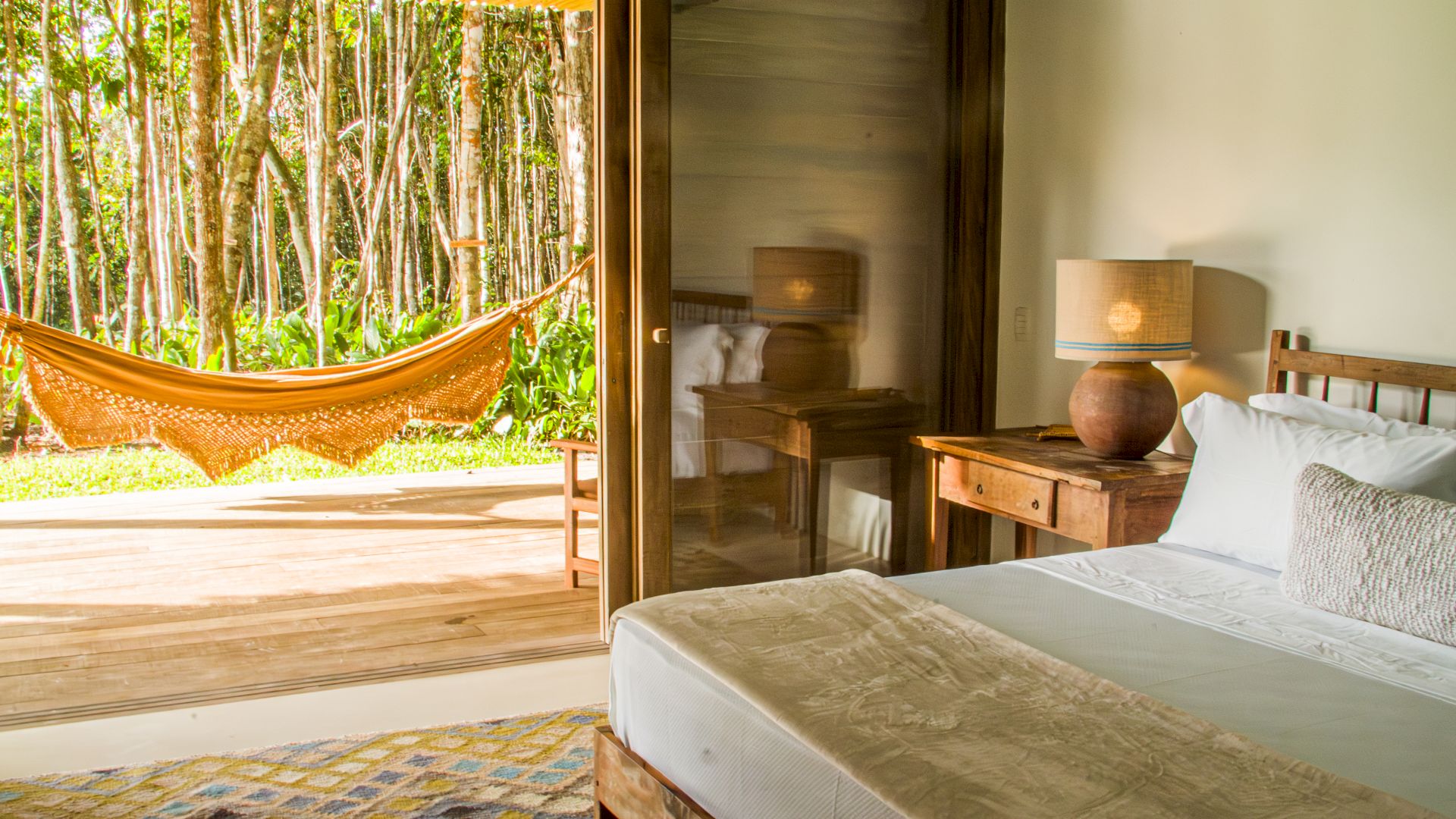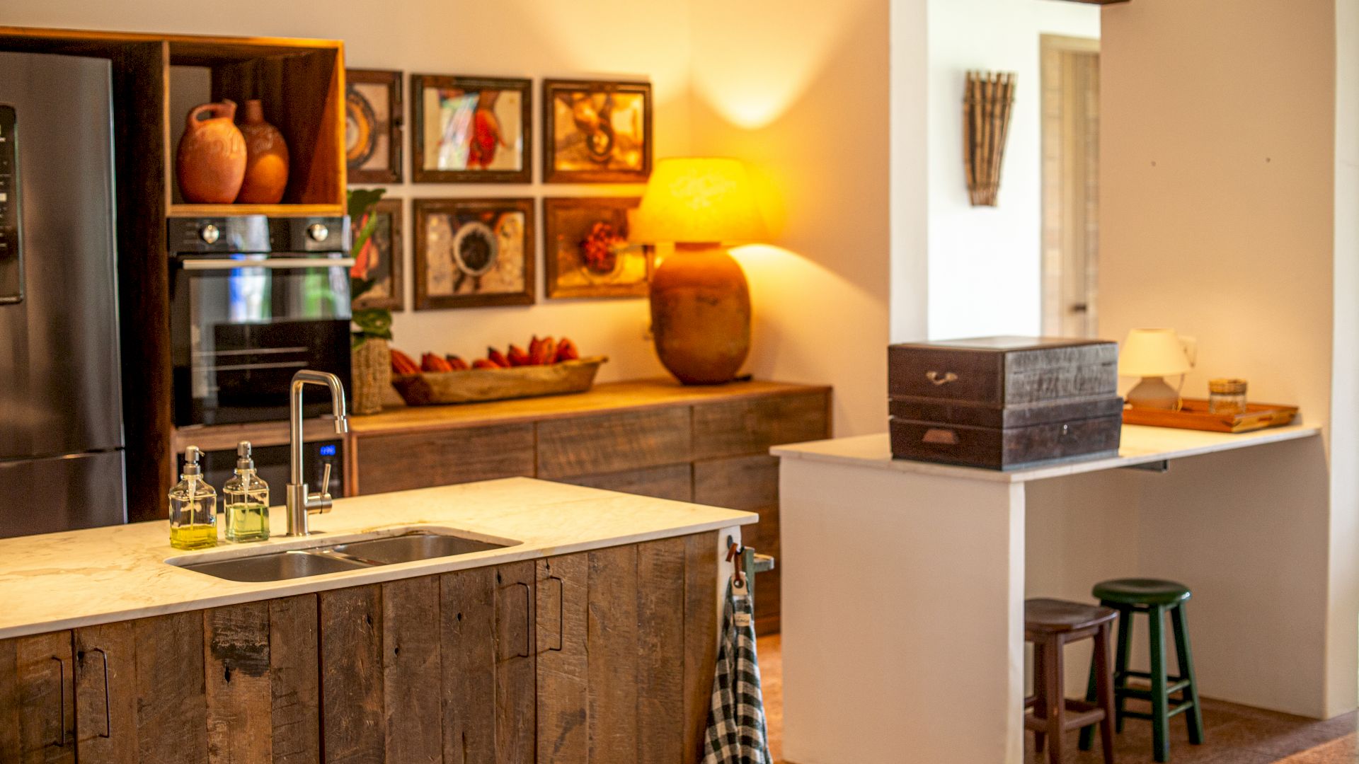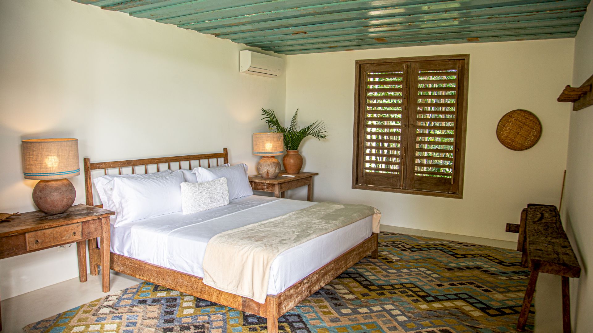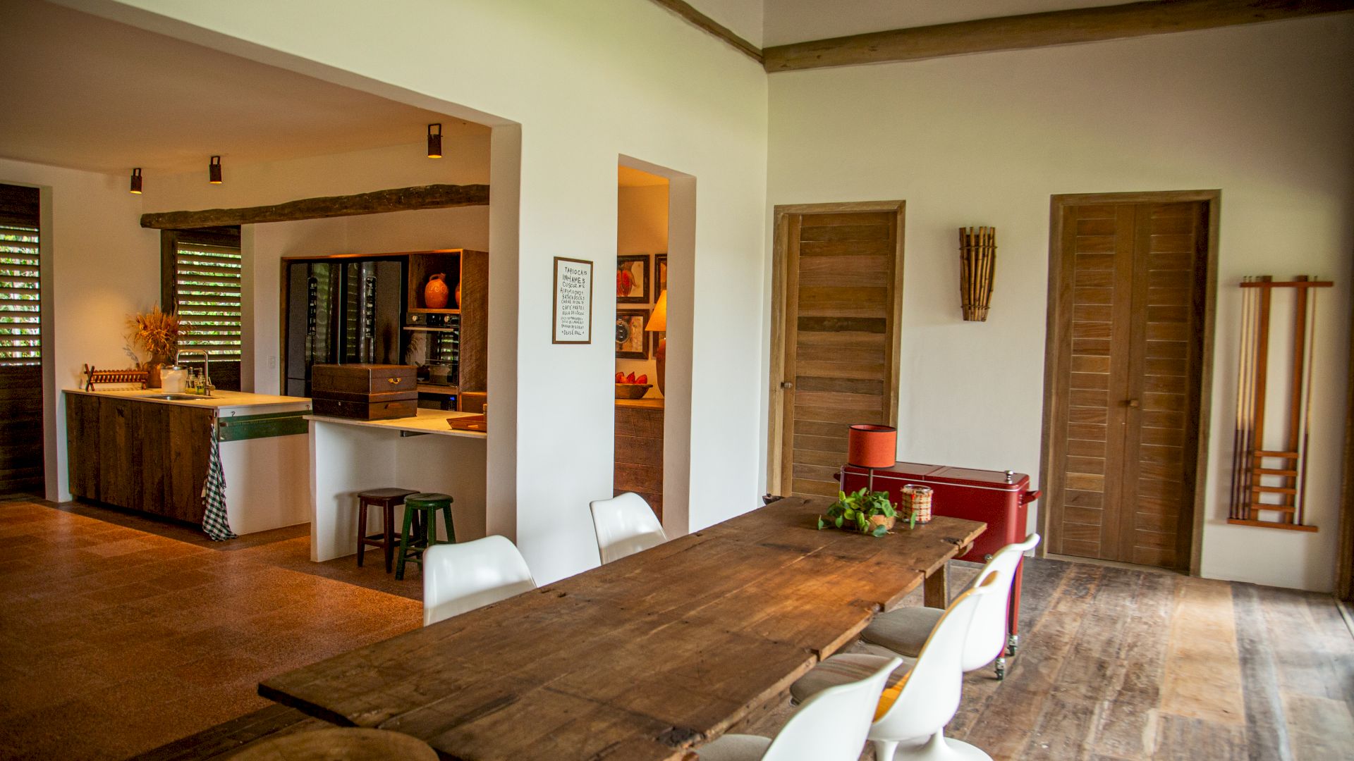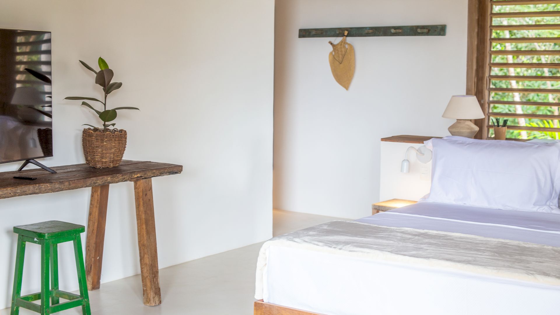 A villa acomoda até 15 hóspedes em 7 suítes distribuídas em três bangalôs independentes, cada um com estilo único e ambientes confortáveis: