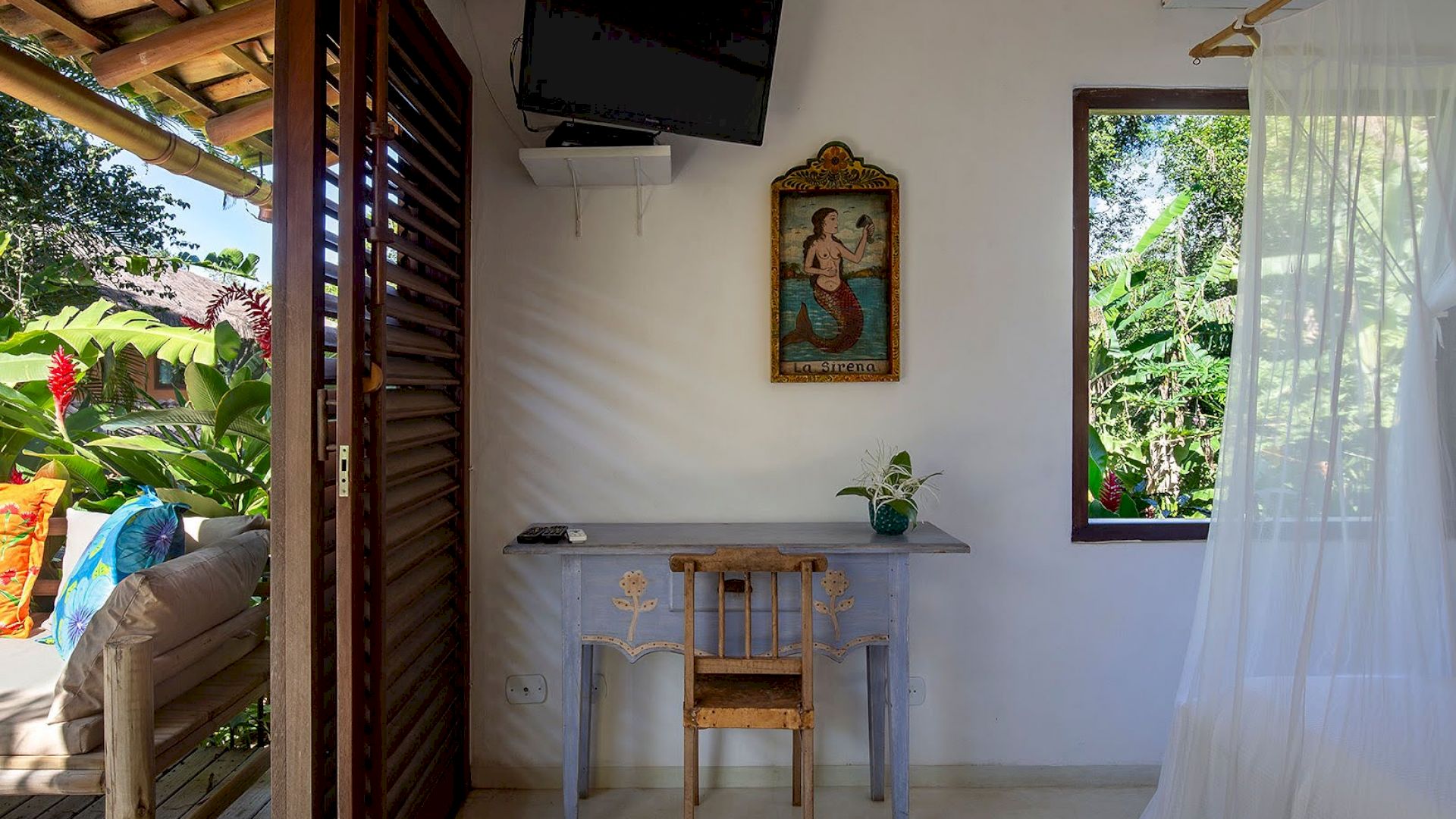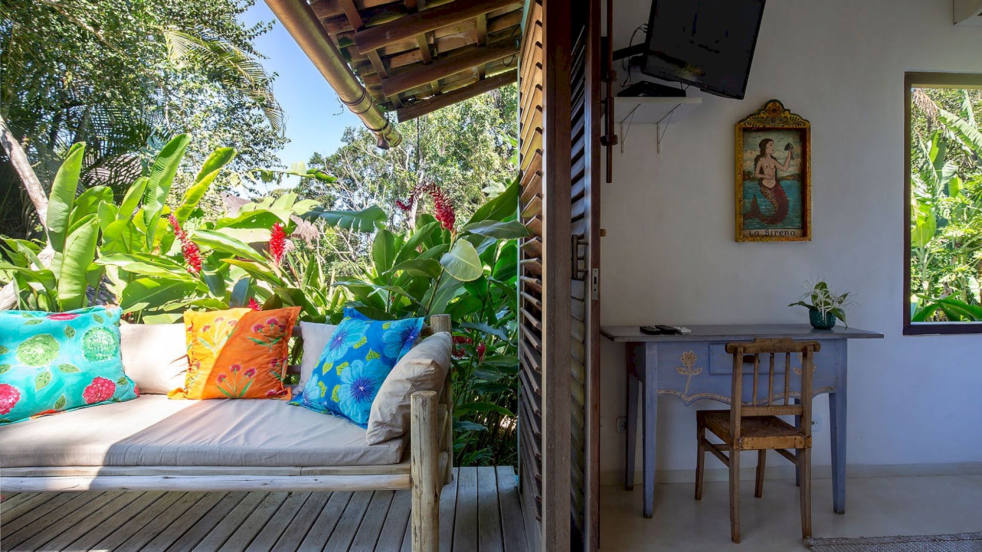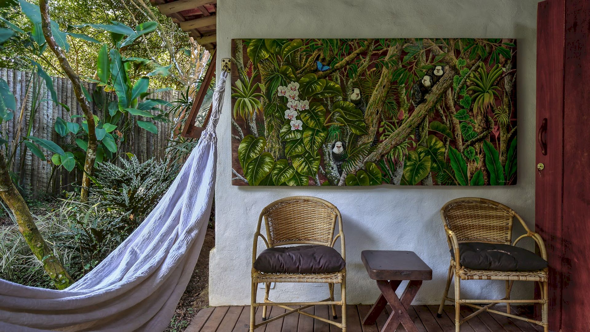 Além disso, a propriedade conta com um bangalô externo, que oferece uma experiência mais reservada. Este espaço dispõe de uma cama queen size, frigobar e TV, além de uma varanda equipada com sofá, mesa, cadeiras e uma rede, criando um ambiente confortável e tranquilo.