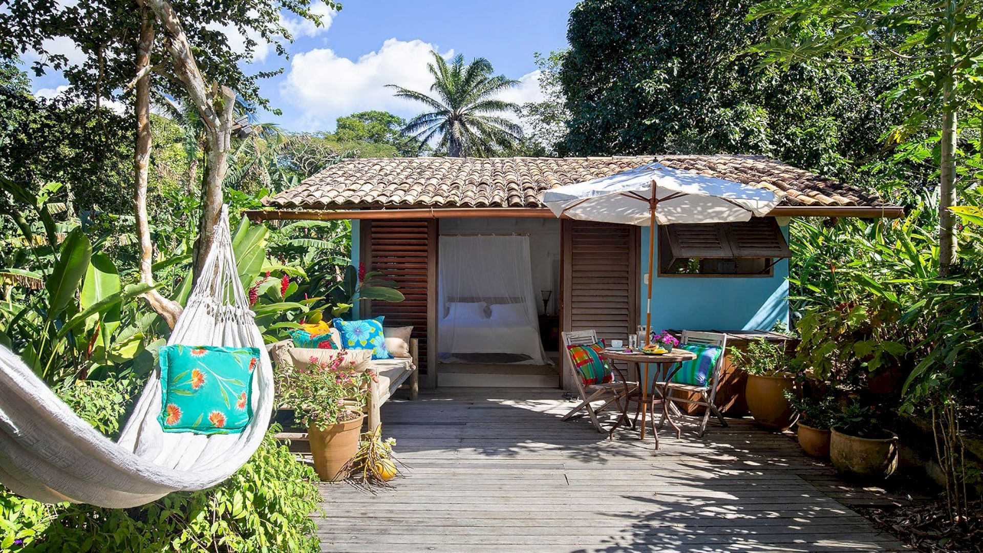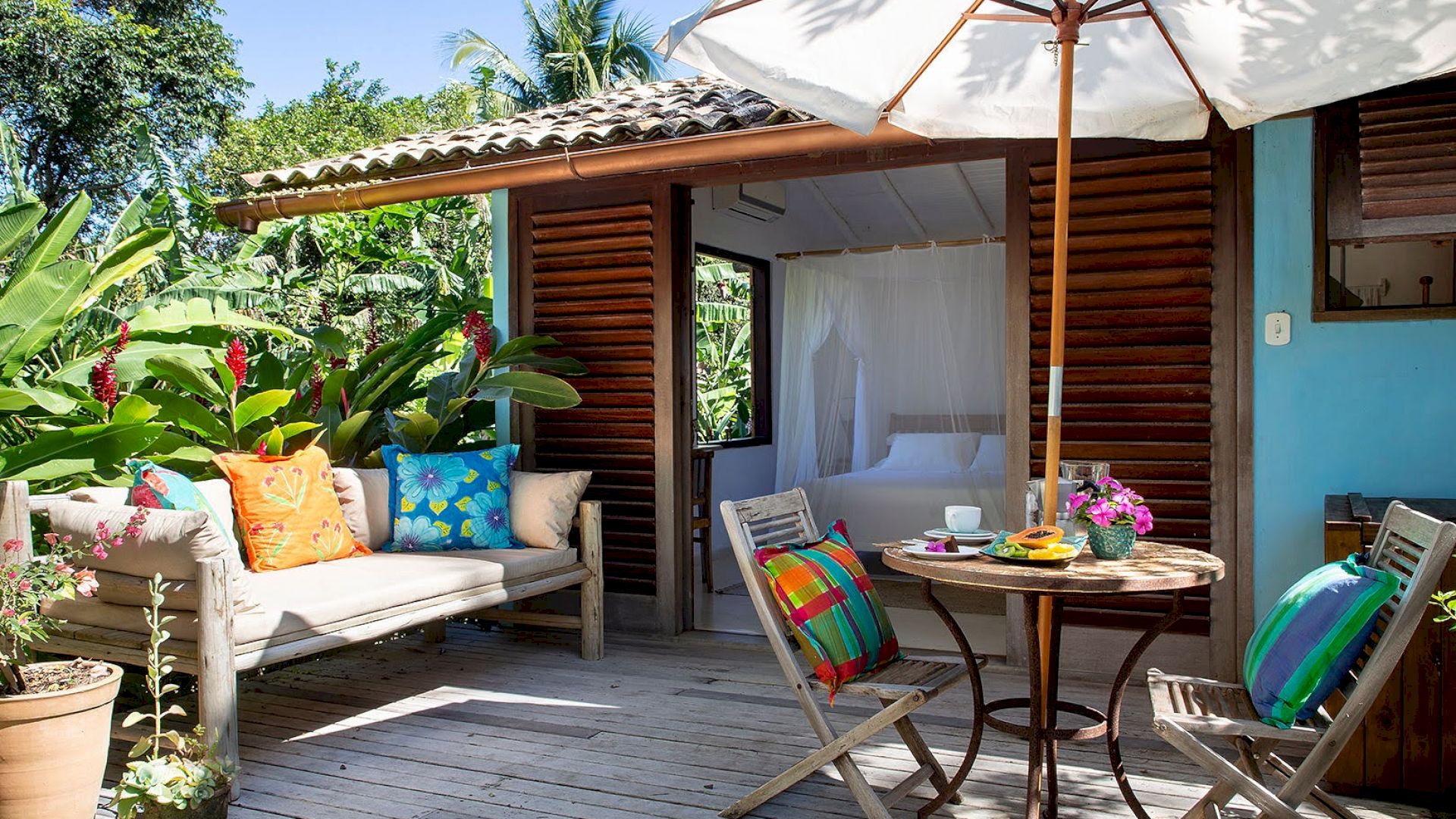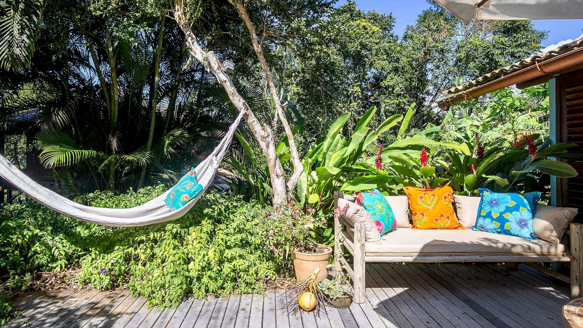 Além disso, a propriedade conta com um bangalô externo, que oferece uma experiência mais reservada. Este espaço dispõe de uma cama queen size, frigobar e TV, além de uma varanda equipada com sofá, mesa, cadeiras e uma rede, criando um ambiente confortável e tranquilo.