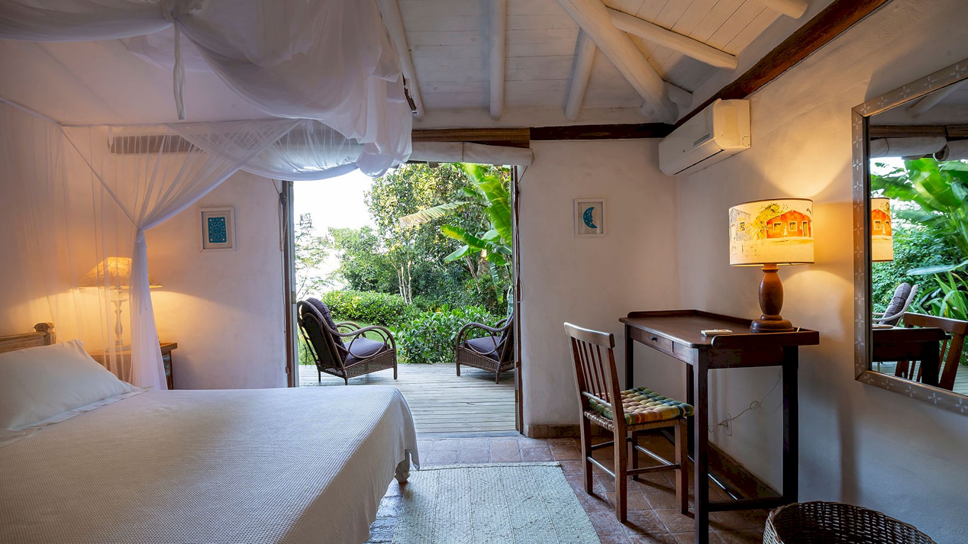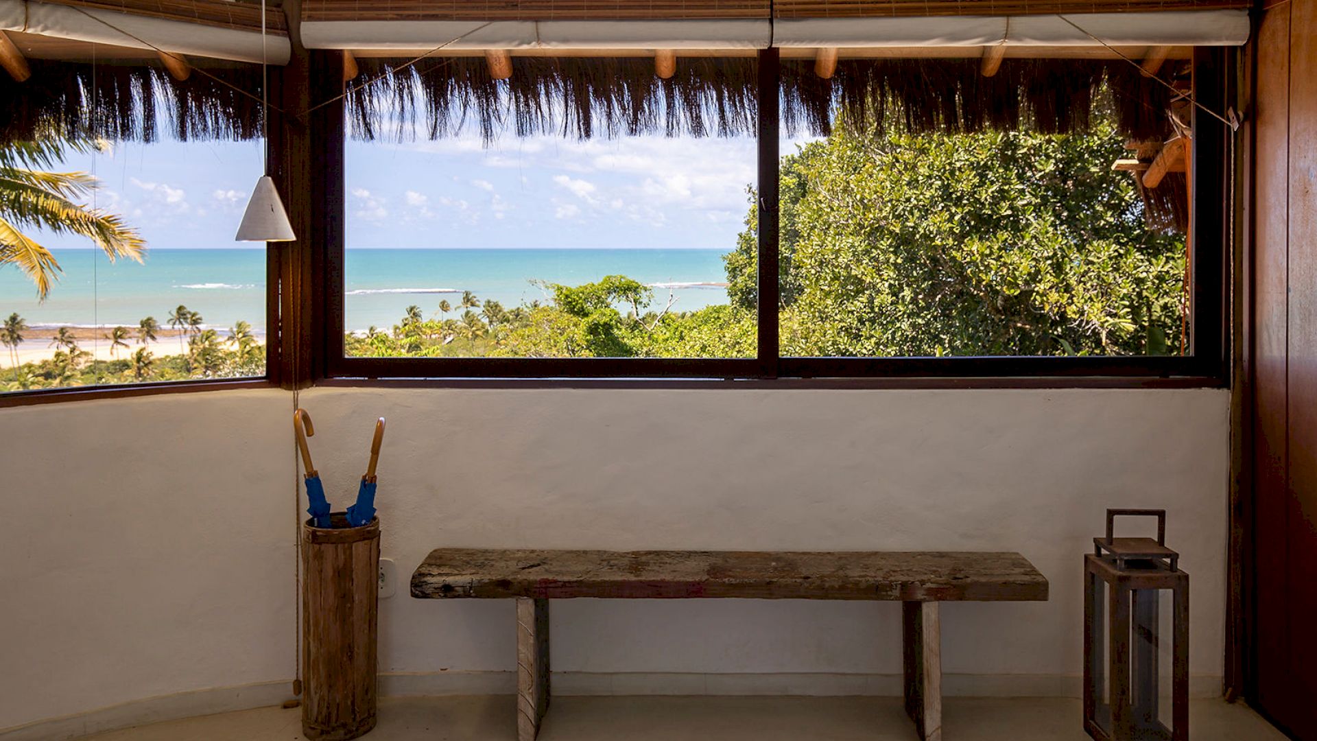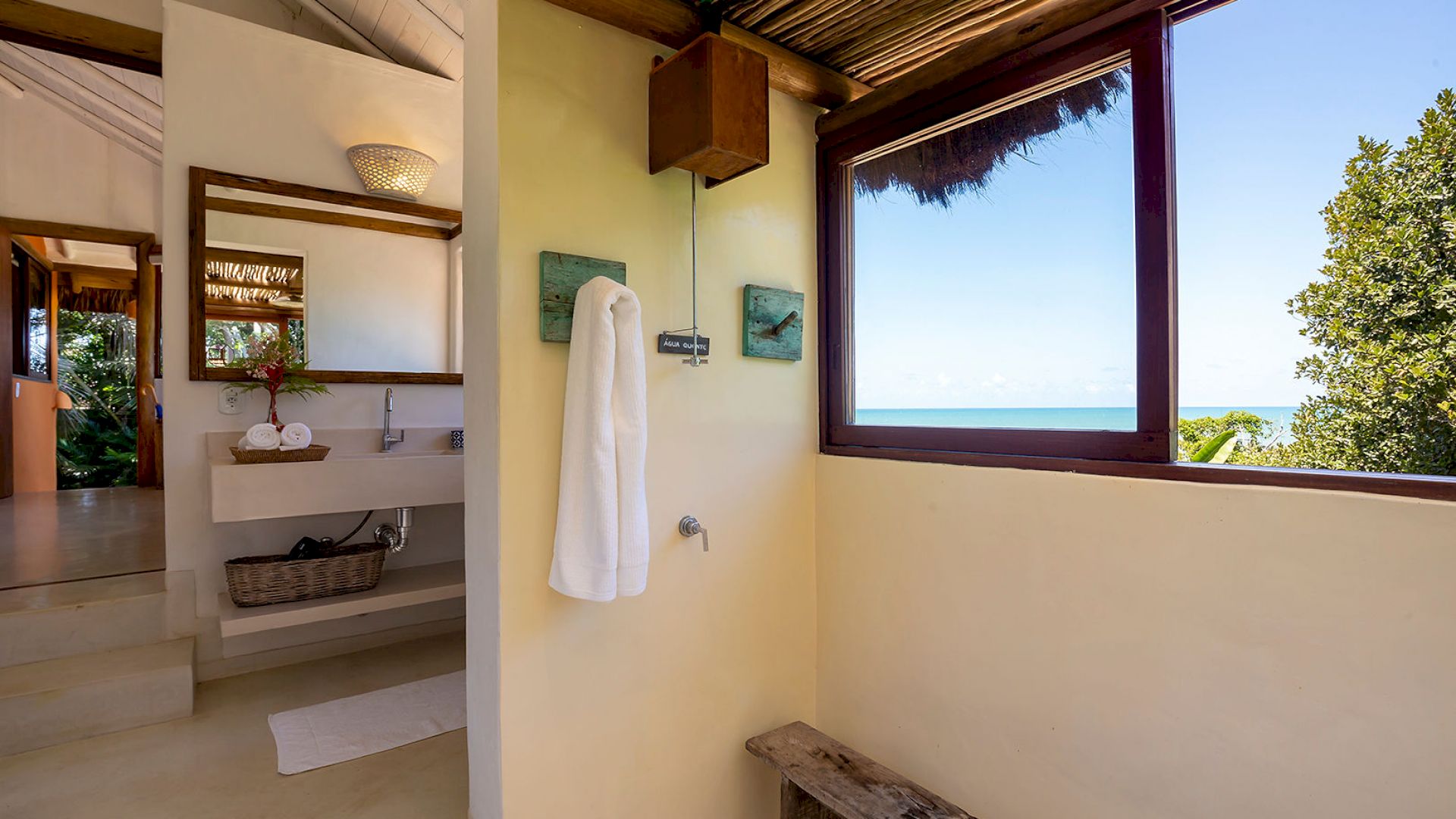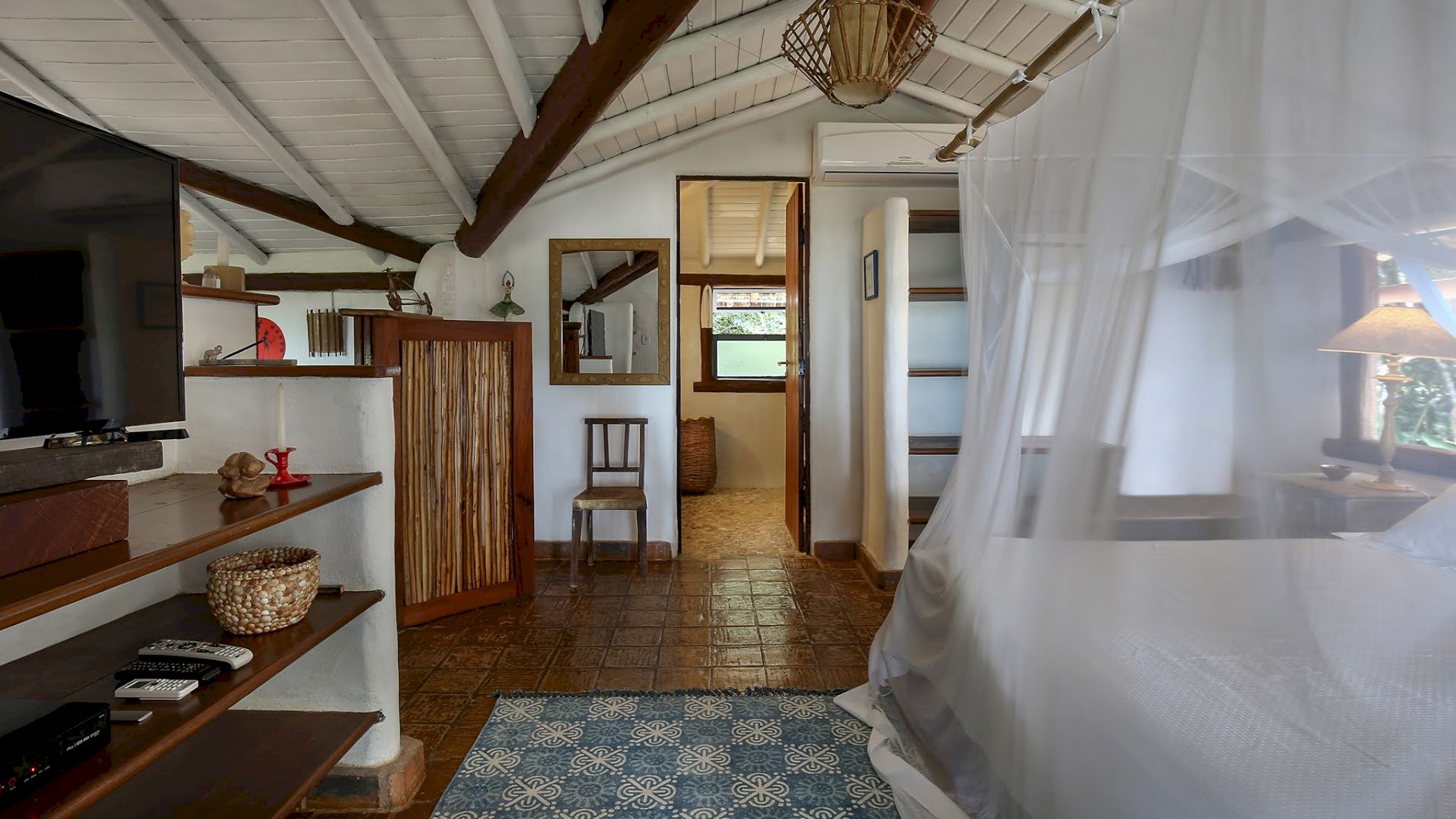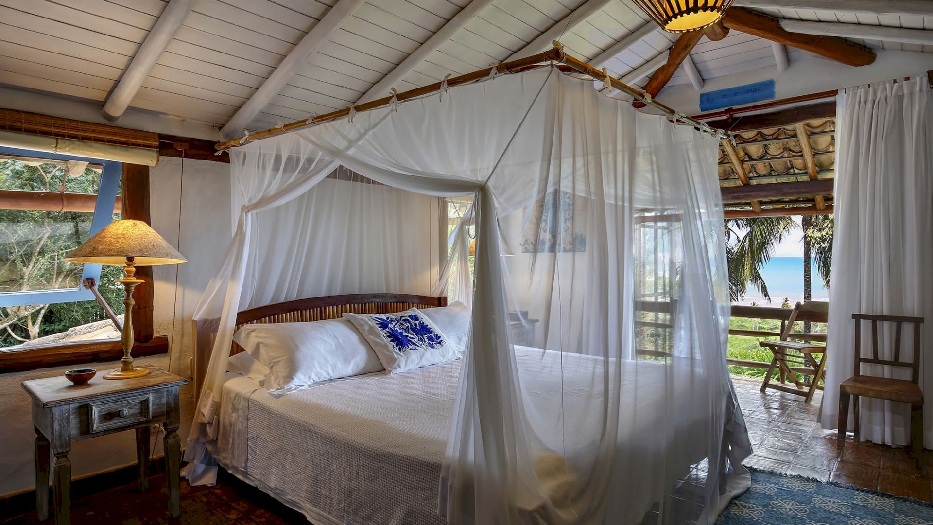 Na Casa Grande, a Suíte Superior, situada no andar superior, dispõe de uma cama king size, TV, closet e frigobar. Sua varanda privativa, com cadeiras confortáveis, oferece um espaço tranquilo para relaxar, apreciando a vista e a brisa do mar. Outra suíte, com vista para o mar, conta com uma cama queen size, closet e uma varanda com rede, ideal para desfrutar do cenário deslumbrante do oceano. Já a terceira suíte, com vista para o jardim, possui uma cama queen size, armário e uma varanda equipada com rede e cadeiras, criando um ambiente acolhedor em meio à natureza.