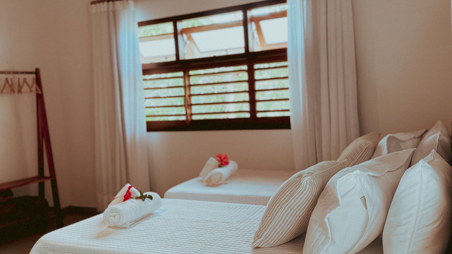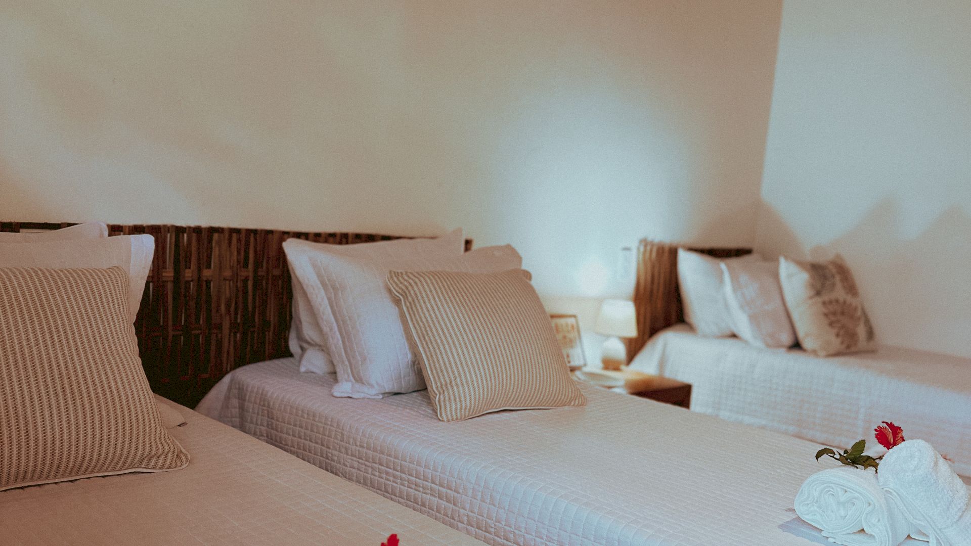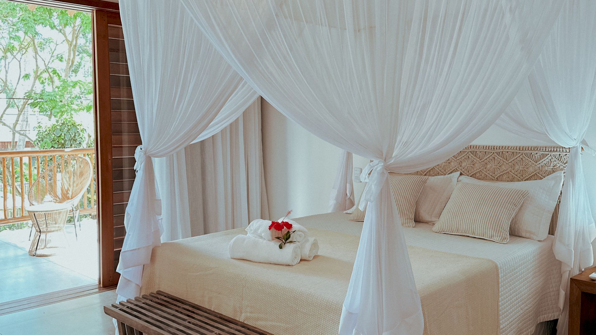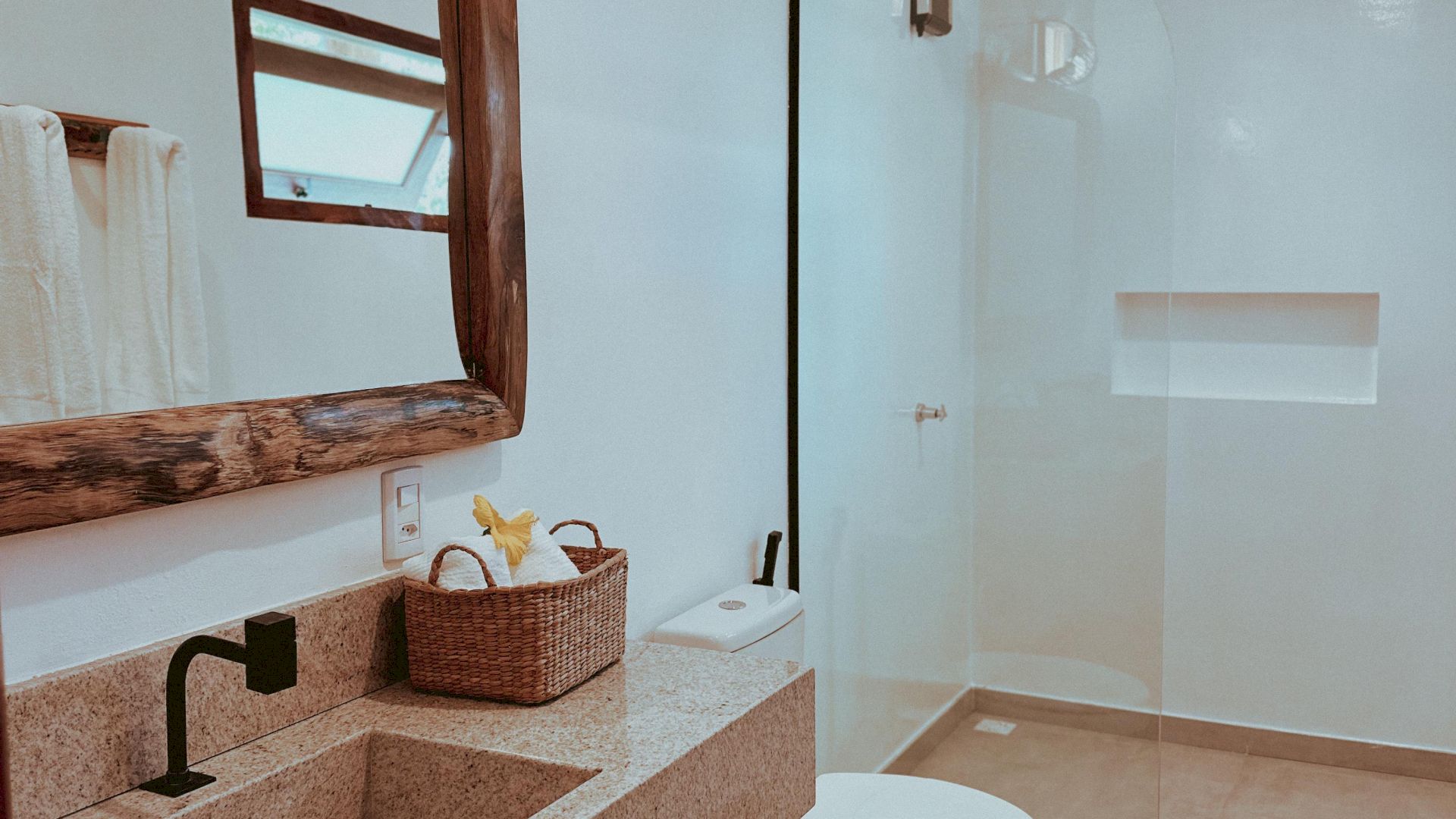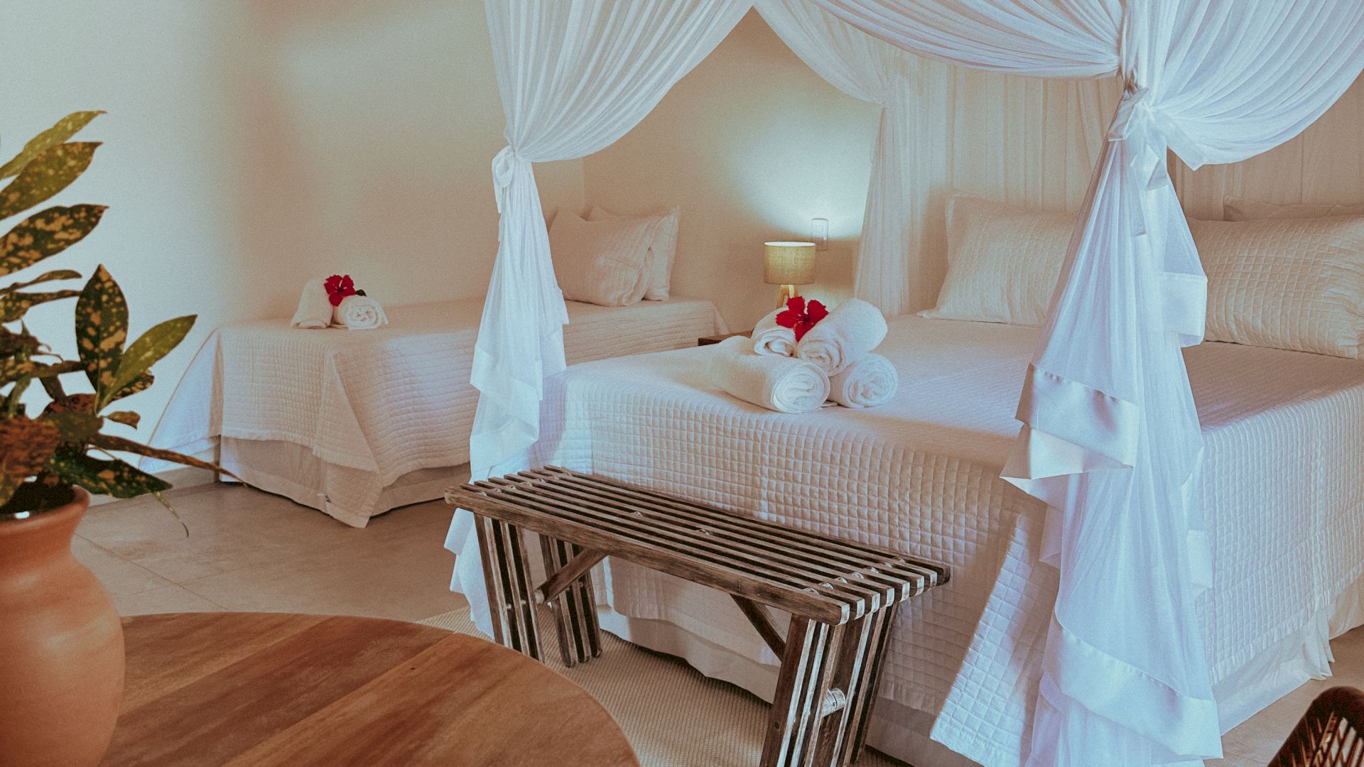 A Villa Coqueiral 10 se estende por um terreno de 1150 m², com uma área construída de 550 m², acomodando confortavelmente até 15 hóspedes. A casa dispõe de cinco suítes amplas, distribuídas entre o térreo e o pavimento superior. No térreo, encontram-se duas suítes, ambas equipadas com camas versáteis, sendo que uma delas oferece uma varanda privativa com vista para a mata, proporcionando um ambiente sereno e relaxante. No pavimento superior, as outras três suítes são igualmente impressionantes, com destaque para a suíte master, que conta com um charmoso banheiro com dois chuveiros, sendo um externo, coberto com seixos.