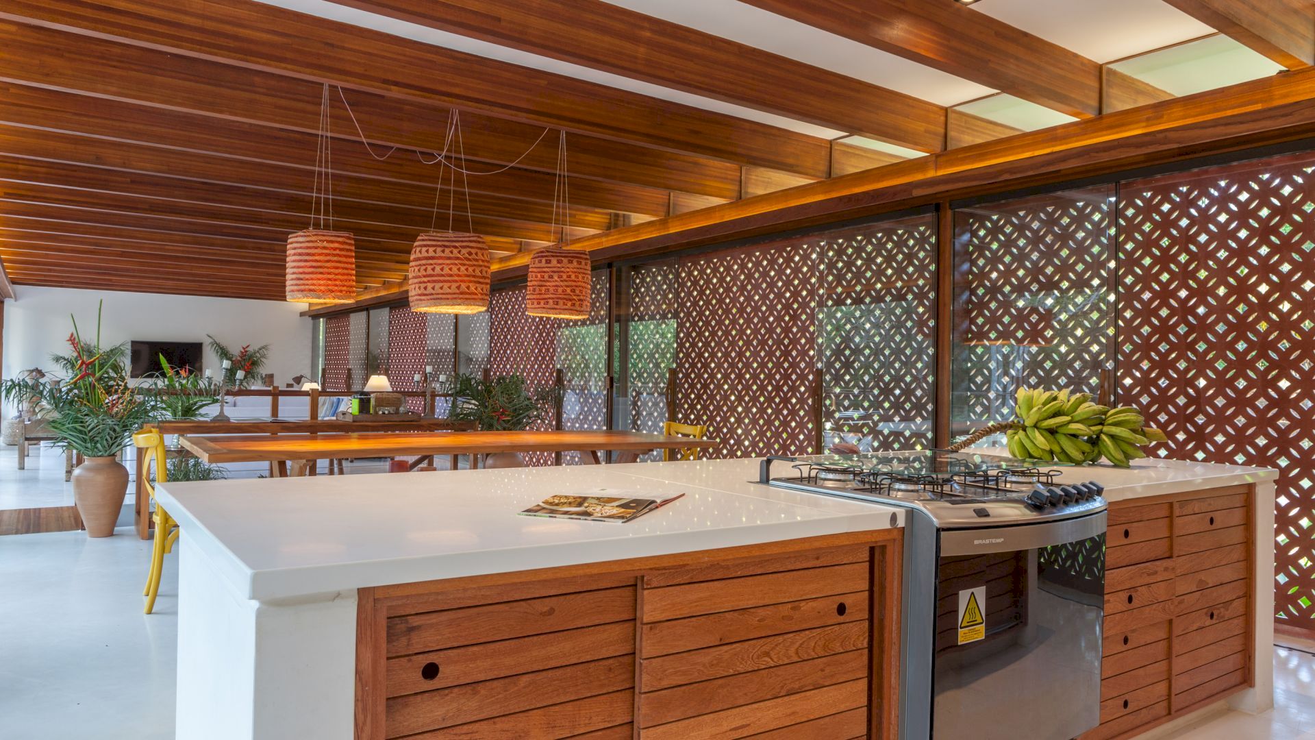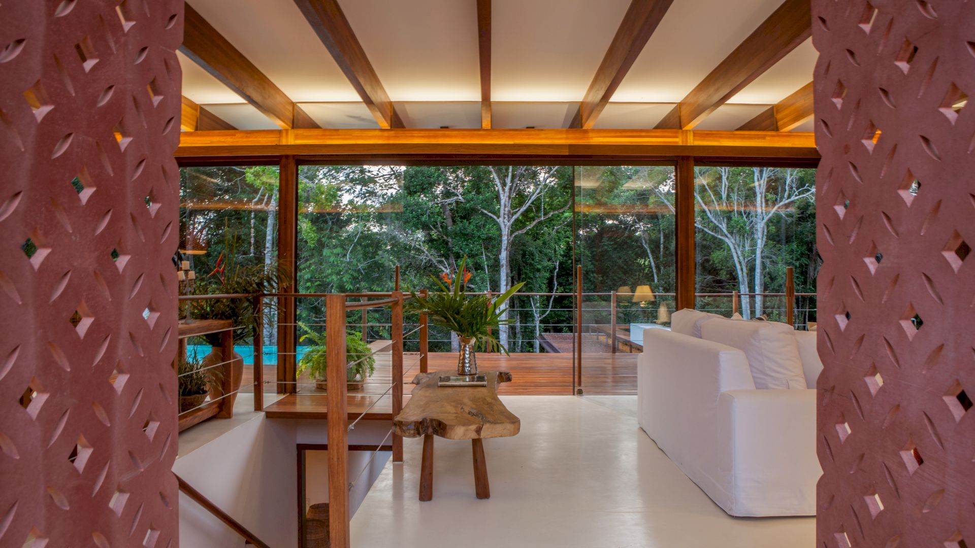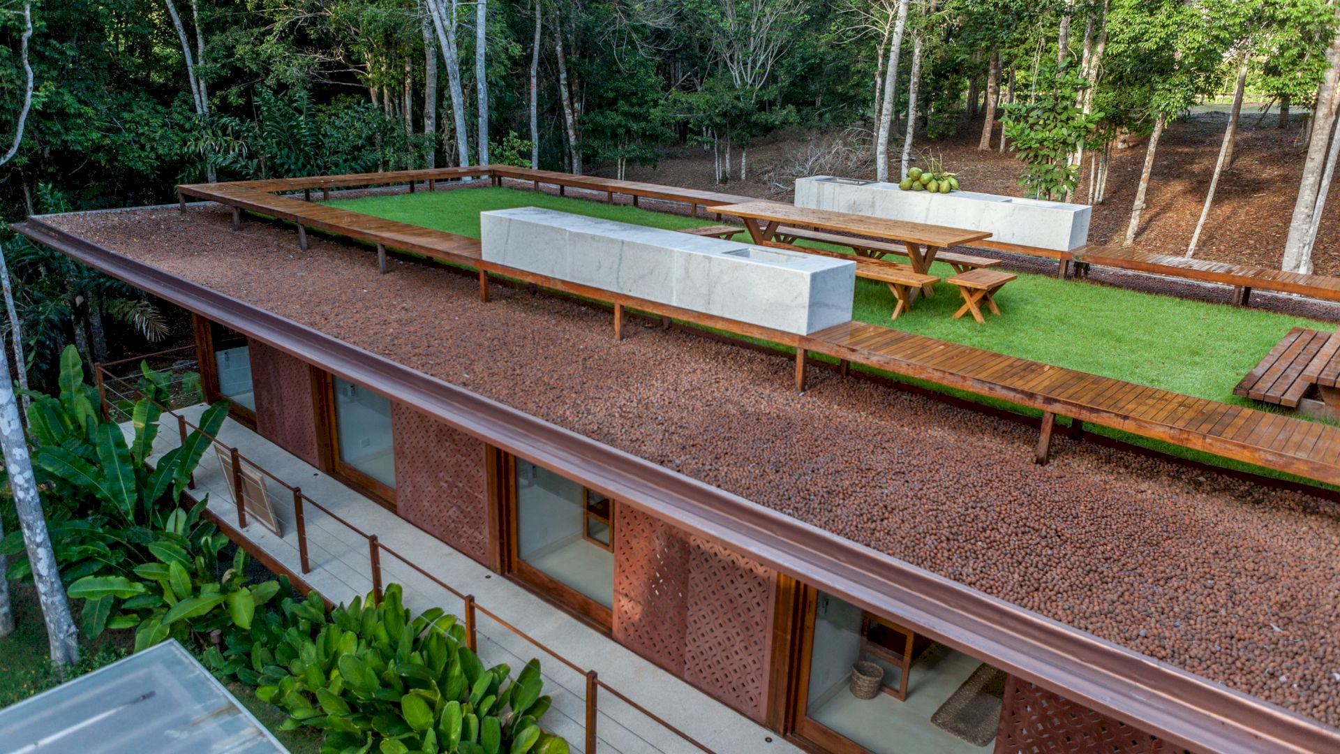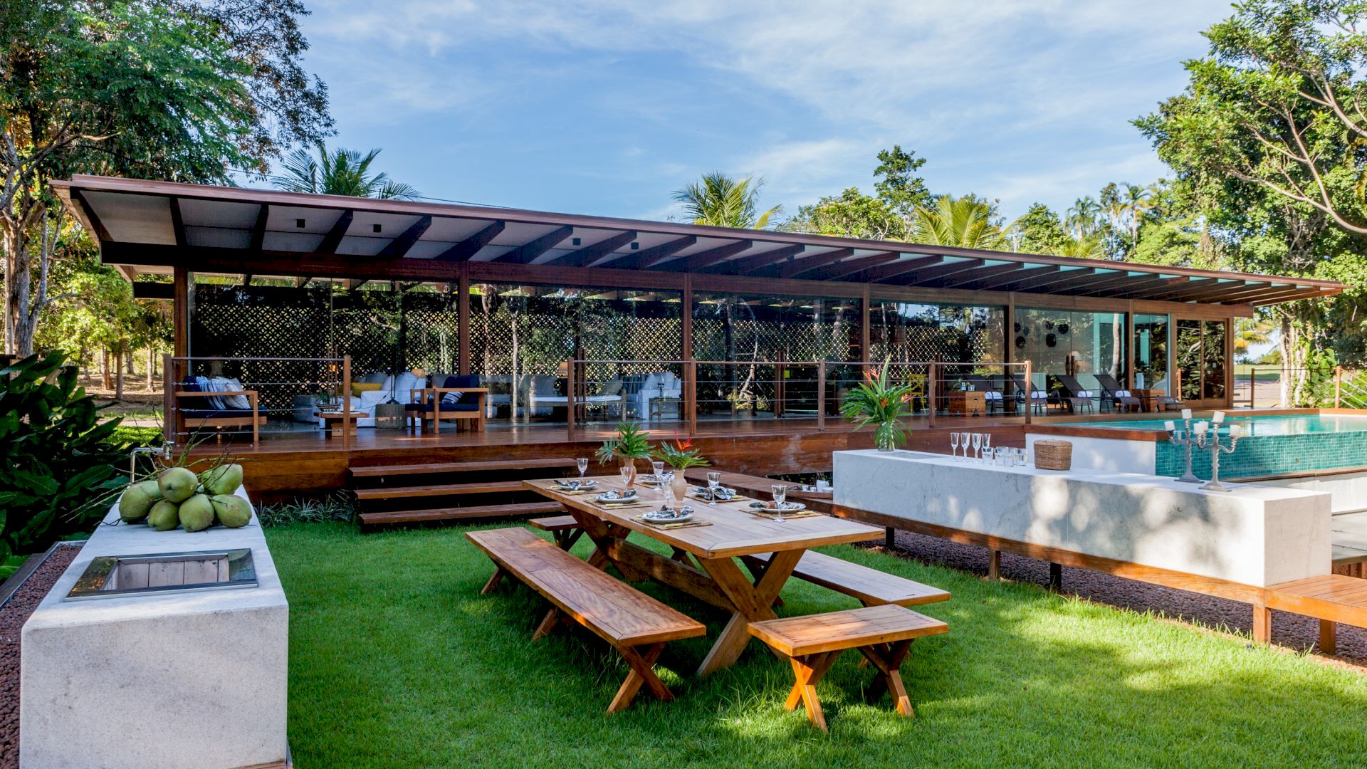 No bloco principal fica a parte social da casa. Piscina de borda infinita com vista para a copa das árvores, além de uma sauna seca de frente para a mata nativa. Os telhados da casa foram transformados em jardim. O do bloco principal proporciona vista para o mar da Praia dos Coqueiros e é perfeito para um luau. Já o telhado dos quartos circundado por um banco de madeira é uma área deliciosa para refeições ao ar livre com churrasqueira, pia e apoios para serviço e bebidas, tudo isso tendo a mata como cenário.