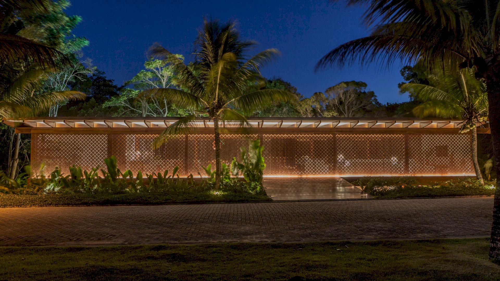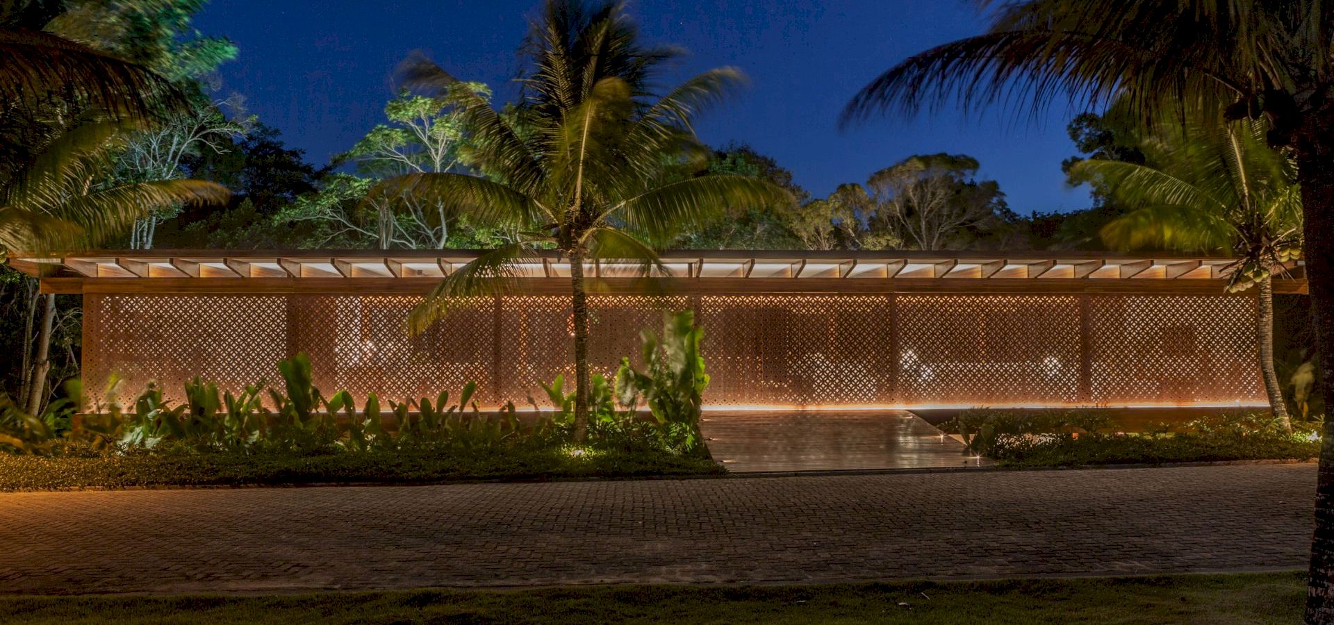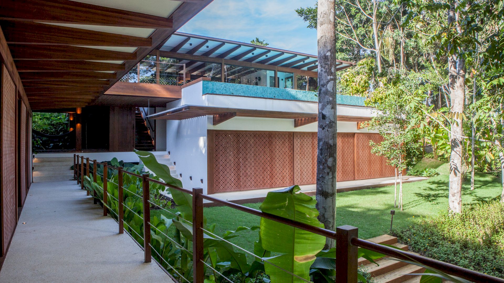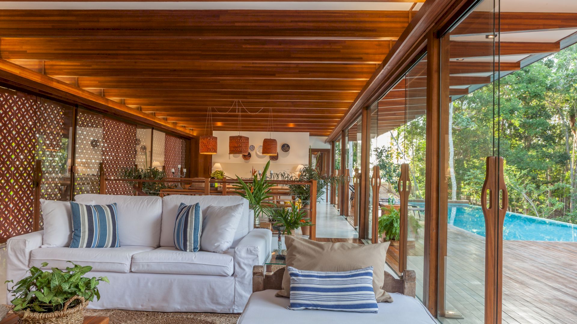 No bloco principal fica a parte social da casa. Piscina de borda infinita com vista para a copa das árvores, além de uma sauna seca de frente para a mata nativa. Os telhados da casa foram transformados em jardim. O do bloco principal proporciona vista para o mar da Praia dos Coqueiros e é perfeito para um luau. Já o telhado dos quartos circundado por um banco de madeira é uma área deliciosa para refeições ao ar livre com churrasqueira, pia e apoios para serviço e bebidas, tudo isso tendo a mata como cenário.