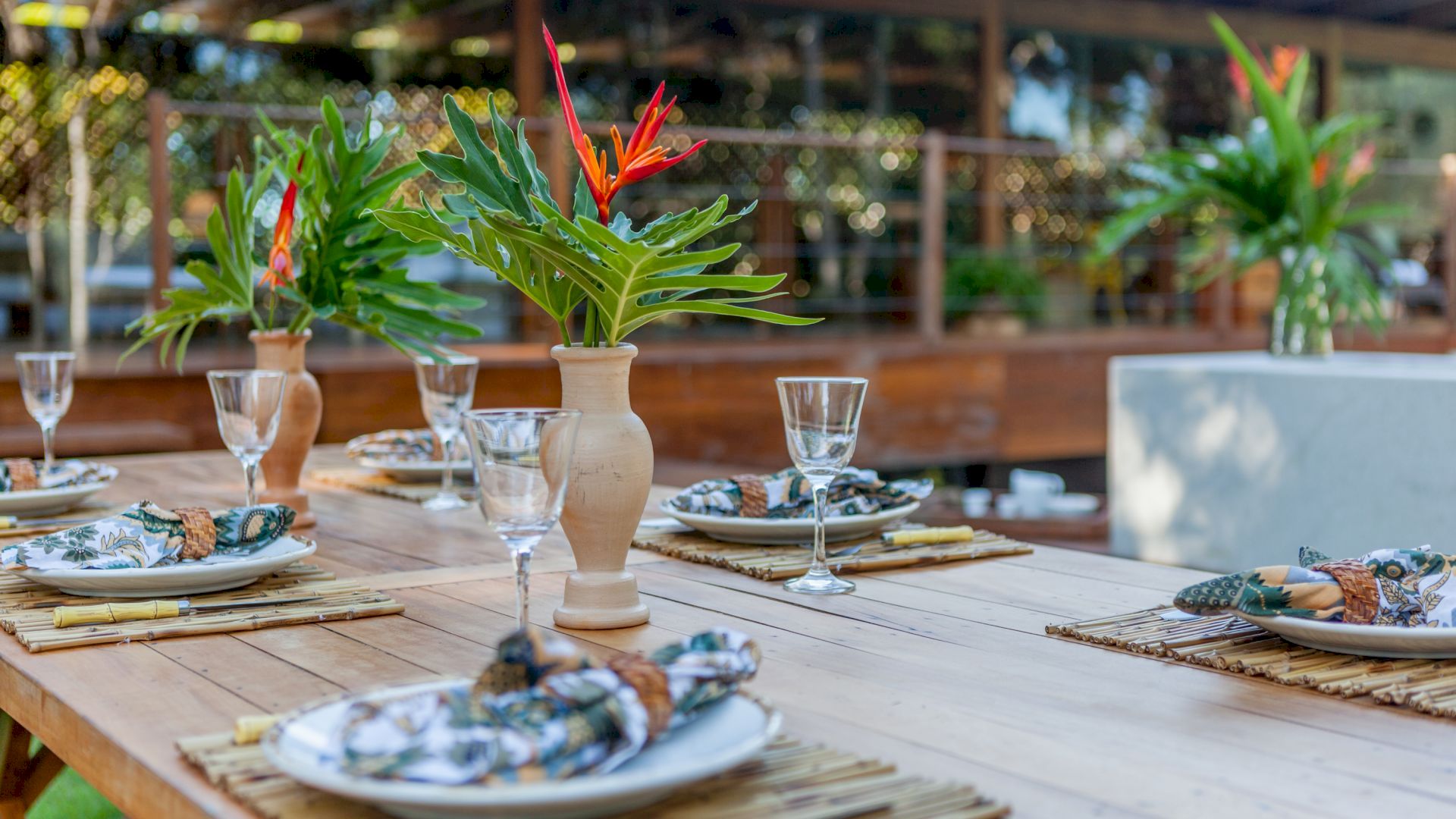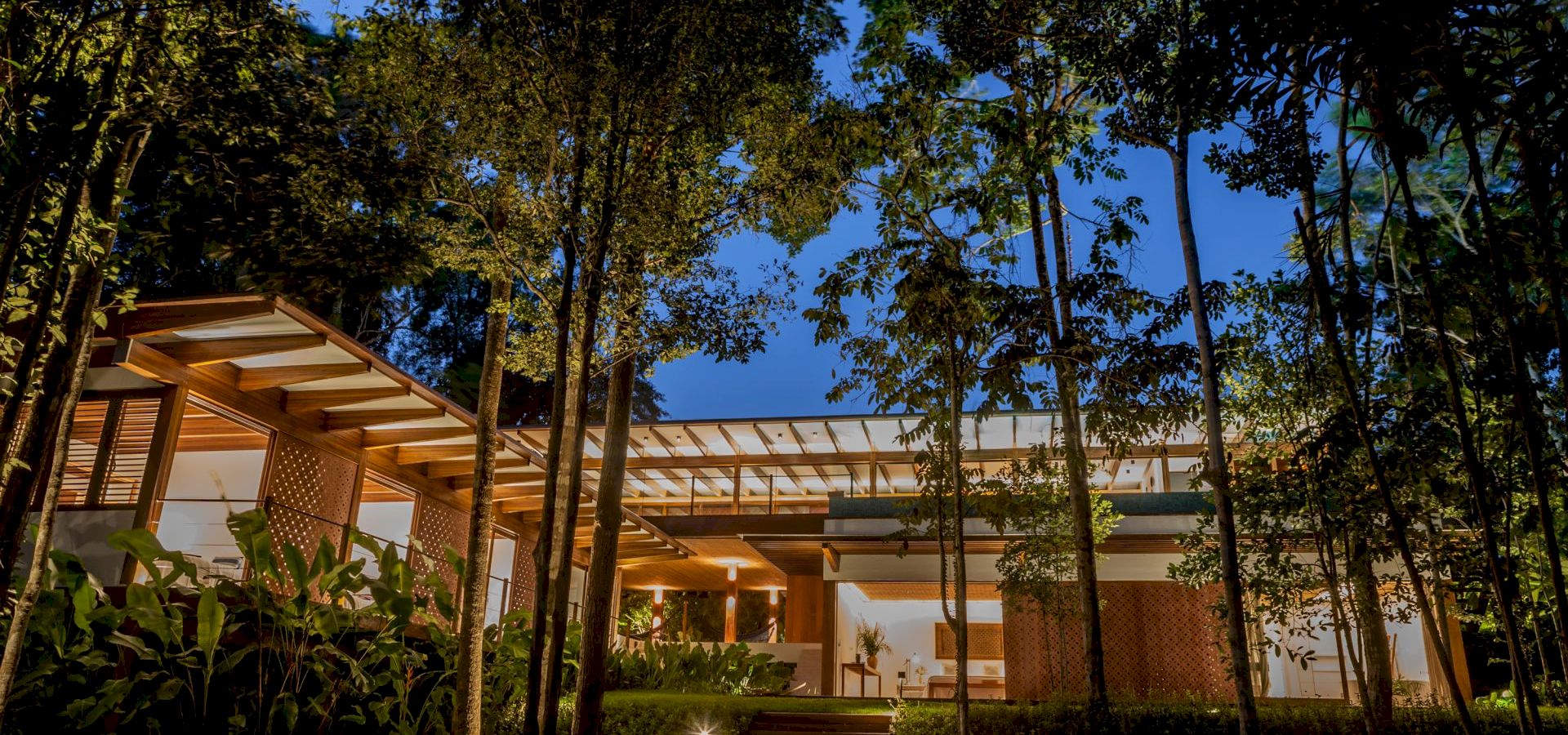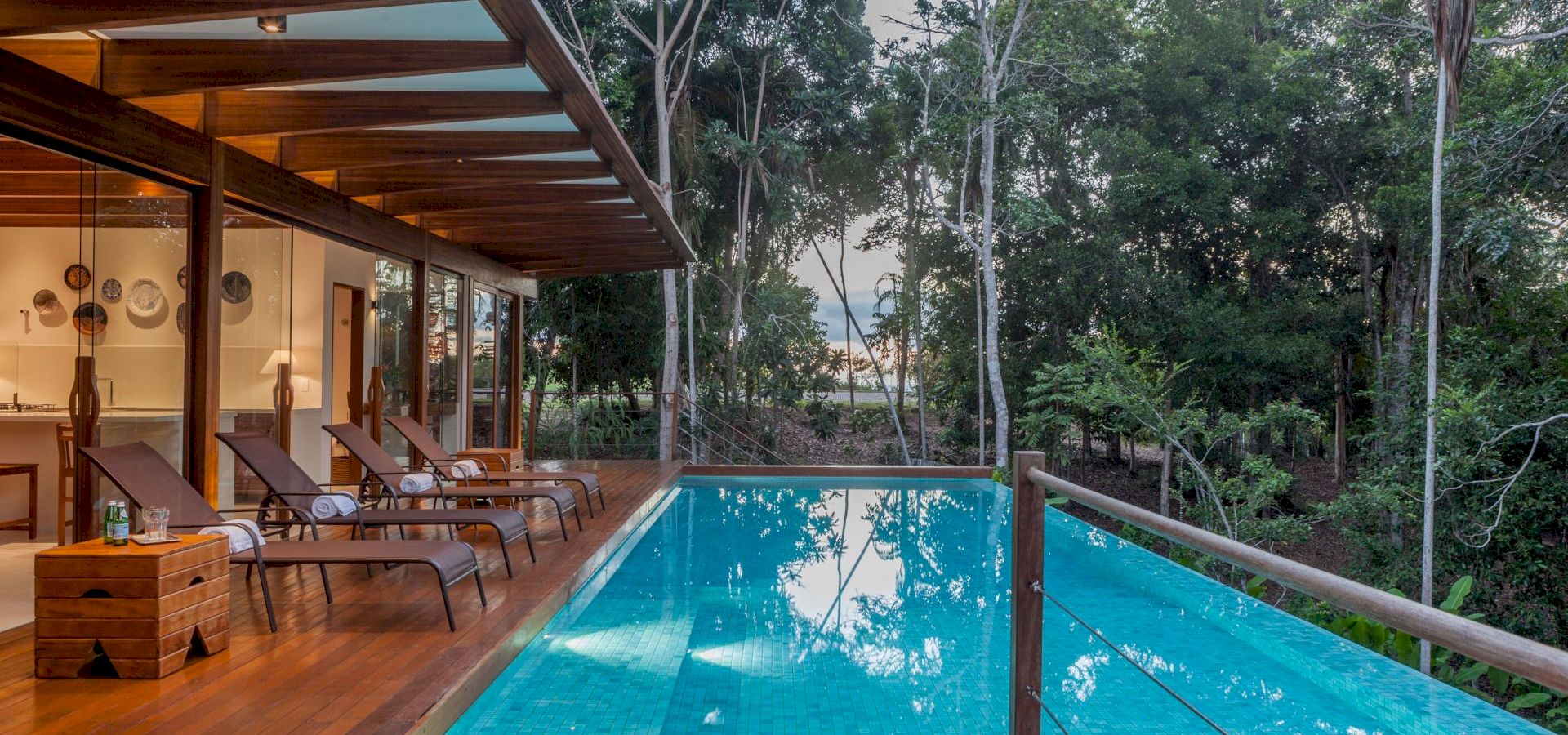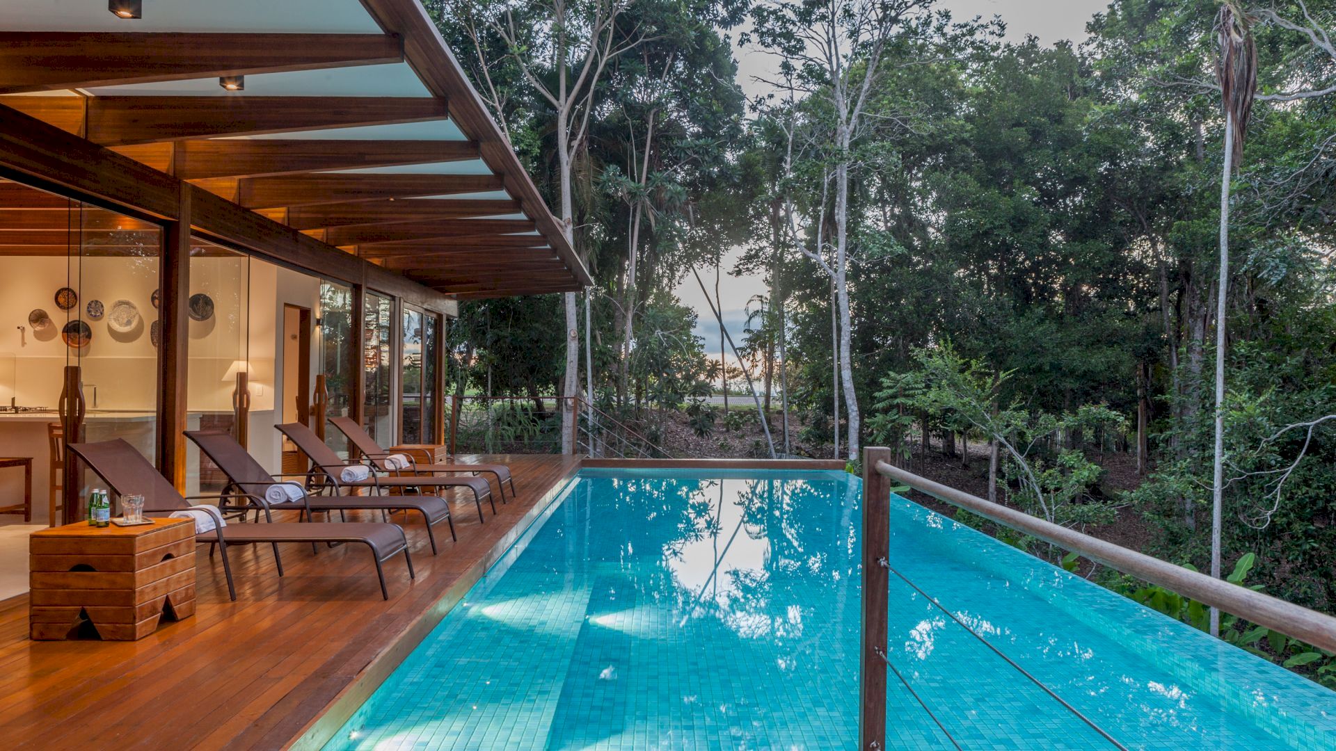 No bloco principal fica a parte social da casa. Piscina de borda infinita com vista para a copa das árvores, além de uma sauna seca de frente para a mata nativa. Os telhados da casa foram transformados em jardim. O do bloco principal proporciona vista para o mar da Praia dos Coqueiros e é perfeito para um luau. Já o telhado dos quartos circundado por um banco de madeira é uma área deliciosa para refeições ao ar livre com churrasqueira, pia e apoios para serviço e bebidas, tudo isso tendo a mata como cenário.