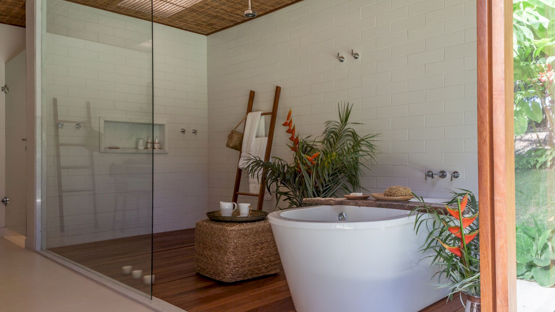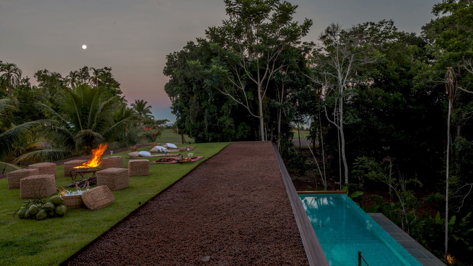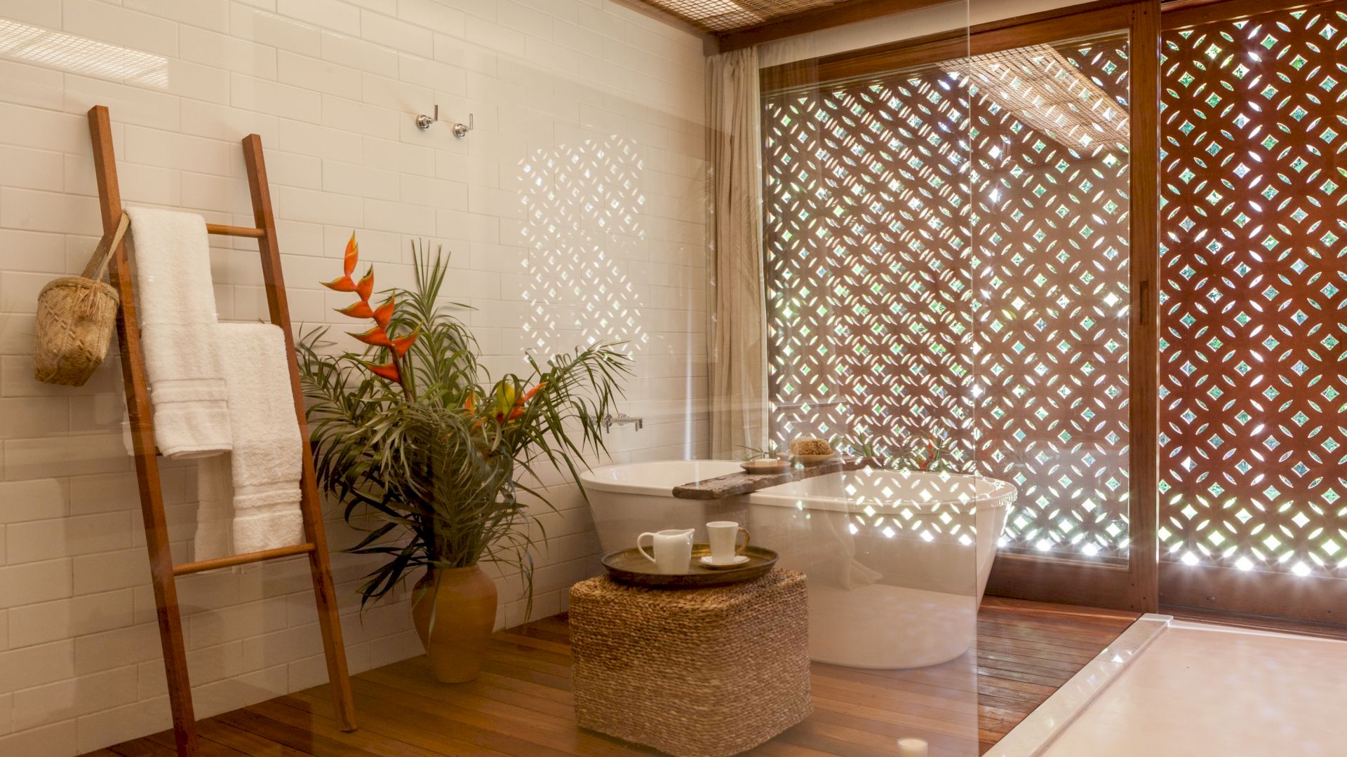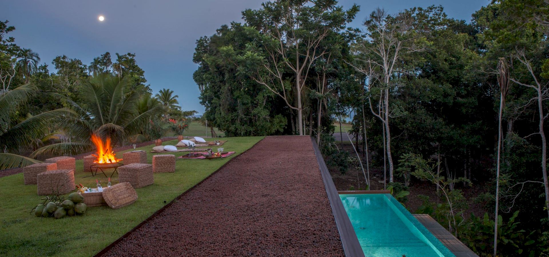 No bloco principal fica a parte social da casa. Piscina de borda infinita com vista para a copa das árvores, além de uma sauna seca de frente para a mata nativa. Os telhados da casa foram transformados em jardim. O do bloco principal proporciona vista para o mar da Praia dos Coqueiros e é perfeito para um luau. Já o telhado dos quartos circundado por um banco de madeira é uma área deliciosa para refeições ao ar livre com churrasqueira, pia e apoios para serviço e bebidas, tudo isso tendo a mata como cenário.