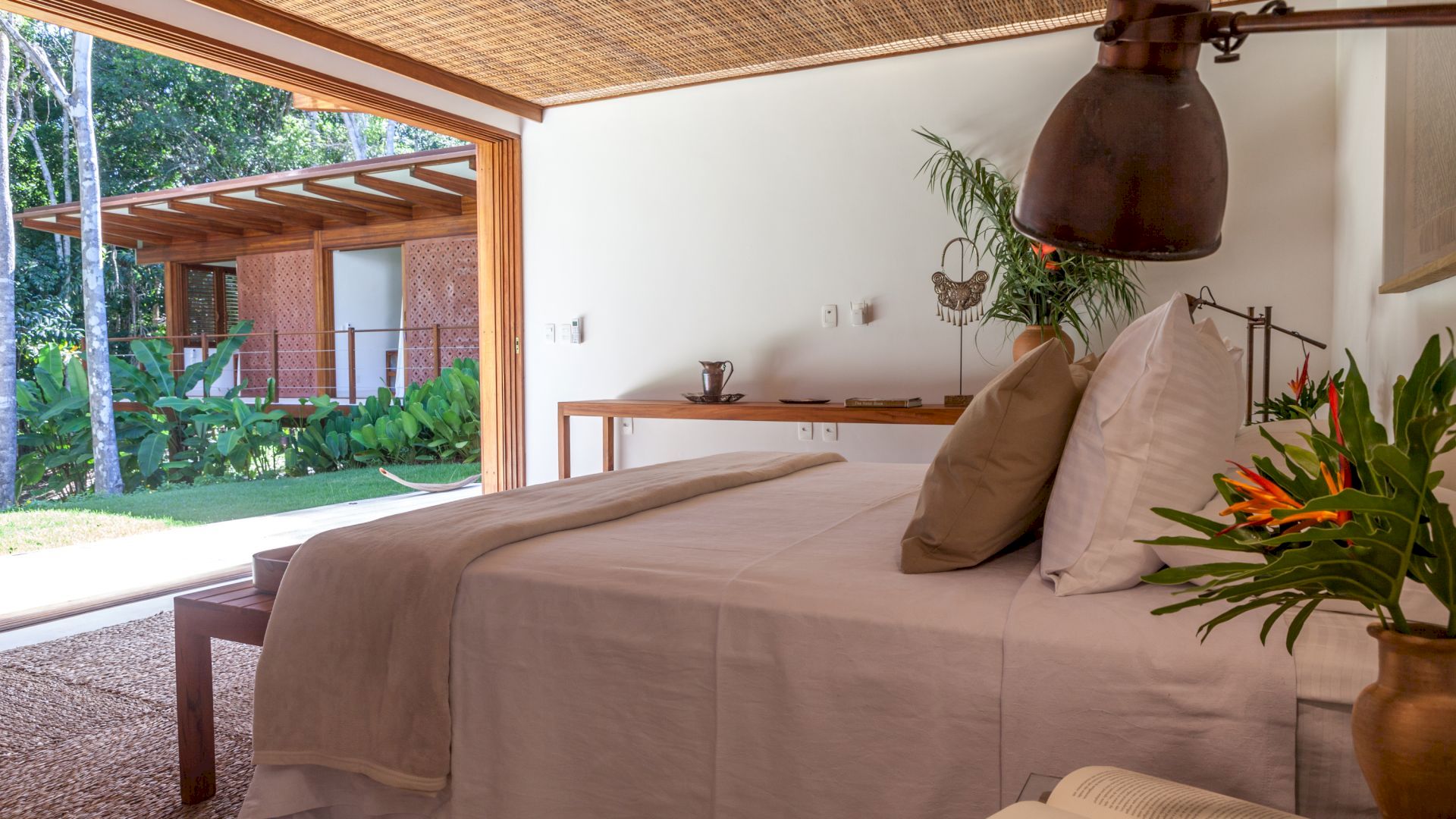 No outro bloco ficam localizadas as suítes, todas com vista para o jardim e para a mata com exceção de uma suíte que fica localizada ao lado do redário.
