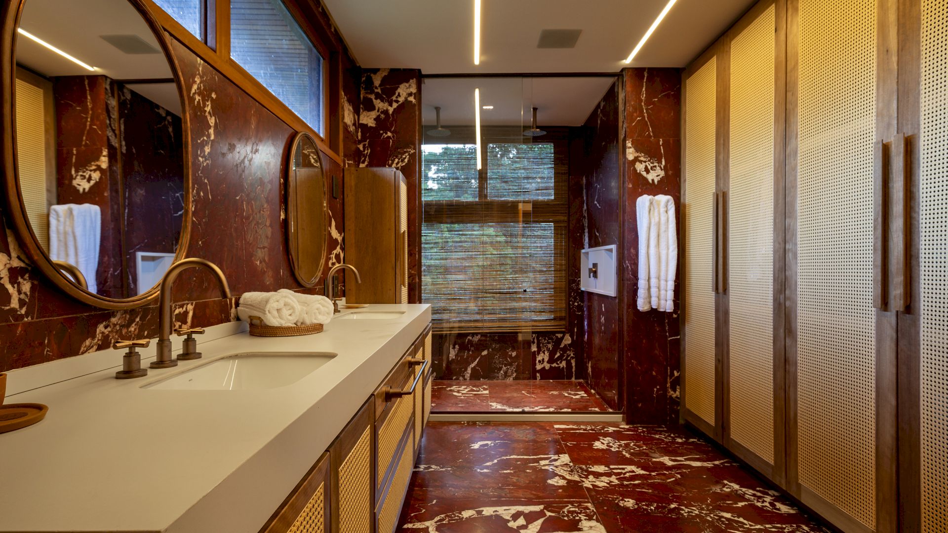 A casa conta com 4 suítes, incluindo uma suíte master com design contemporâneo. Todas as suítes são pensadas para garantir conforto e privacidade, com grandes janelas que proporcionam luz natural e vistas para a paisagem. A propriedade ainda possui um quarto adicional para funcionários e 6 banheiros bem equipados.
