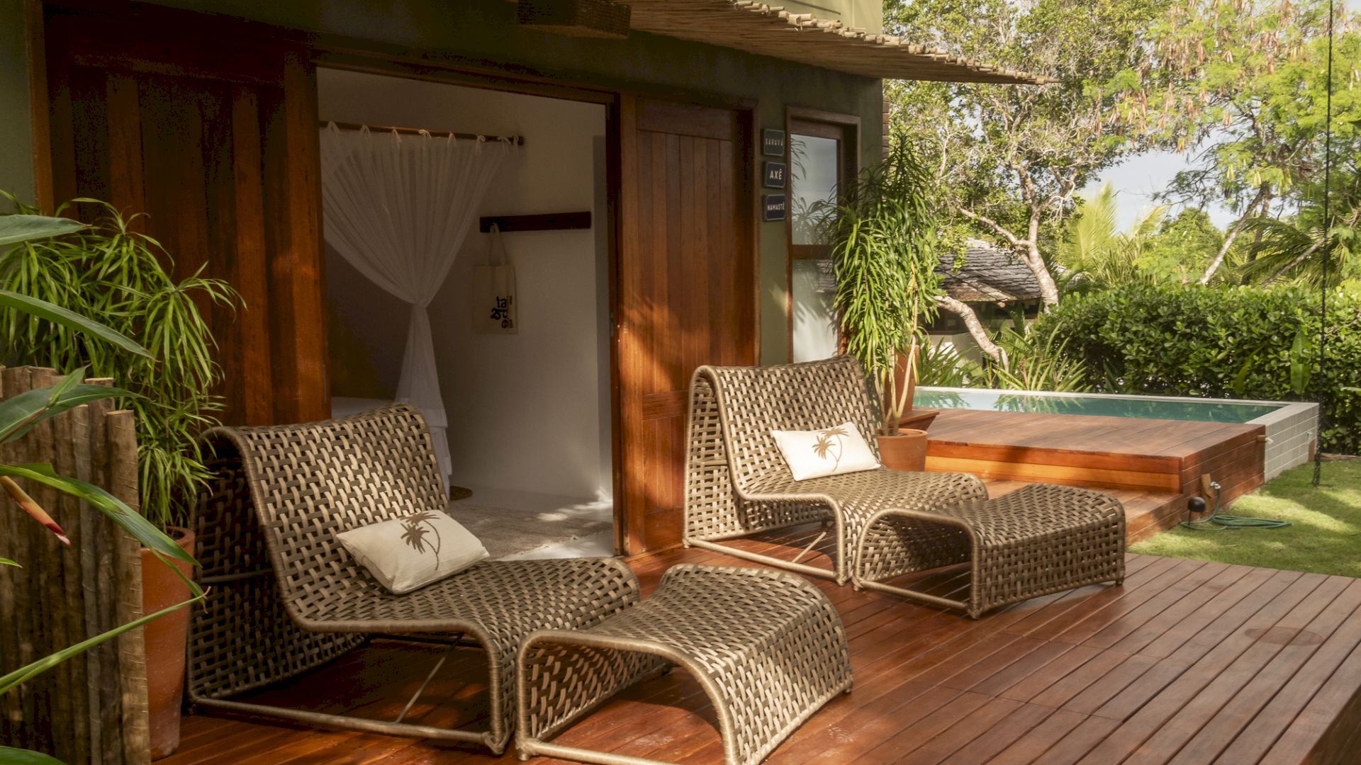 A área externa conta com piscina privativa, cercada por espaços de relaxamento que se integram ao paisagismo tropical característico da região.