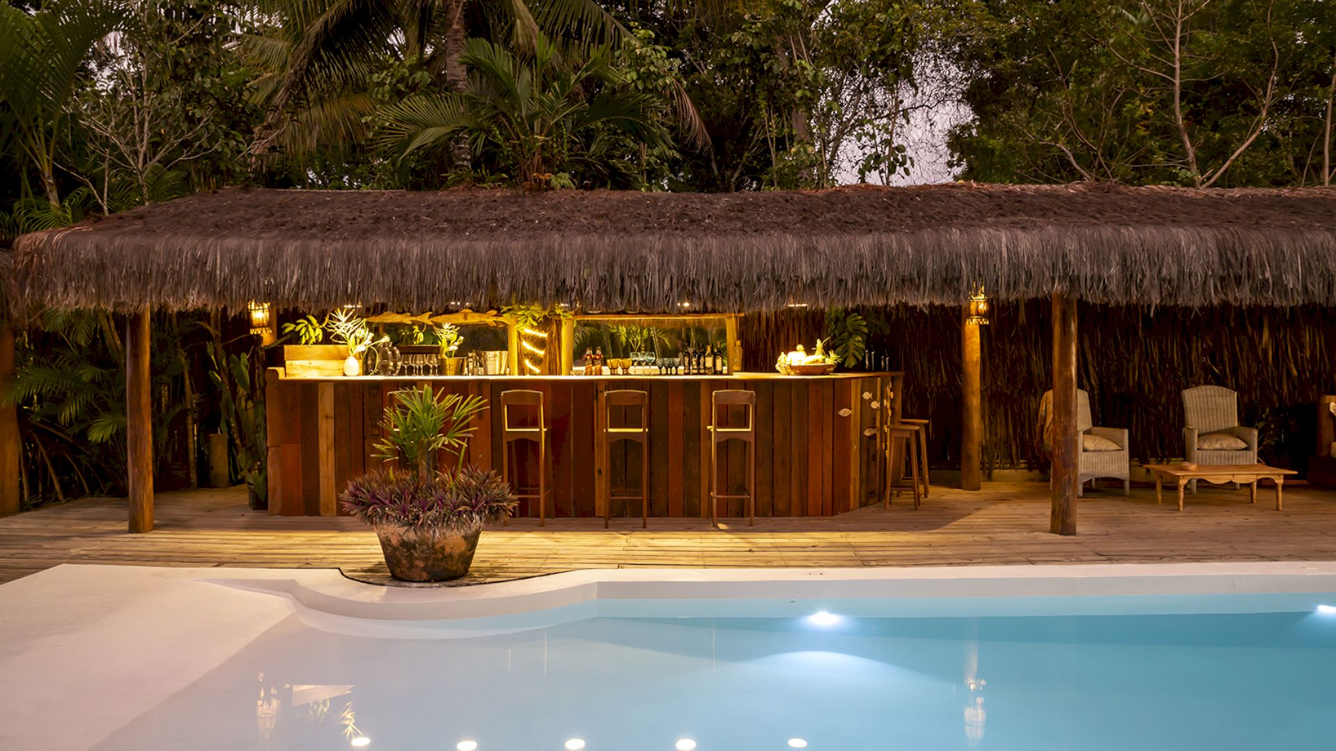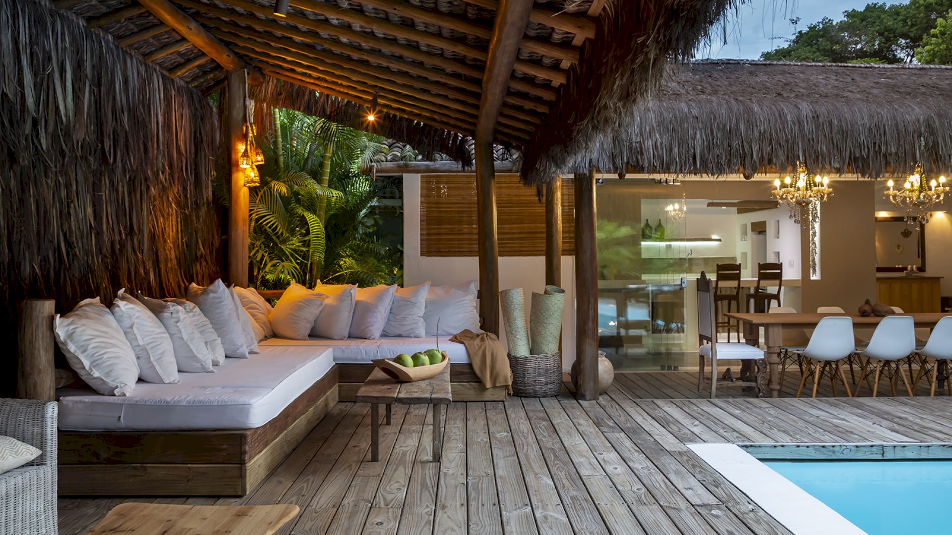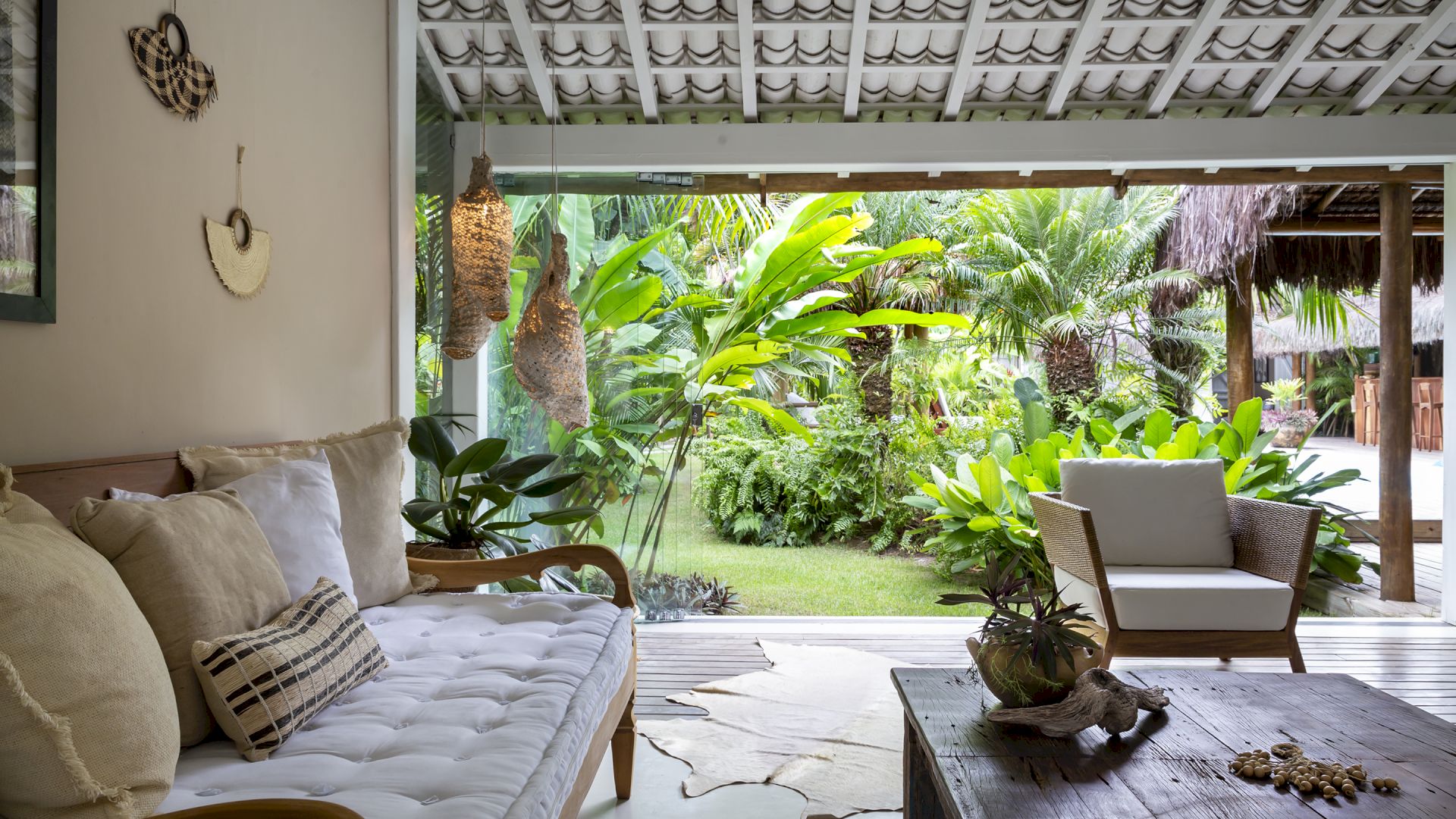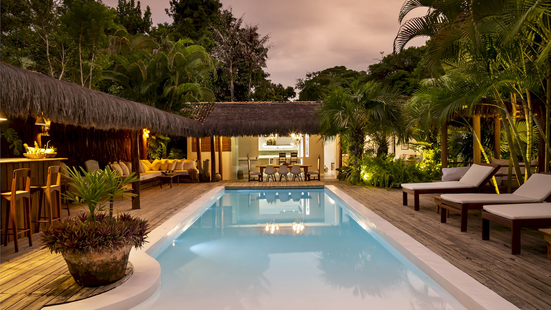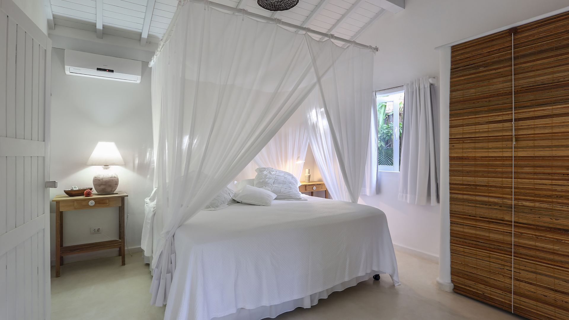 A casa é rodeada por um riquíssimo paisagismo tropical contendo 4 suítes que acomodam até 8 hóspedes confortavelmente. Todas as suítes são equipadas com cama Queen-size, ar condicionado, varanda individual com rede para descanso.